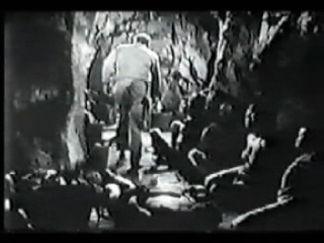 While trying to save the local villagers from evil diamond smugglers, Bomba the Jungle Boy is captured. Luckily, his pet monkey saves the day by untying him. Any similarity to the Tarzan movie series is completely intentional. (Thanks go to Aussie Ropeman for providing the video for this scene.)