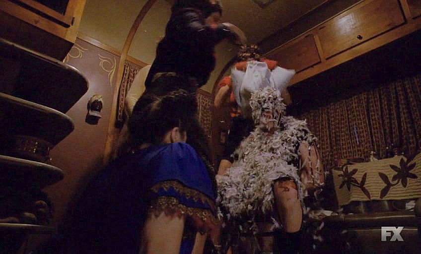 Desiree and her squad tie up Penny's father and tar and feather him.