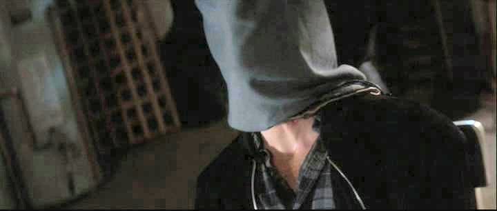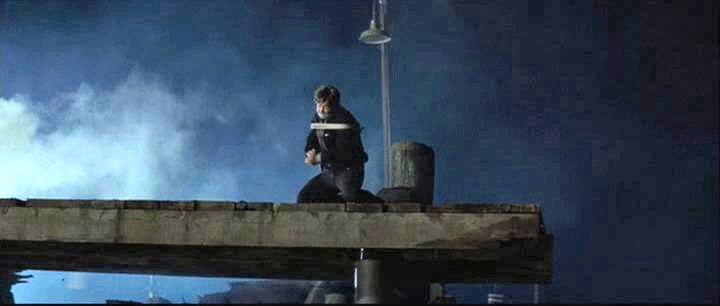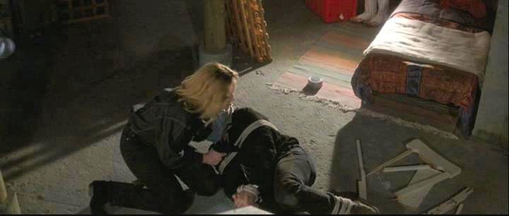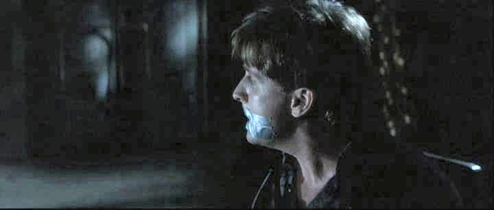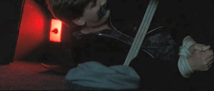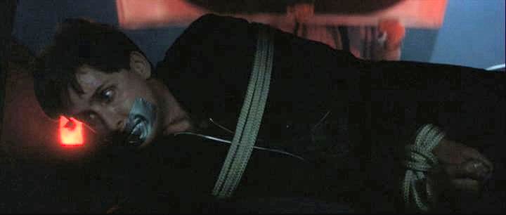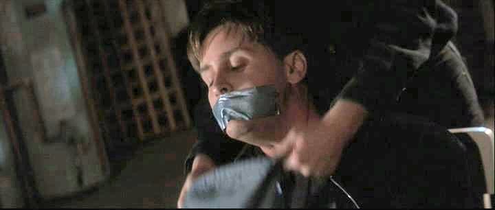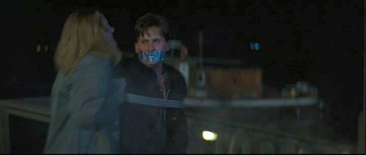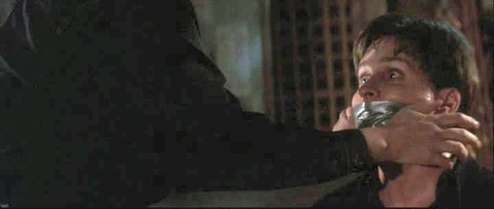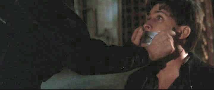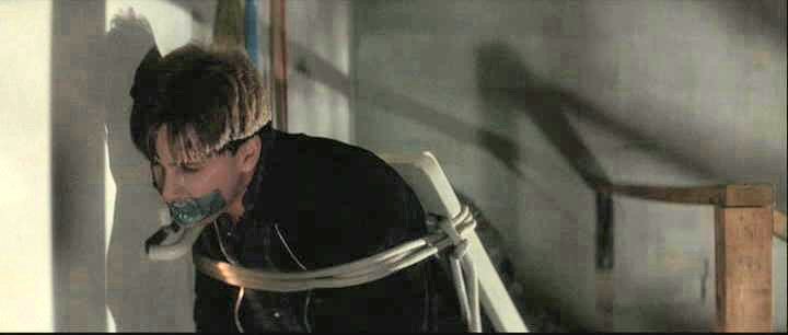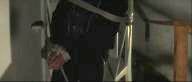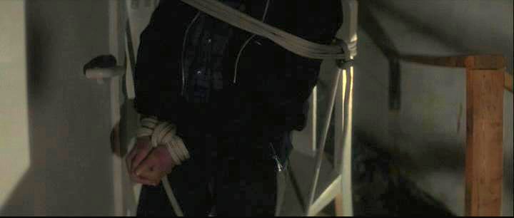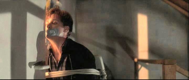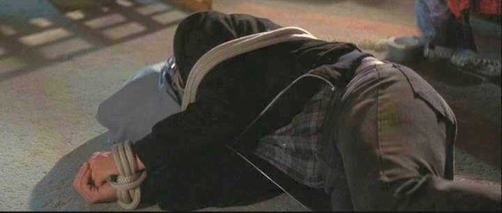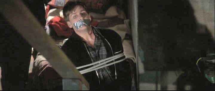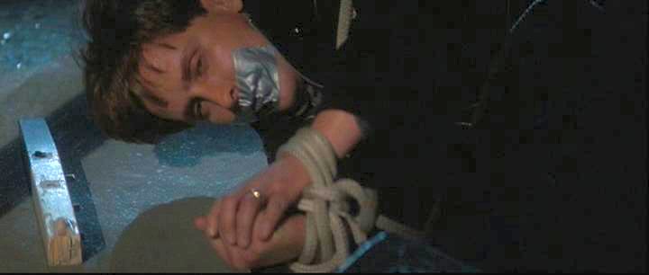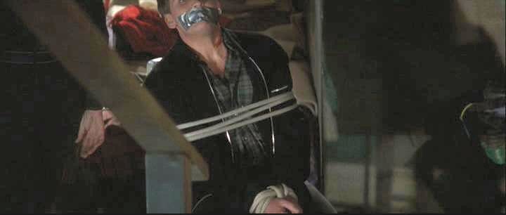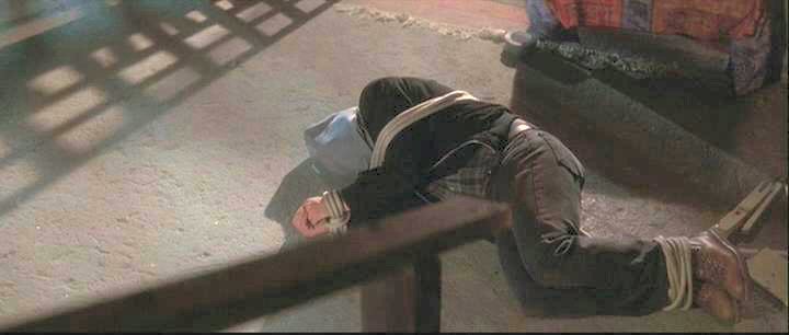 After Emilio is tied to a chair in a cellar, he tries to walk the chair up the steps to the door. He fails miserably, falling back down the steps. Later, he's put in the trunk of a car and taken to a pier.
