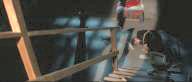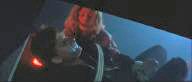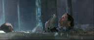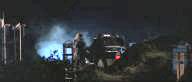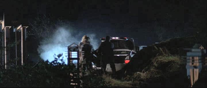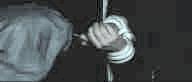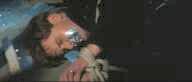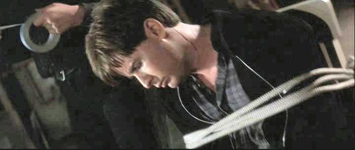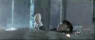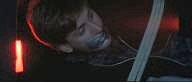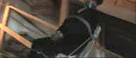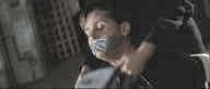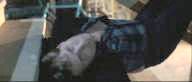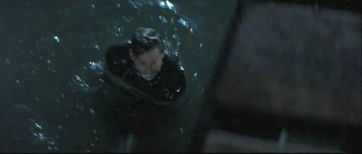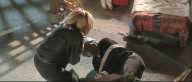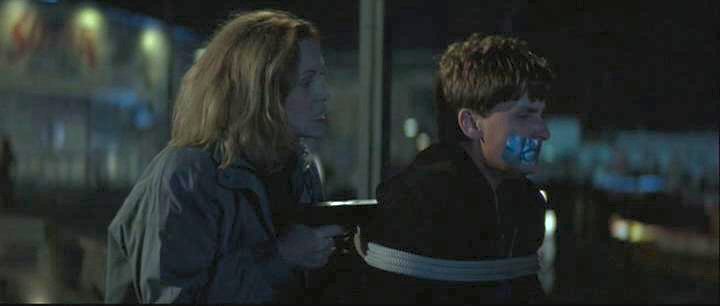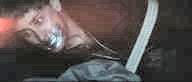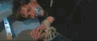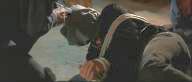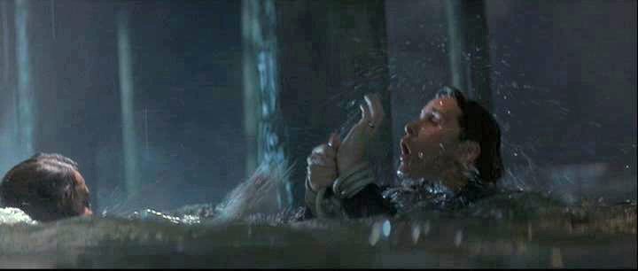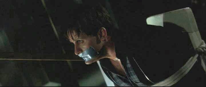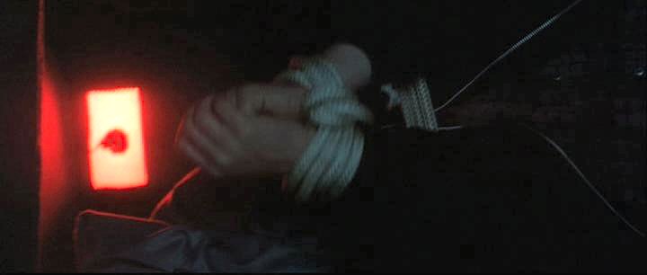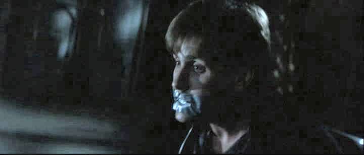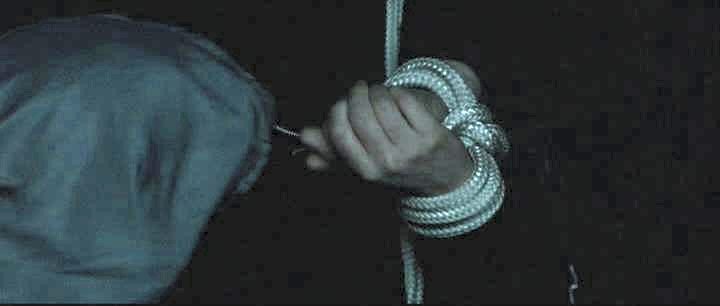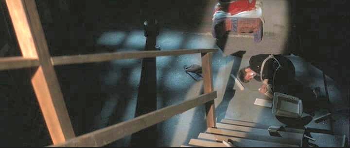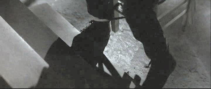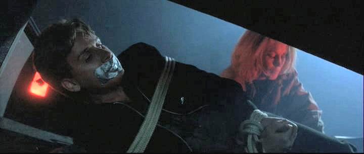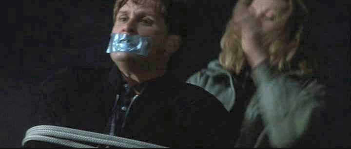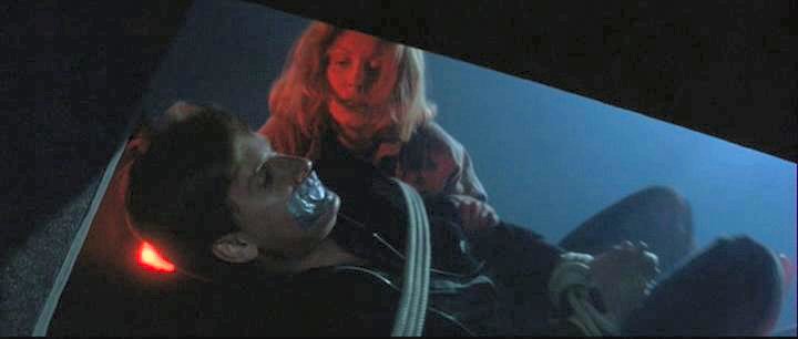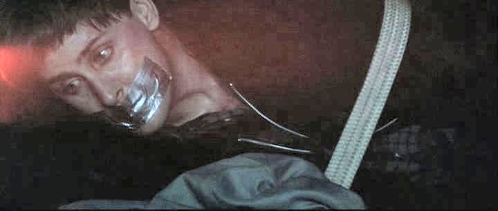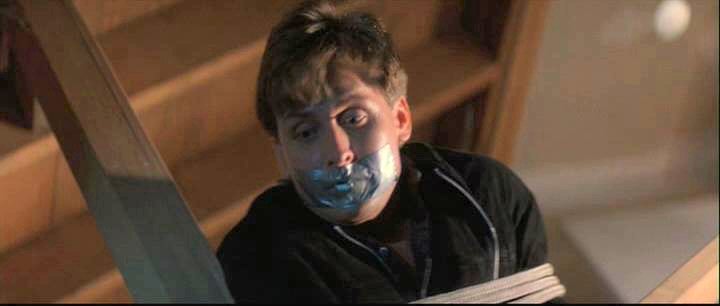 After Emilio is tied to a chair in a cellar, he tries to walk the chair up the steps to the door. He fails miserably, falling back down the steps. Later, he's put in the trunk of a car and taken to a pier.