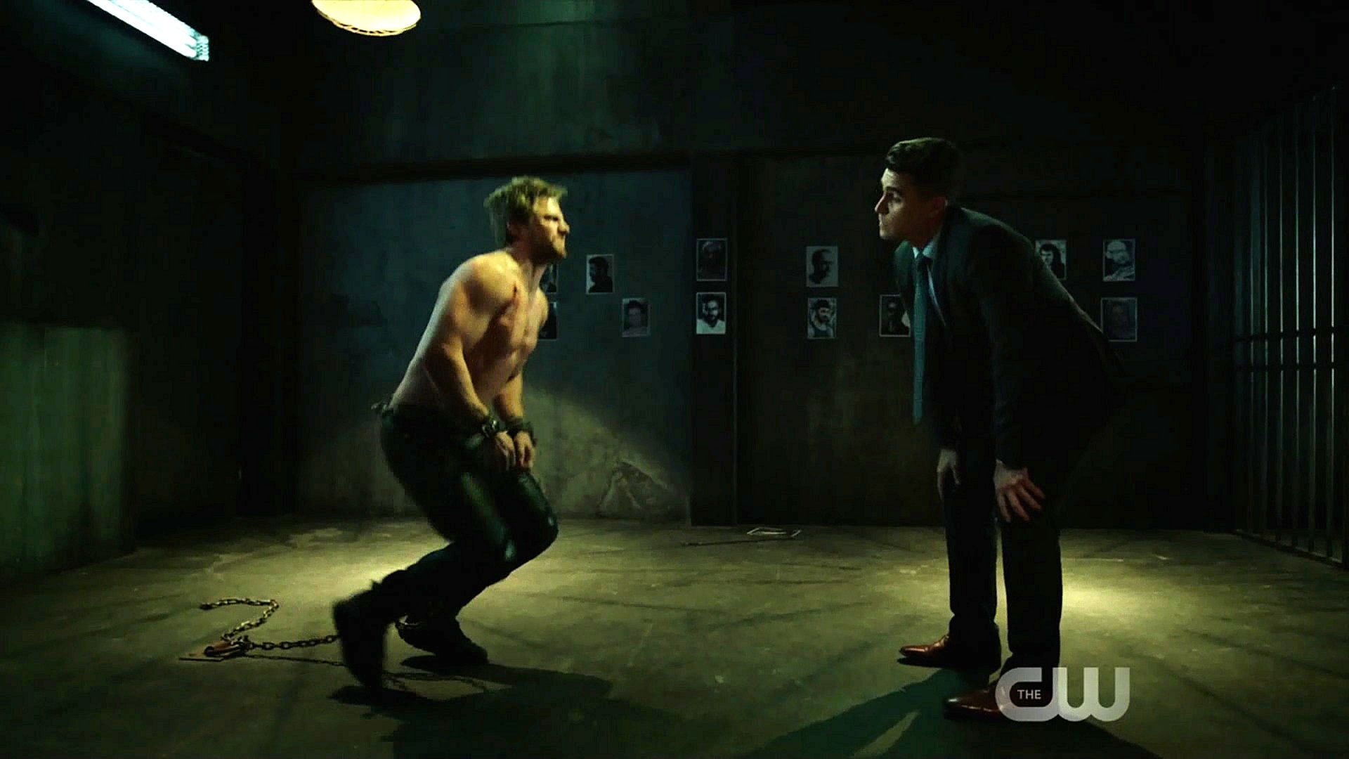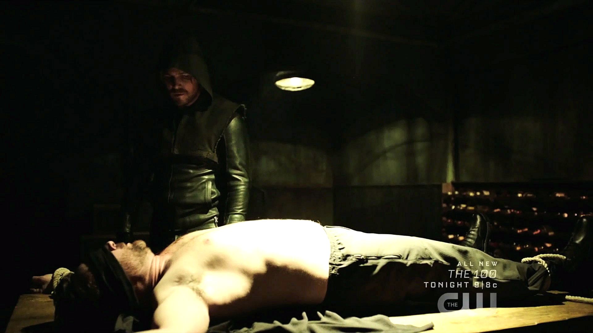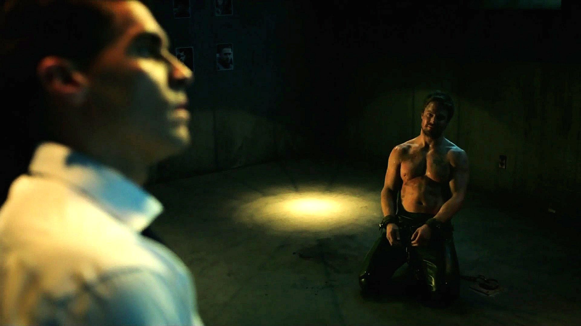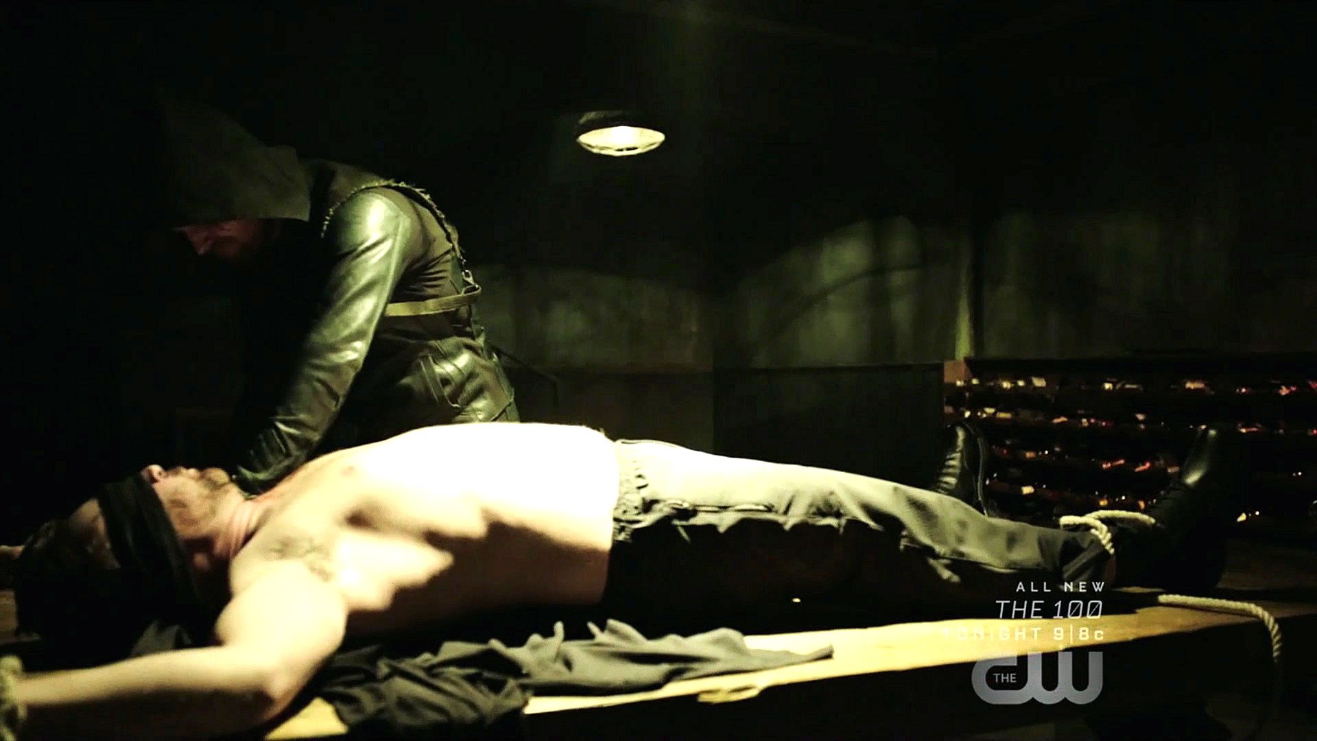 Oliver is tortured by Chase and tortures Gregor in a flashback.