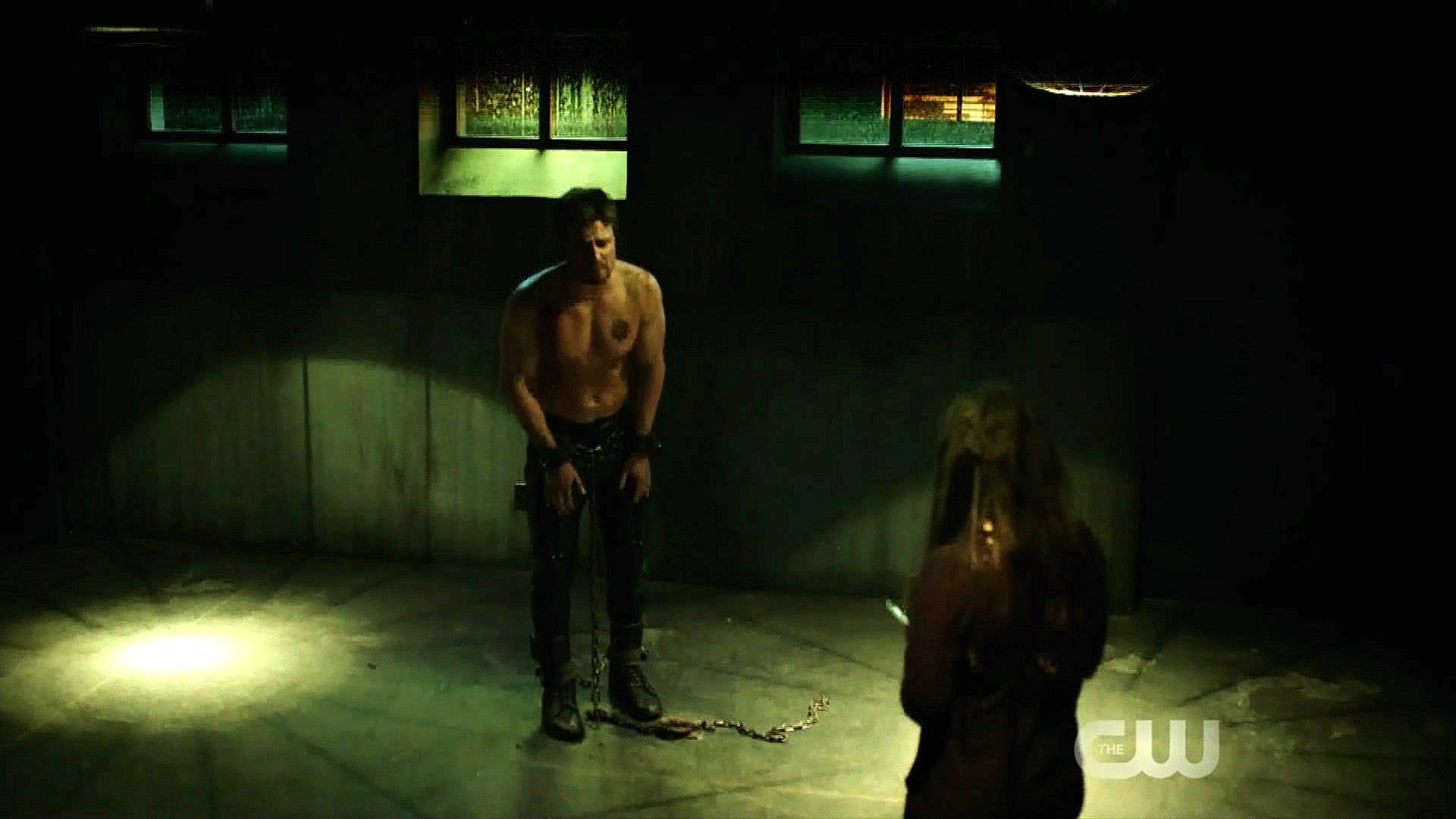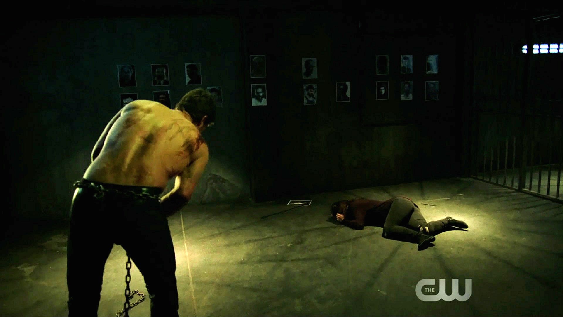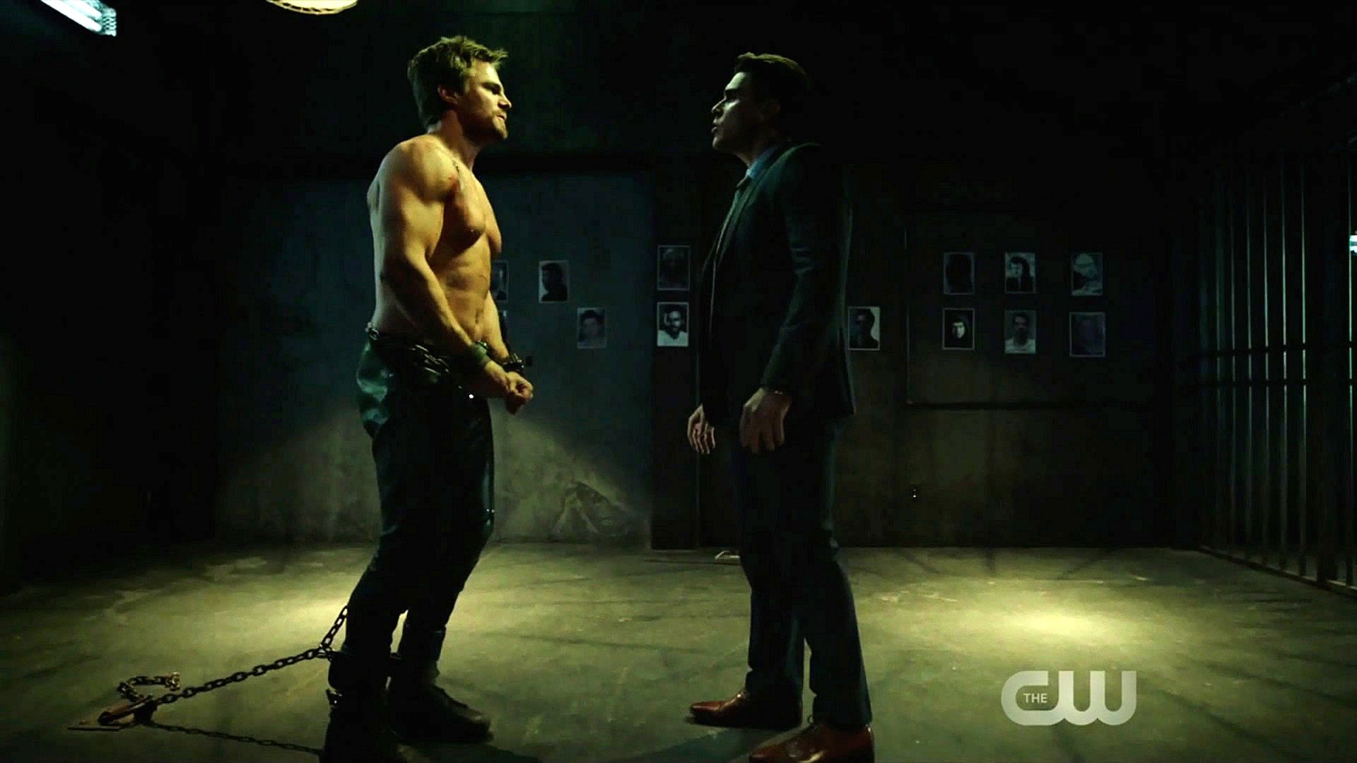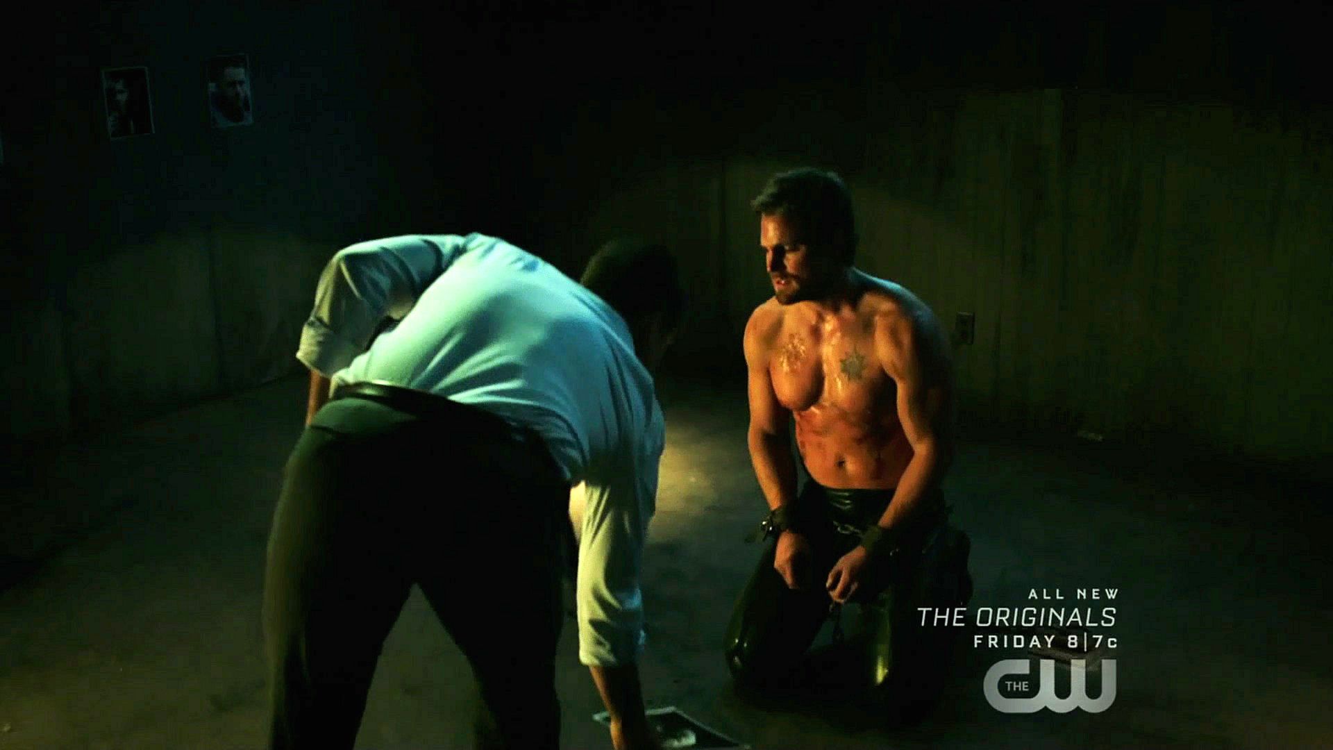 Oliver is tortured by Chase and tortures Gregor in a flashback.