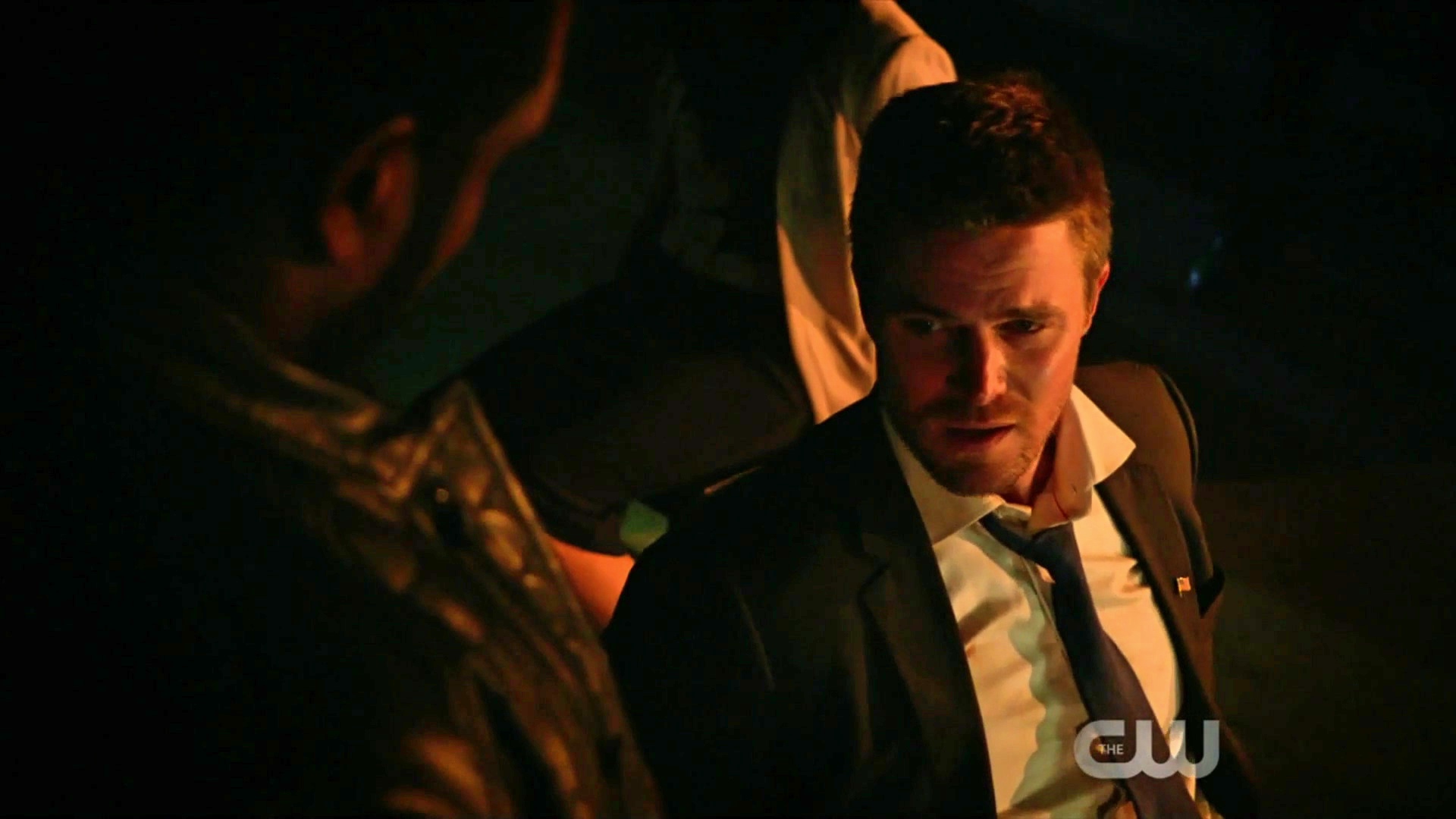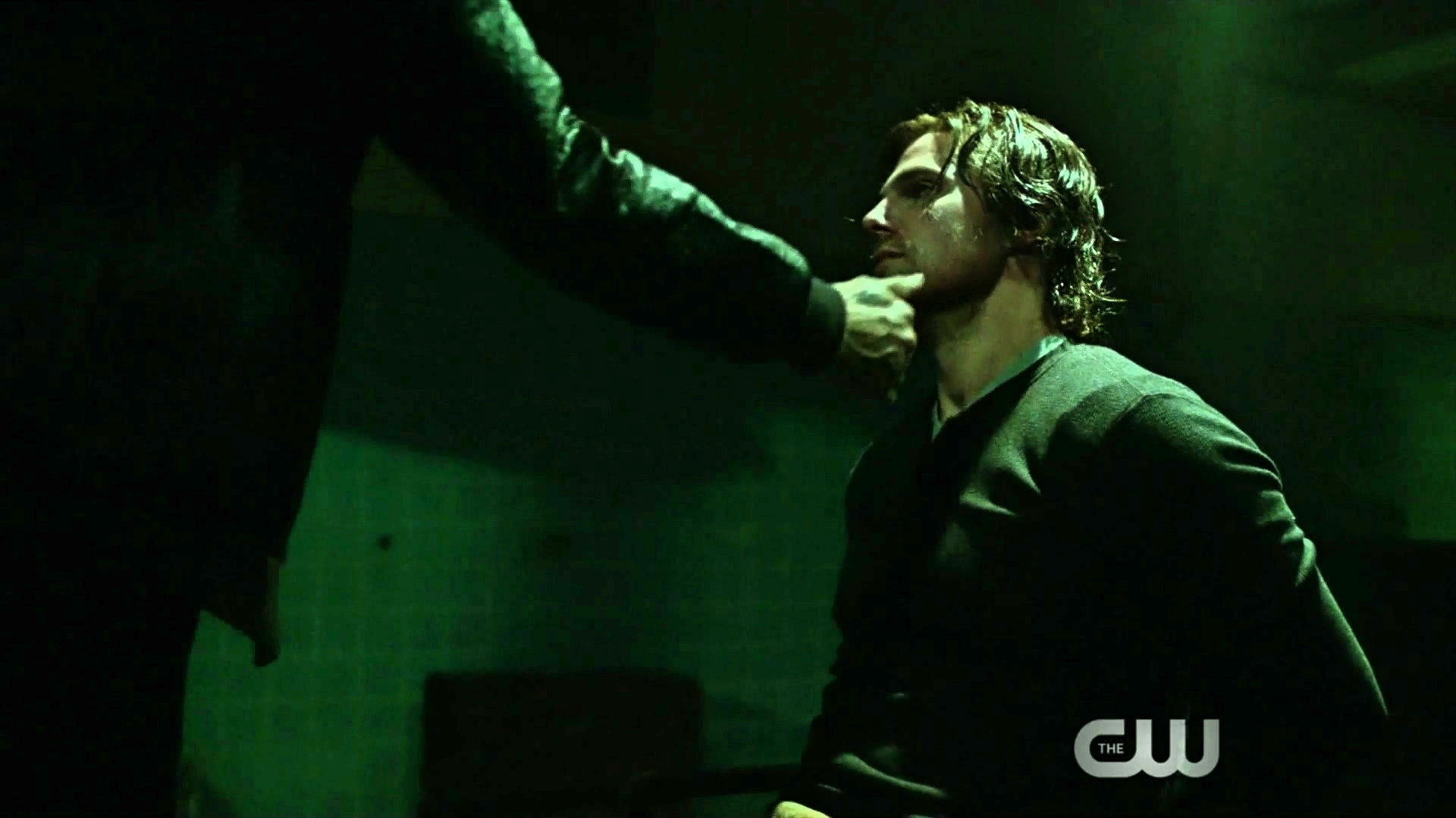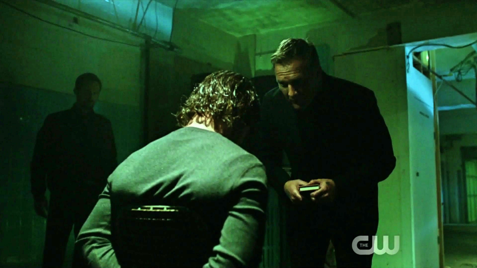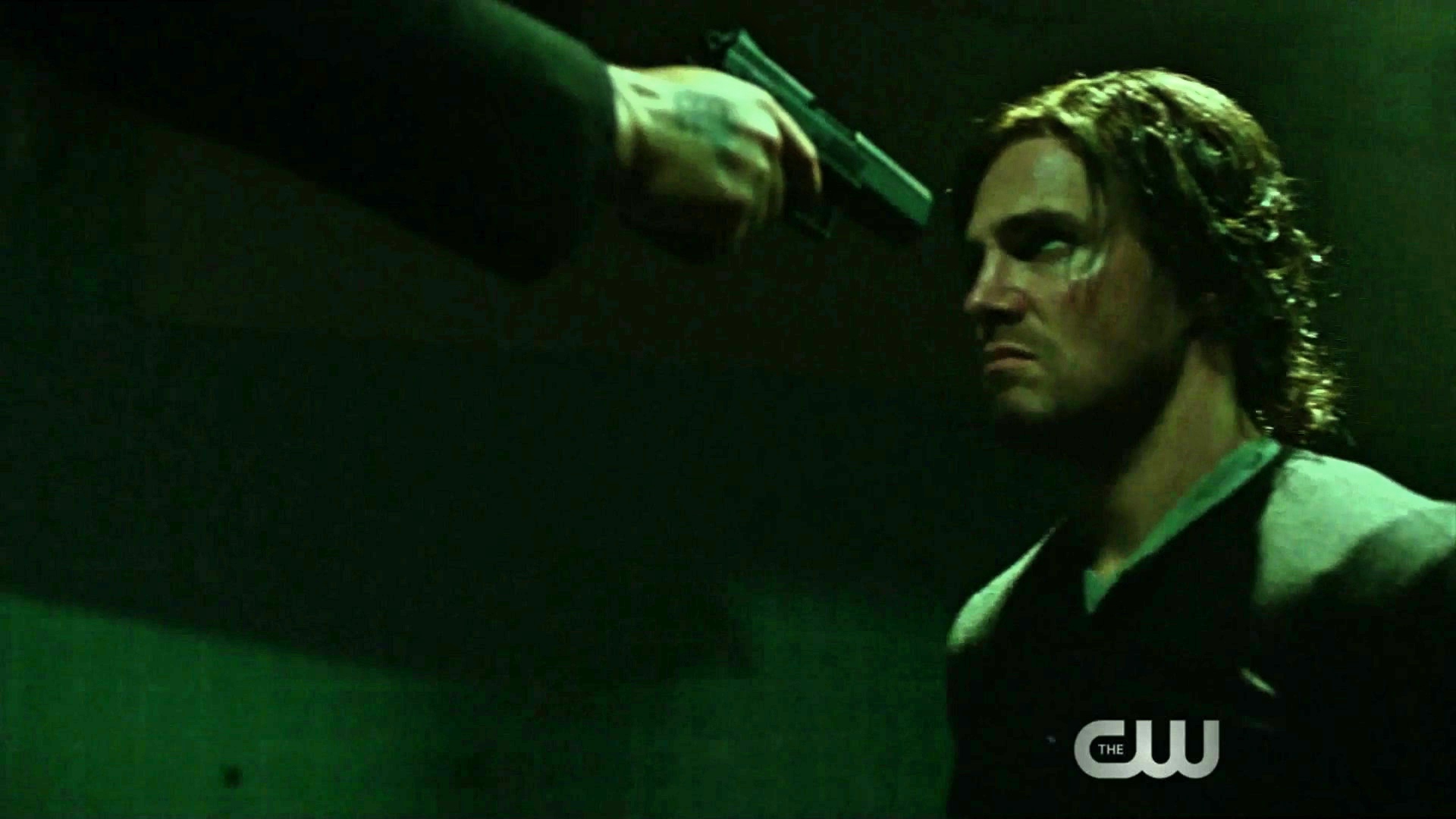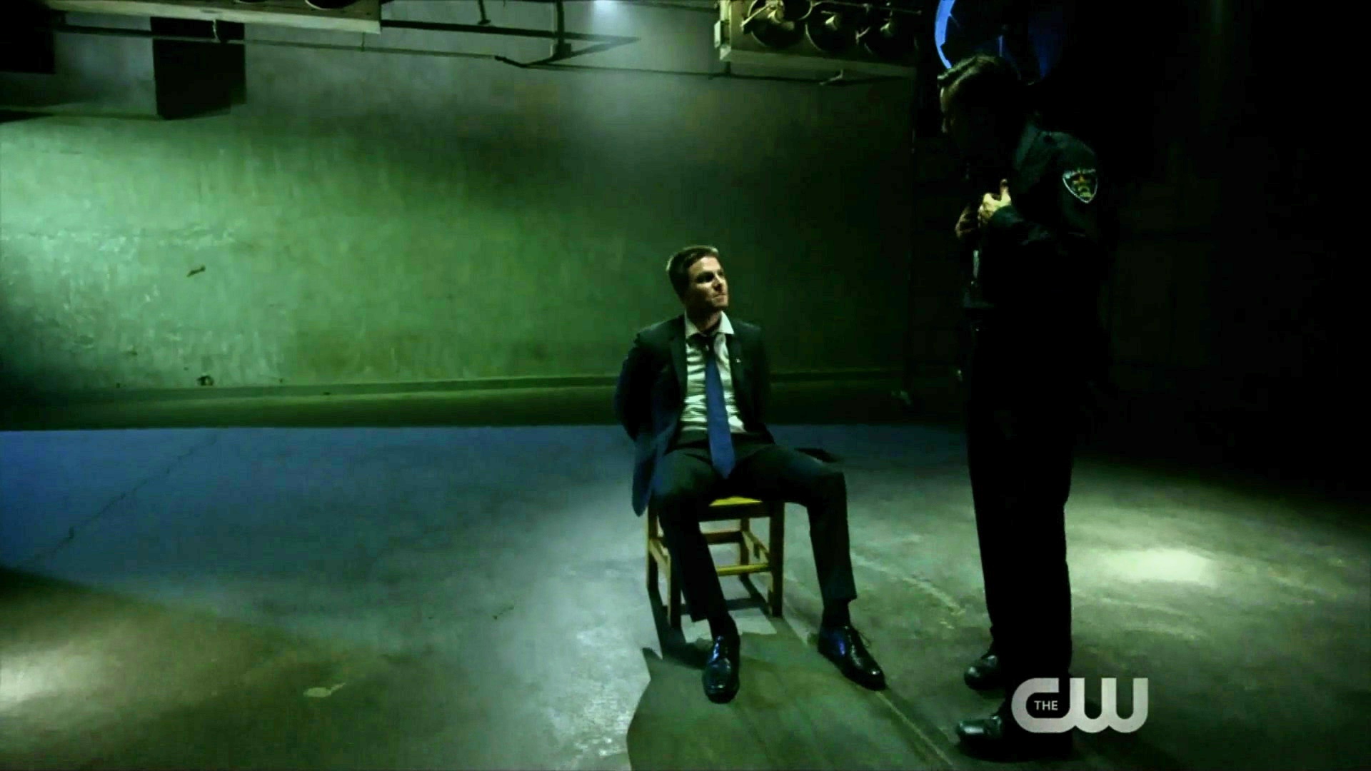 Oliver's held hostage by a Russian thug in a flashback. In the present, he's abducted by corrupt police while a villain takes hostages.