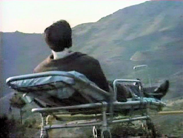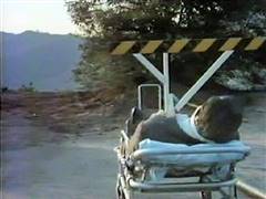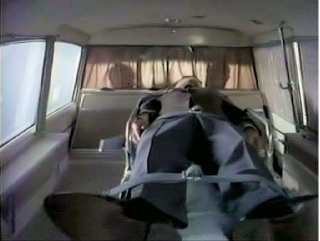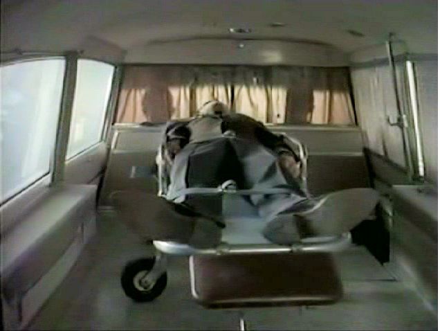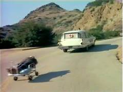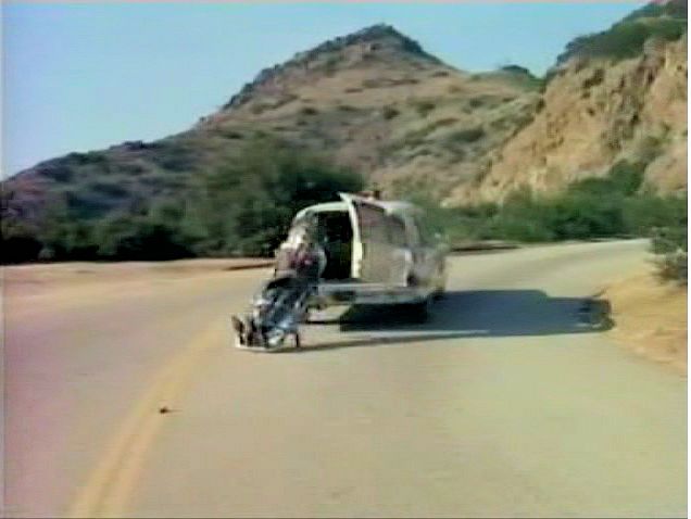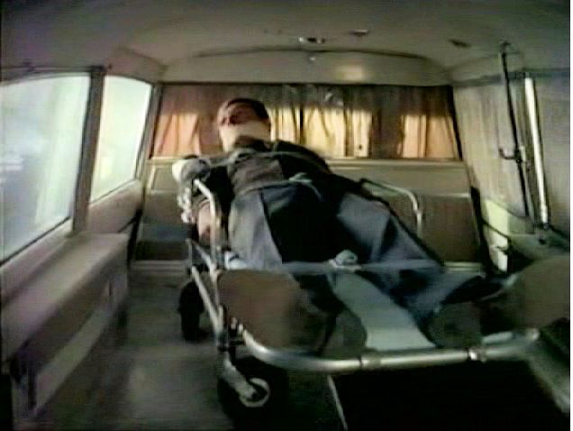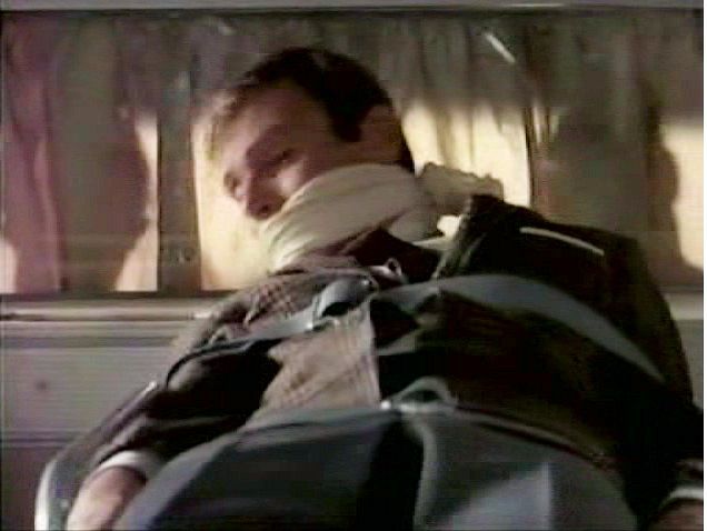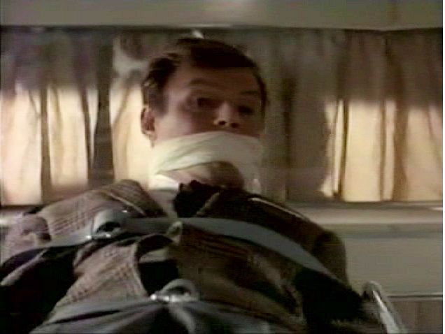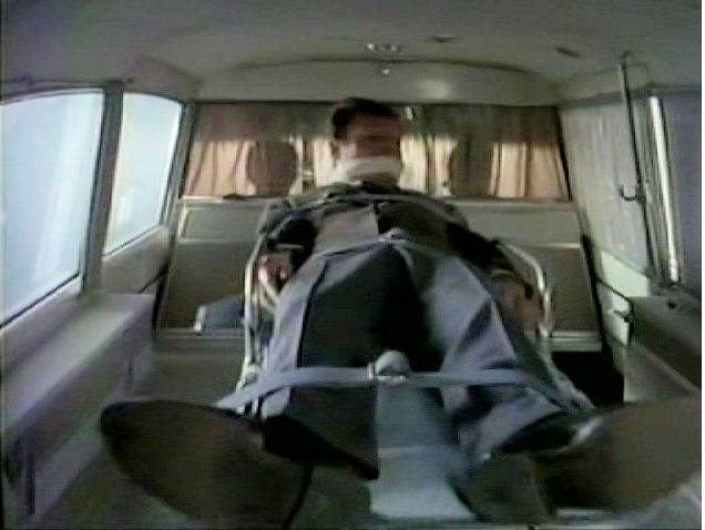 Bruce Wayne is kidnapped by King Tut's men and carried in an ambulance, where he rolls out the back and down a hill.