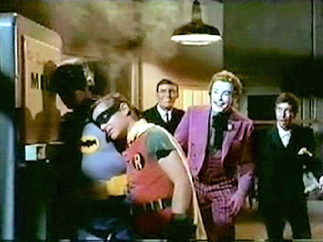 The Joker straps Batman and Robin to electric chairs wired to a slot machine.