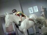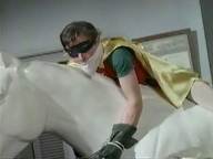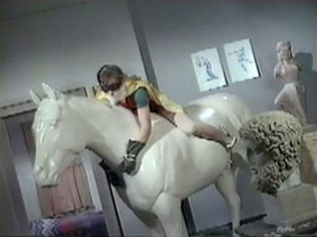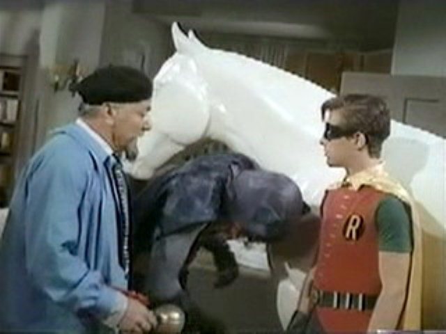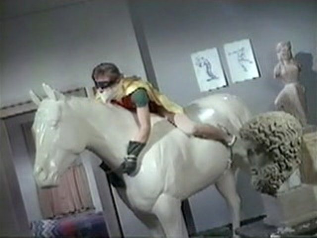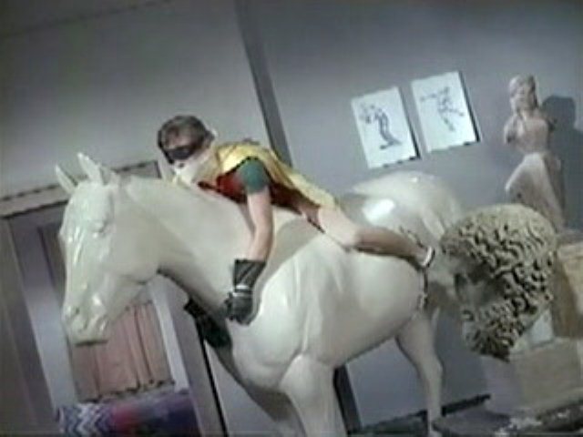 The Mad Hatter has mesmerized Robin, tying him to a statue of a horse, while covering Batman in plaster.