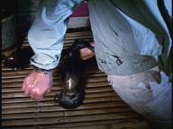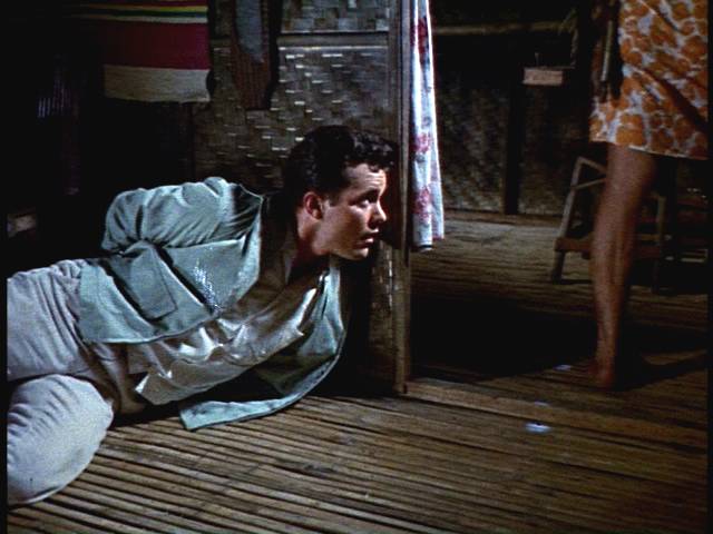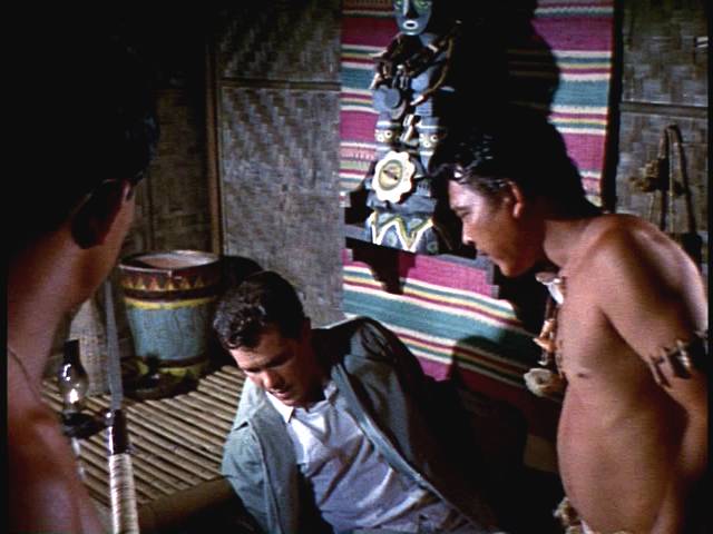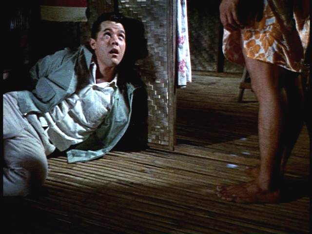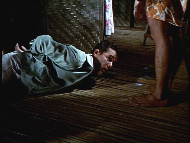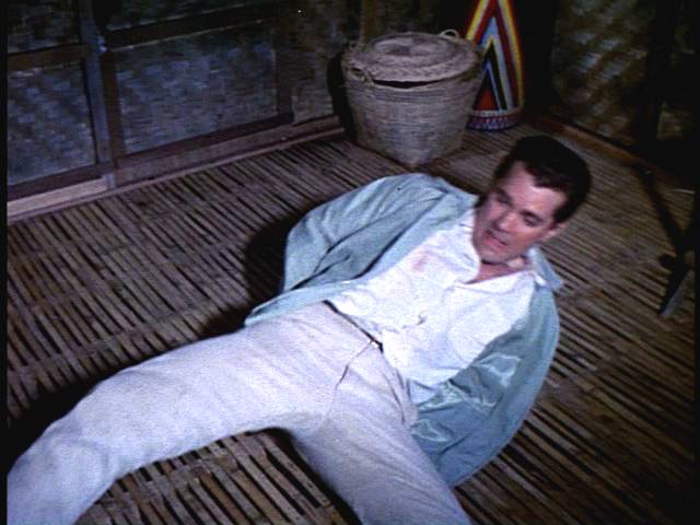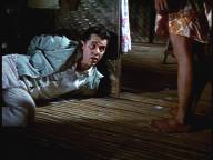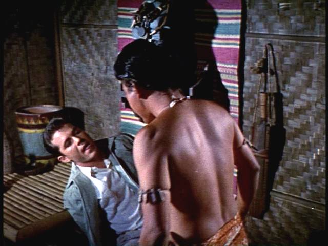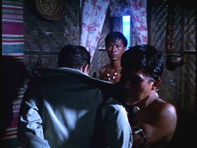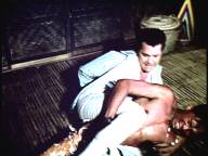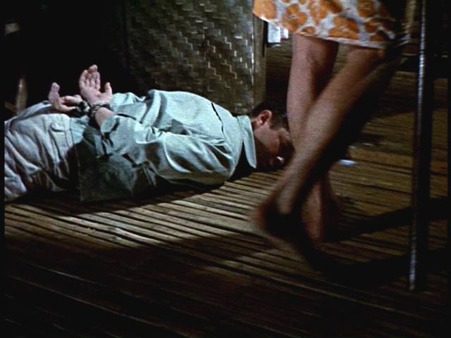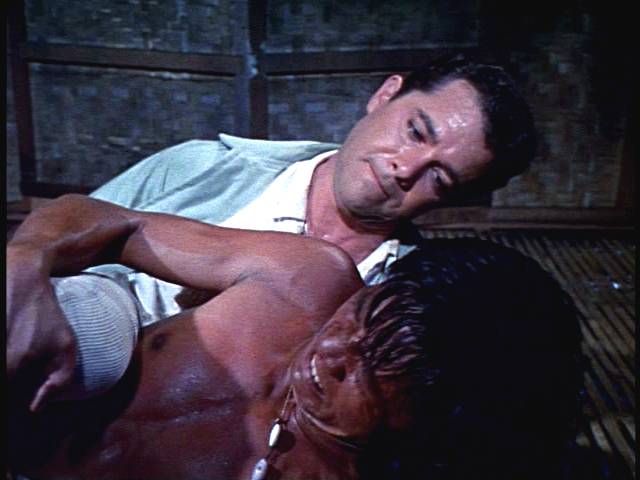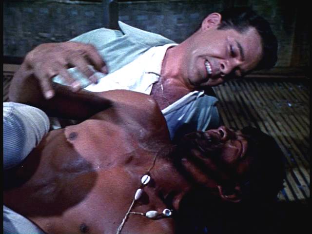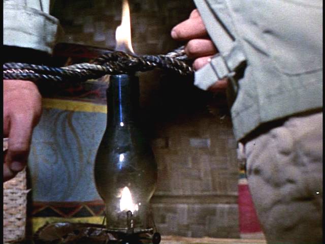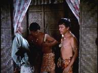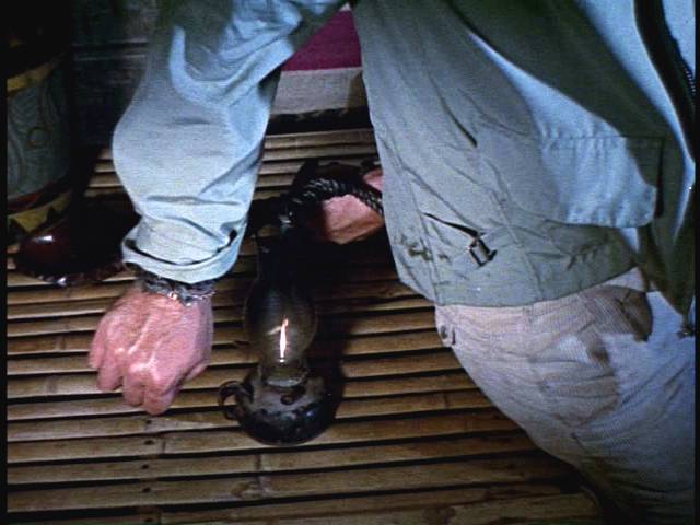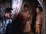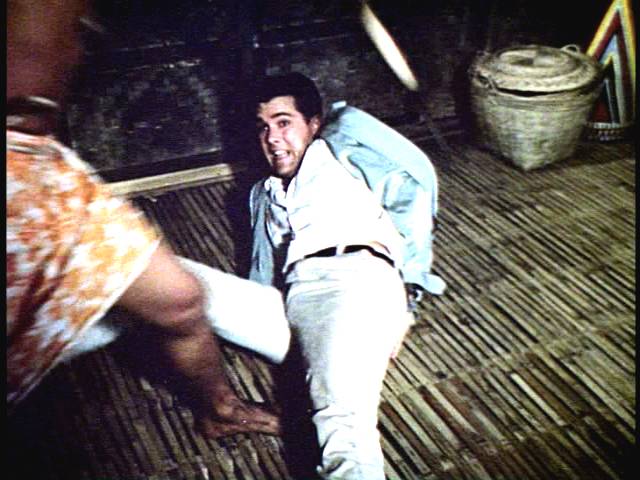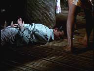 A Peace Corps worker is tied up by the locals after he tries to interfere with their human sacrifice; we're asked to believe he can crush a man with only his legs.