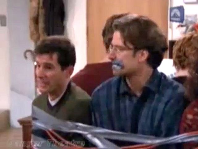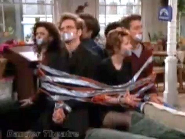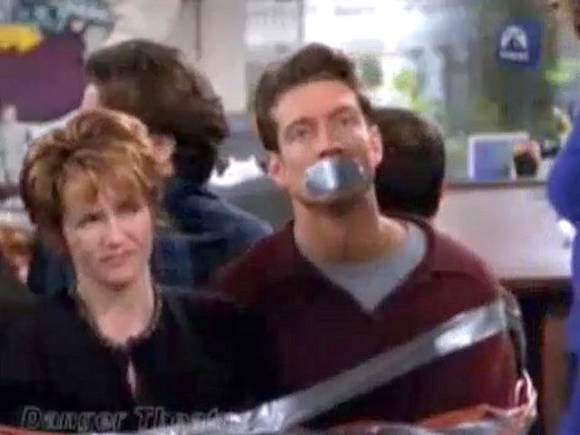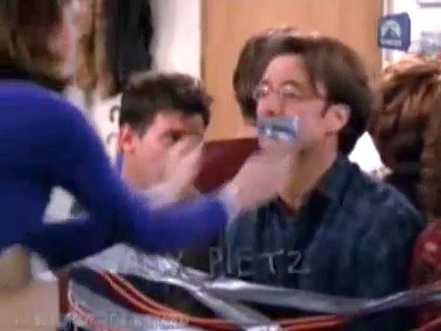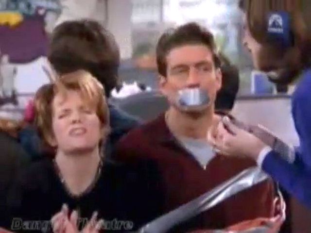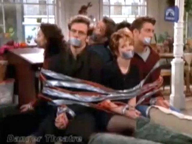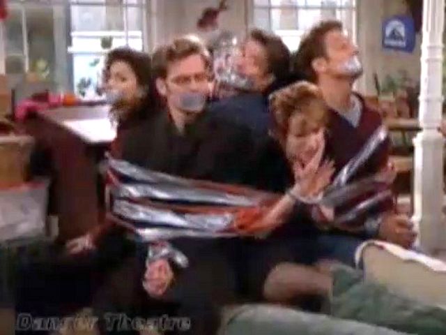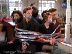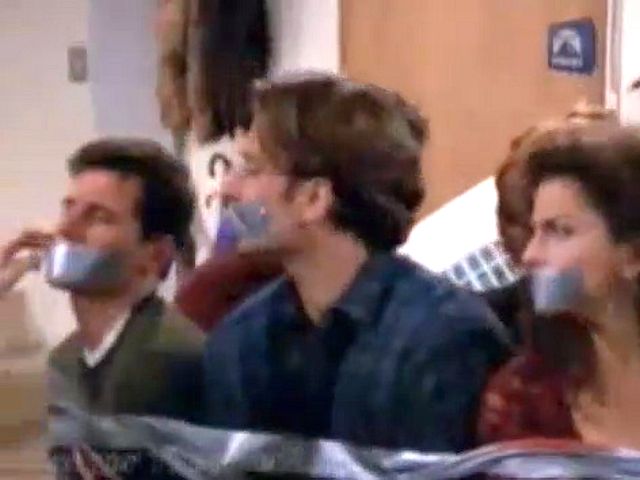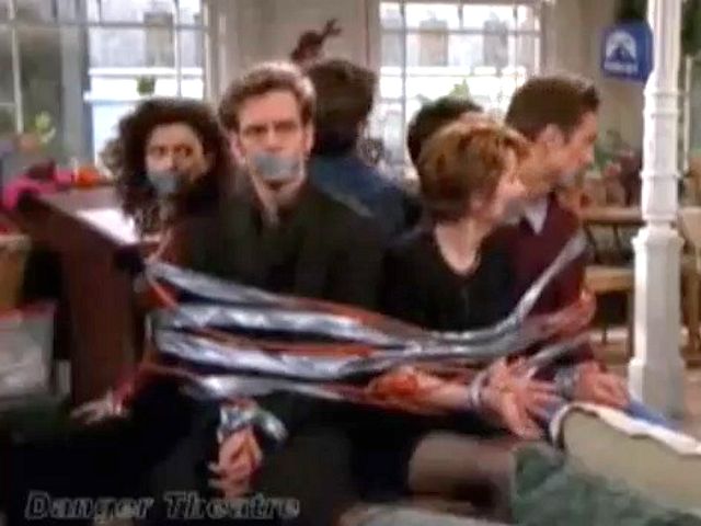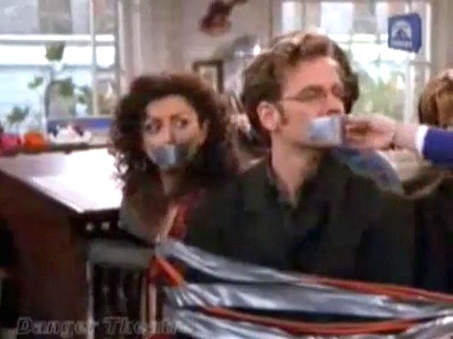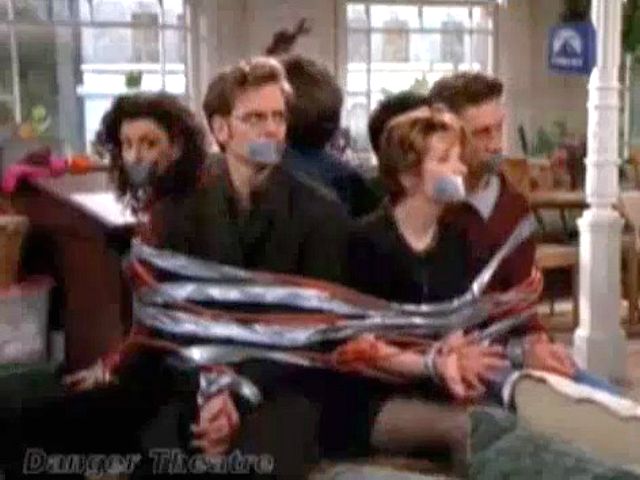 A marriage counselor gets frustrated with the group and ties and gags them all.