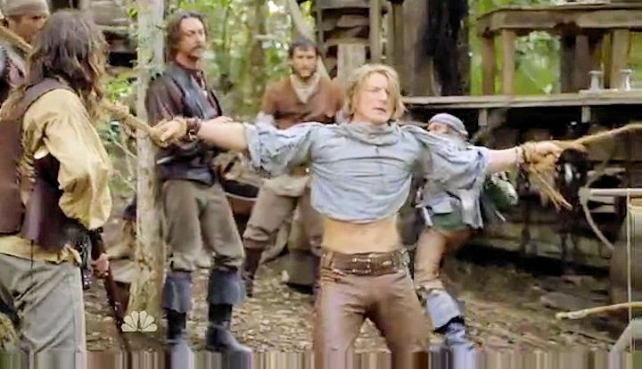 The mutineers torture Crusoe to try to get him to reveal where Friday is.