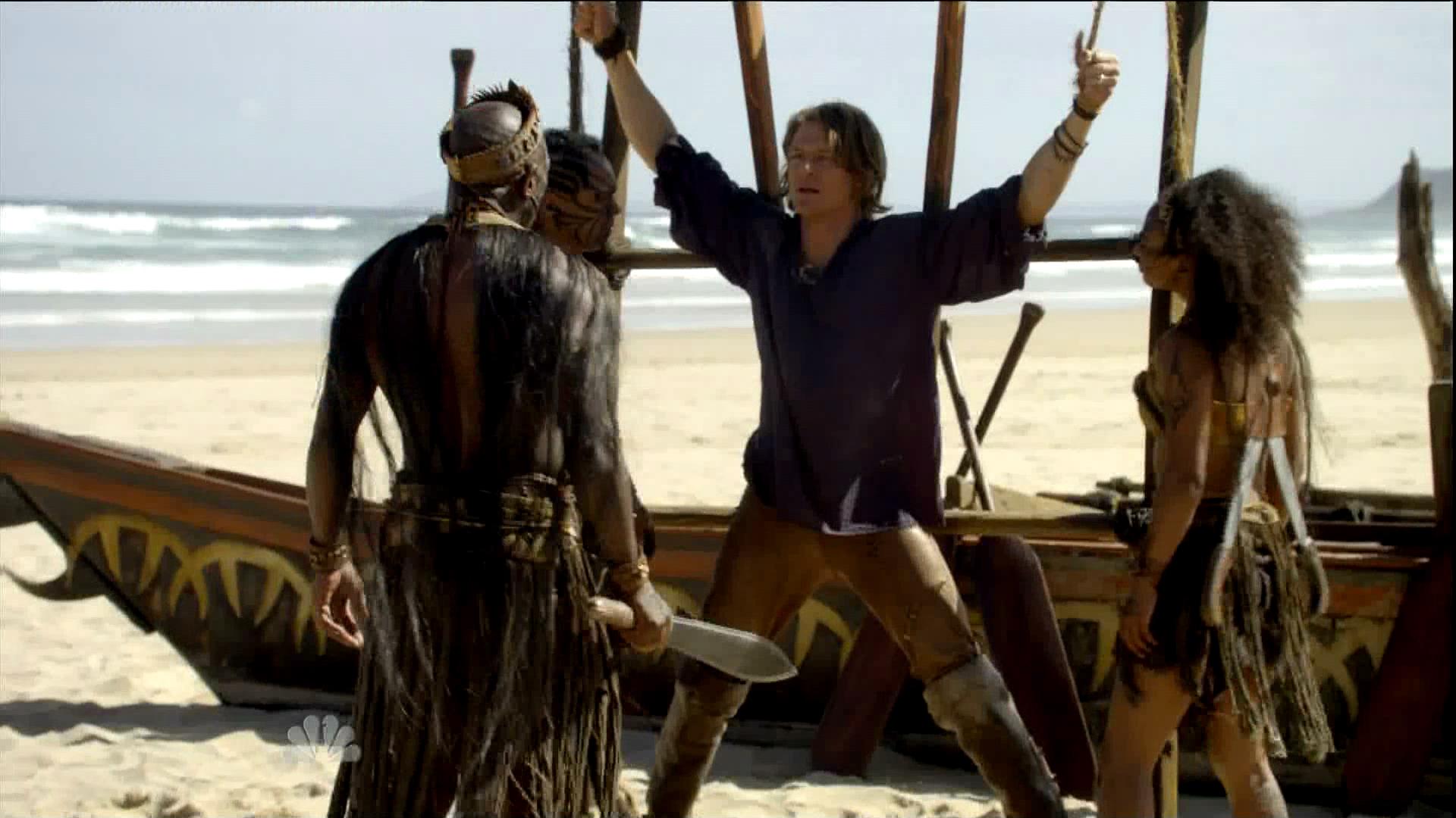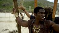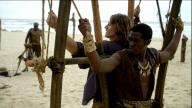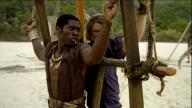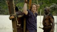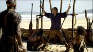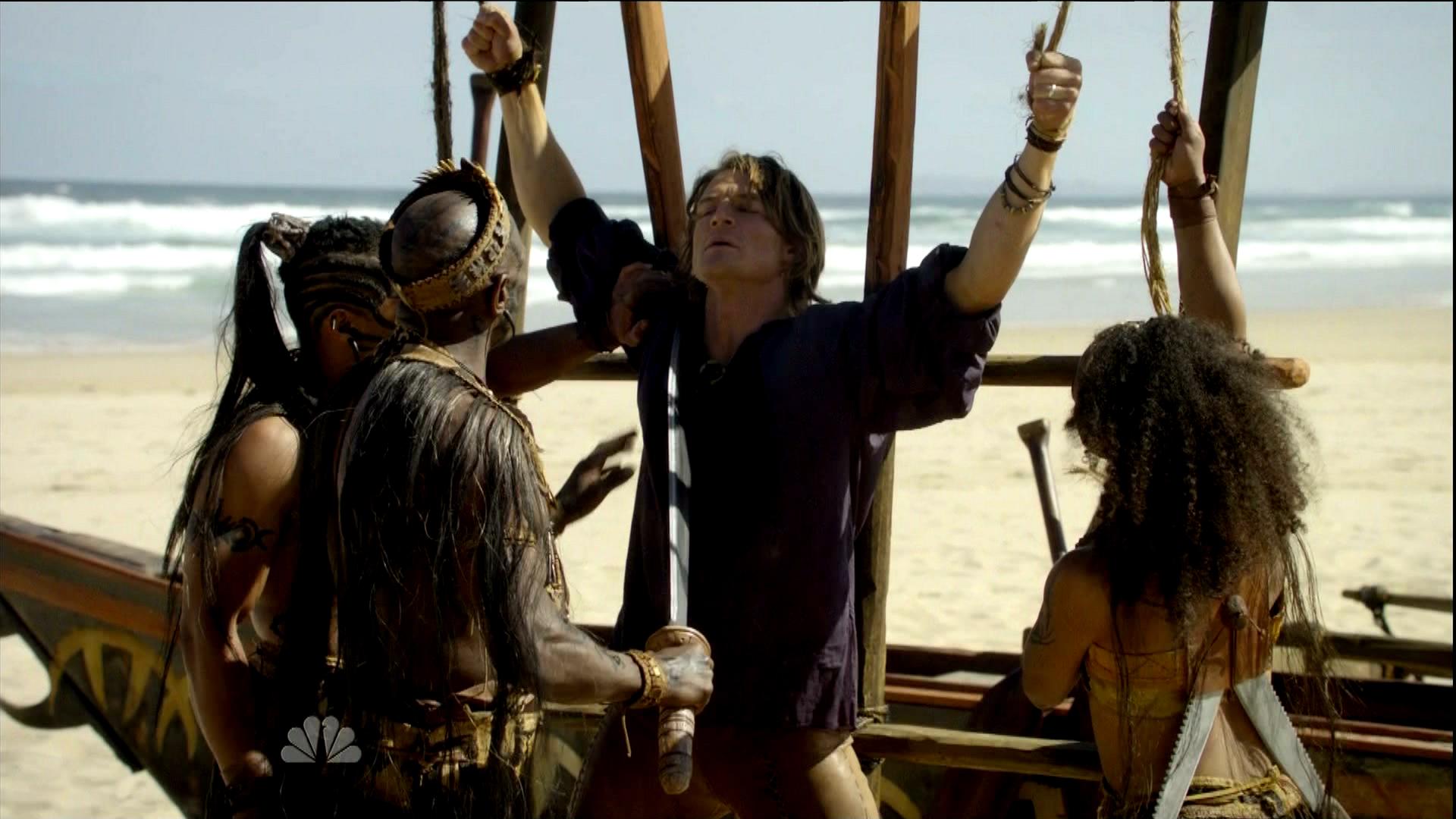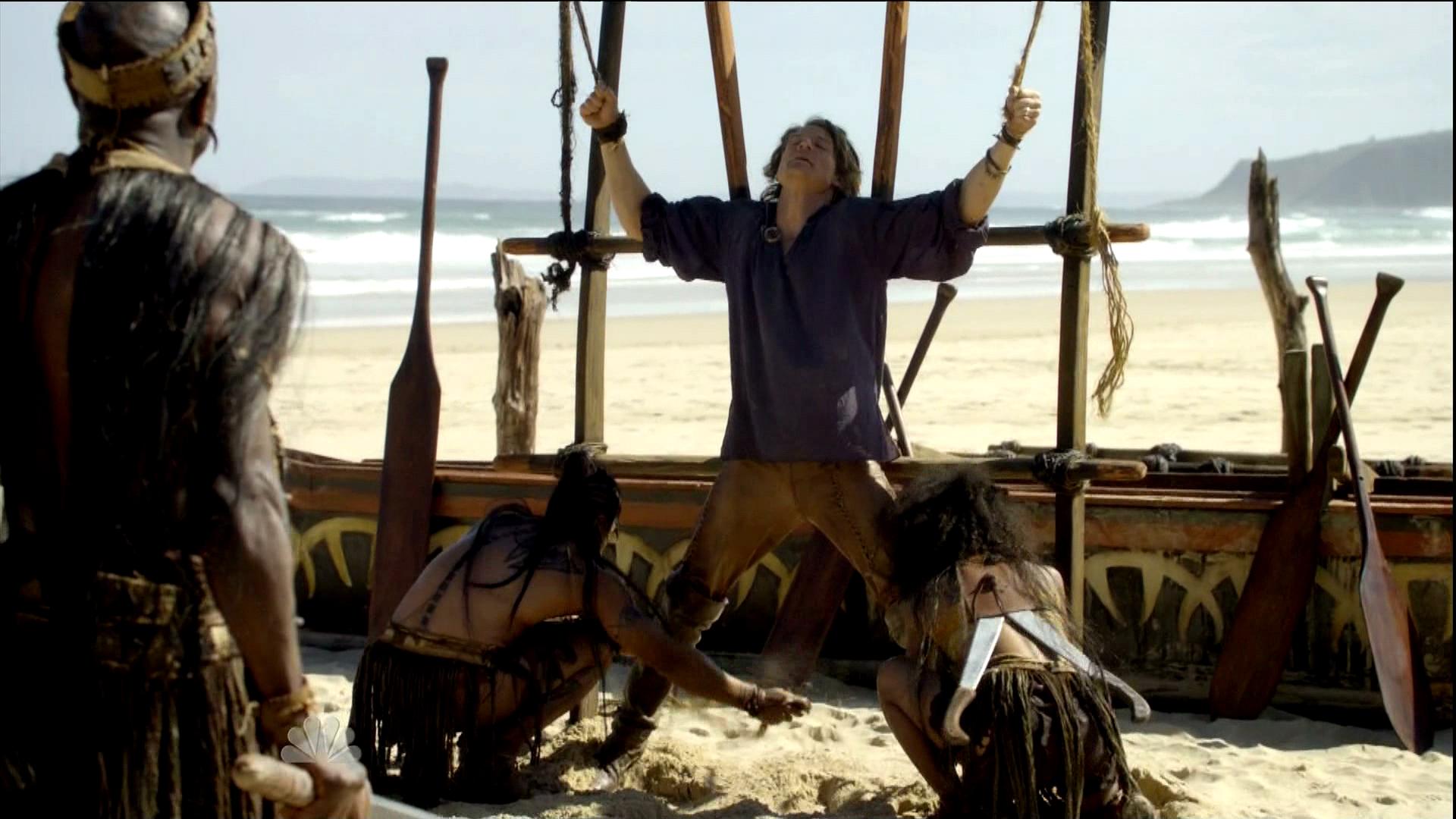 Crusoe is captured by tribesmen who think that Friday is his slave, and the two are tied back-to-back to a wooden frame.