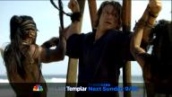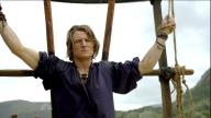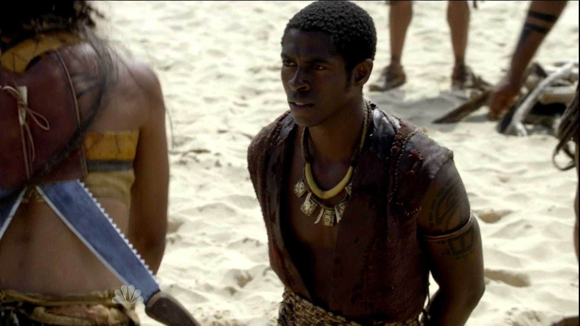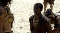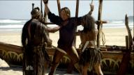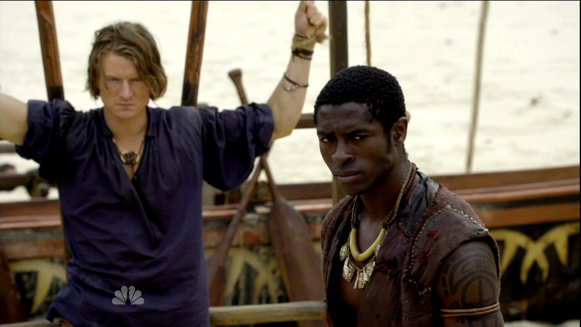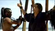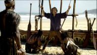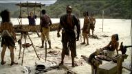Crusoe is captured by tribesmen who think that Friday is his slave, and the two are tied back-to-back to a wooden frame.