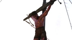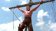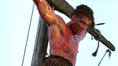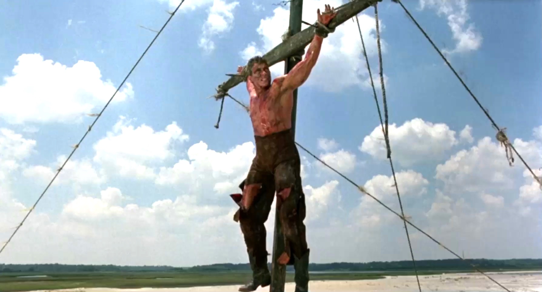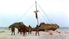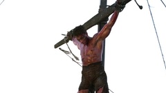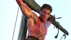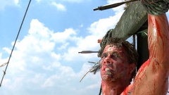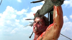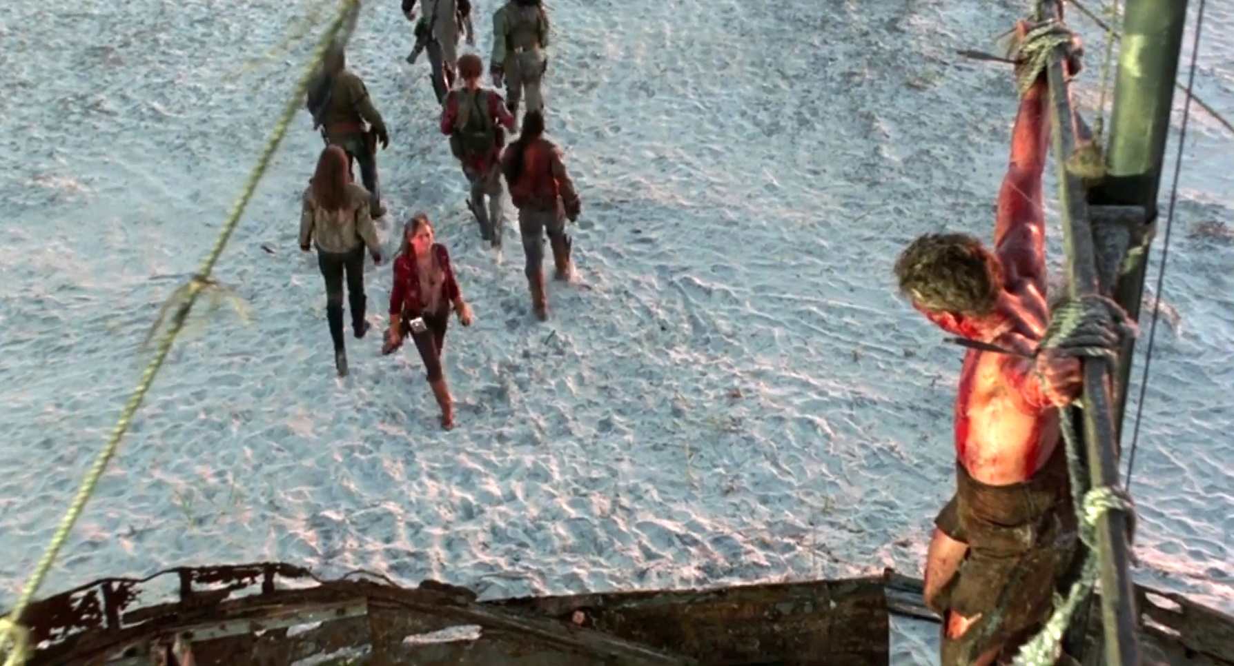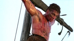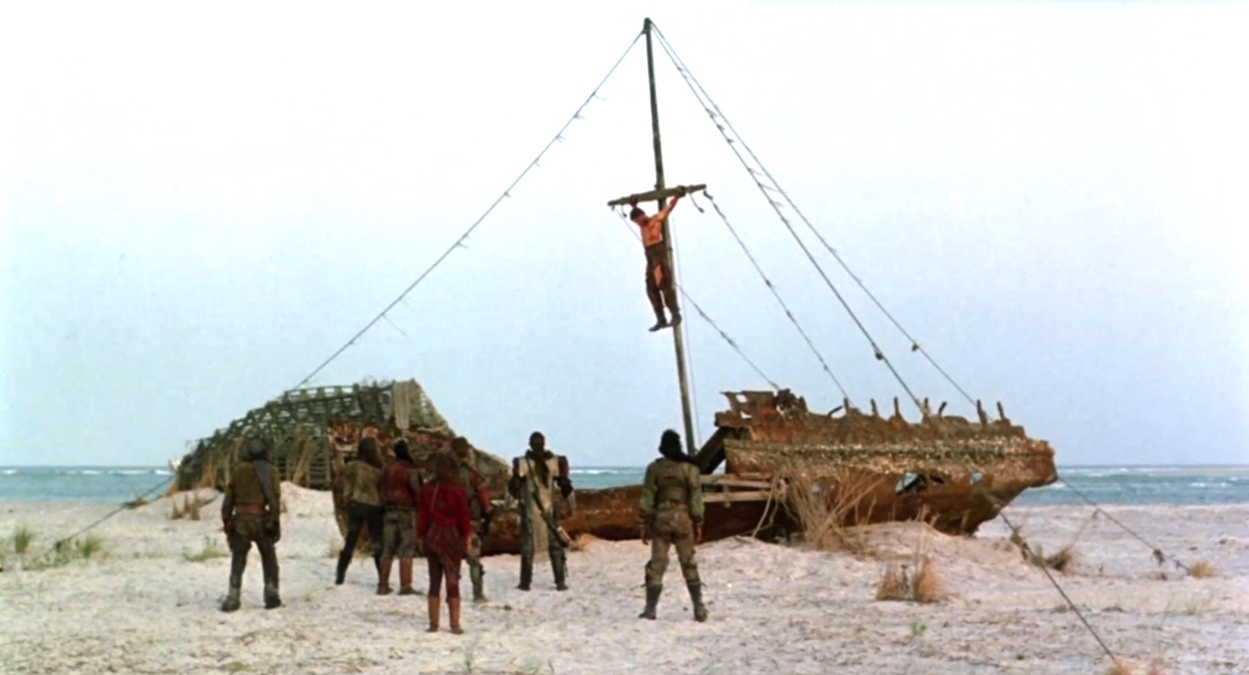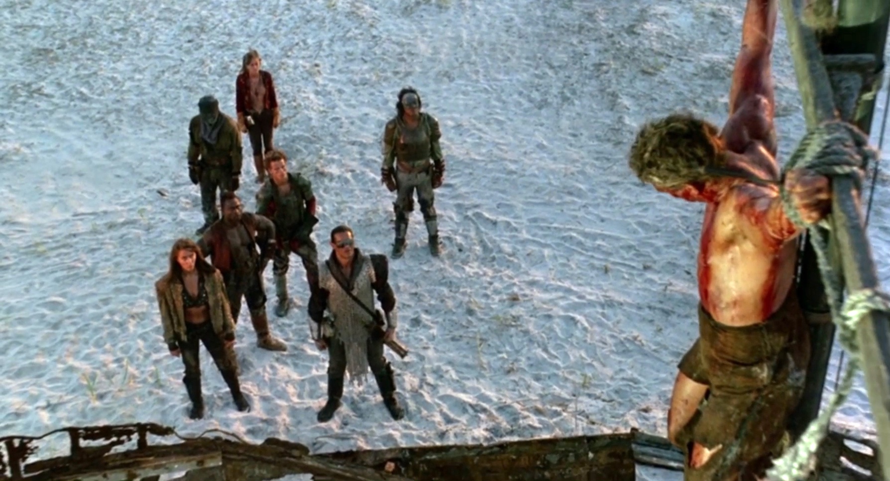 A mercenary is crucified on the mast of a ship by post-apocalyptic pirates.
