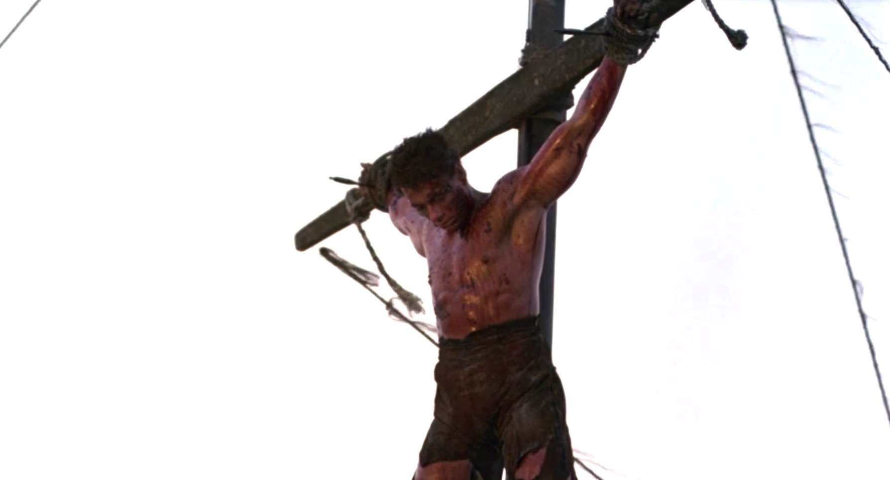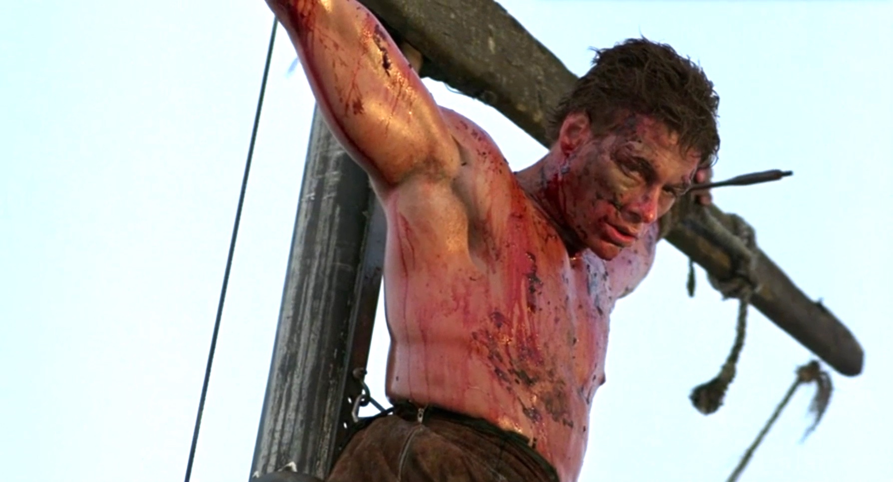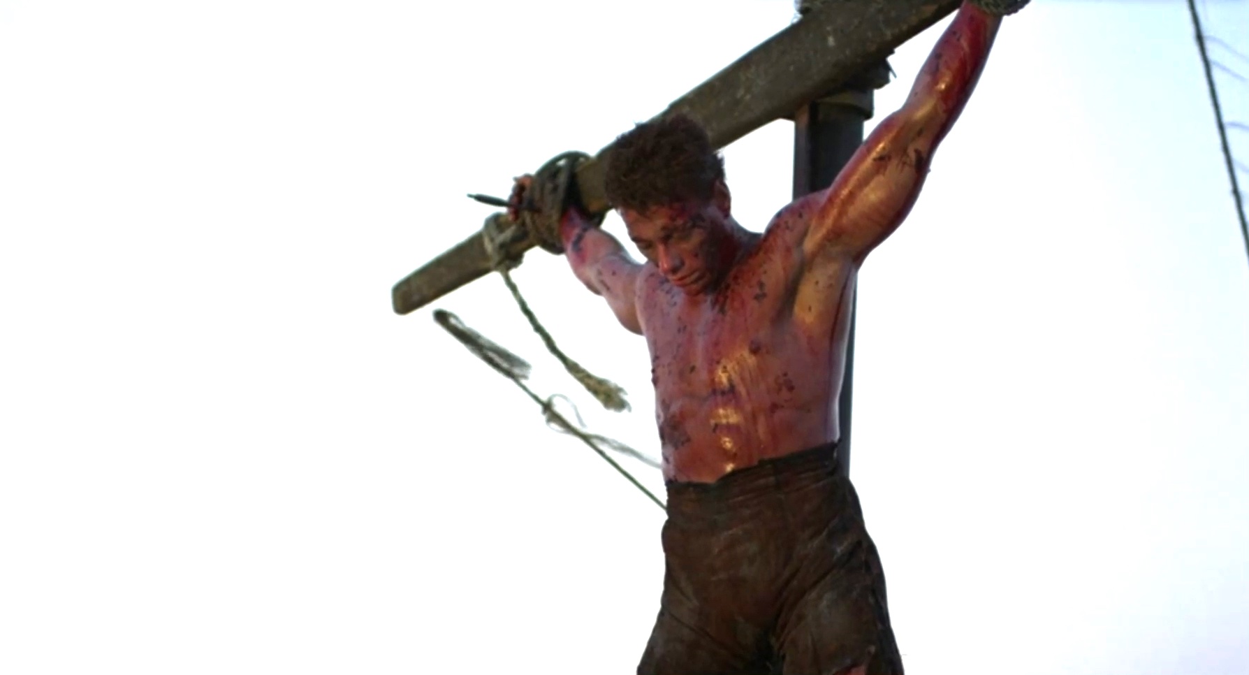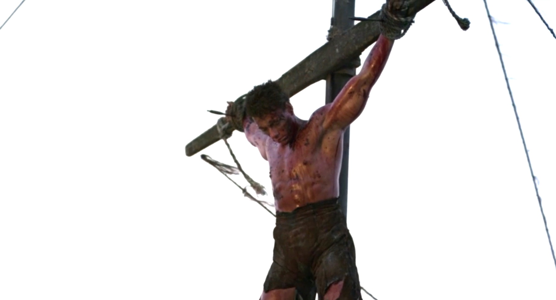 A mercenary is crucified on the mast of a ship by post-apocalyptic pirates.