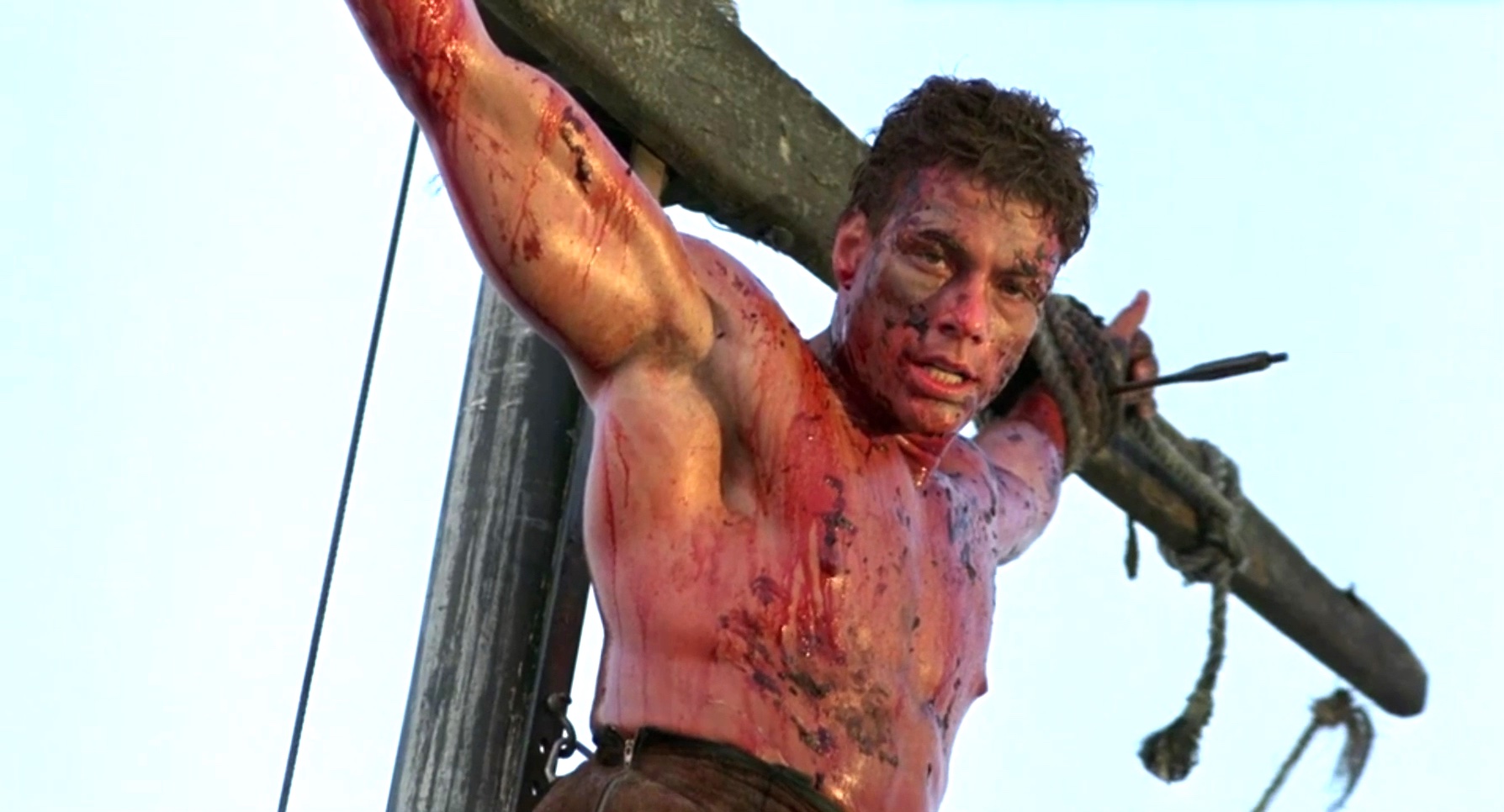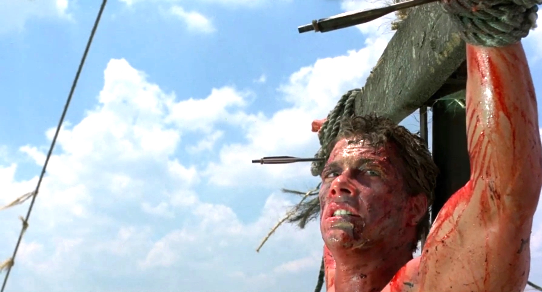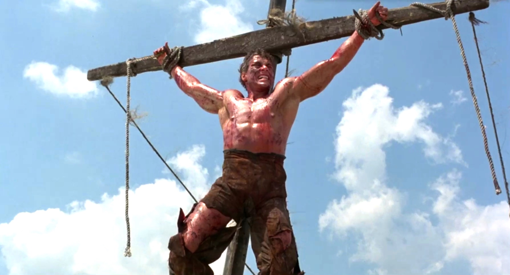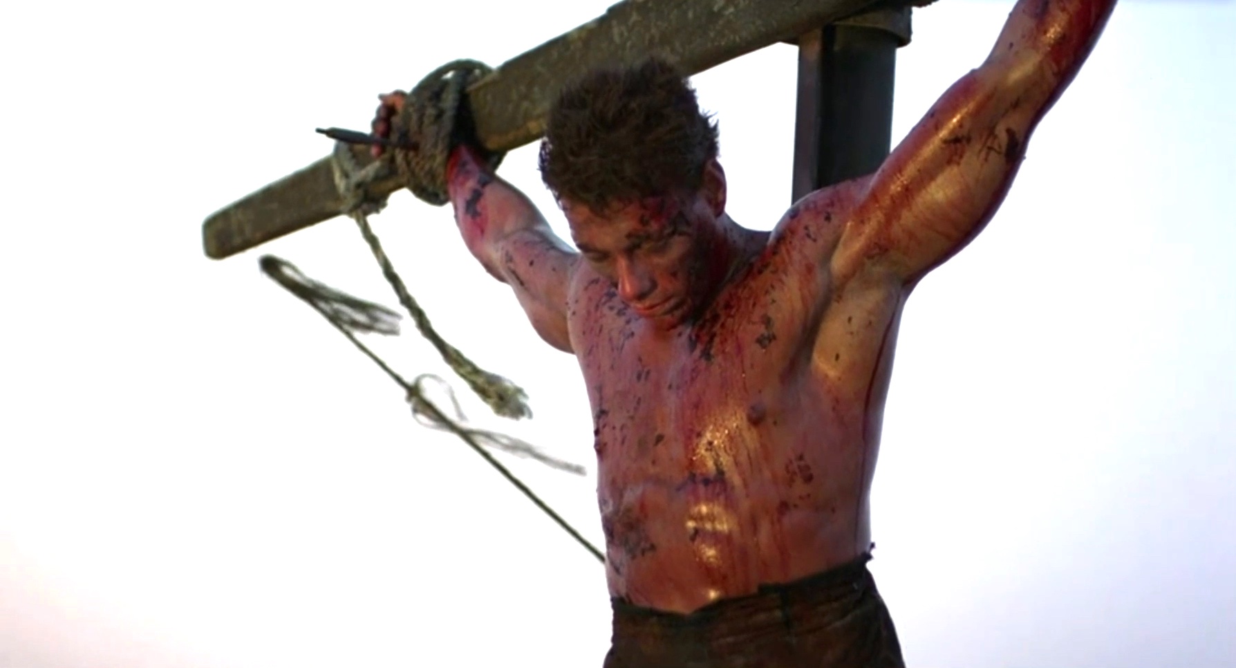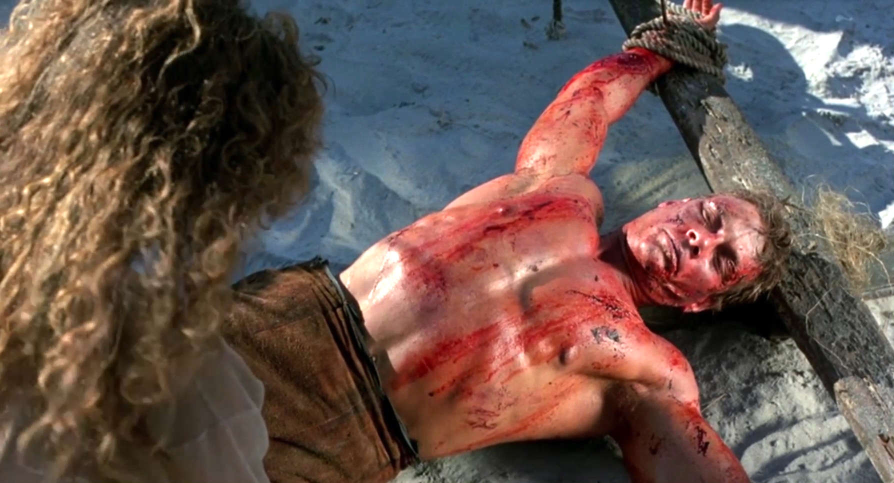 A mercenary is crucified on the mast of a ship by post-apocalyptic pirates.