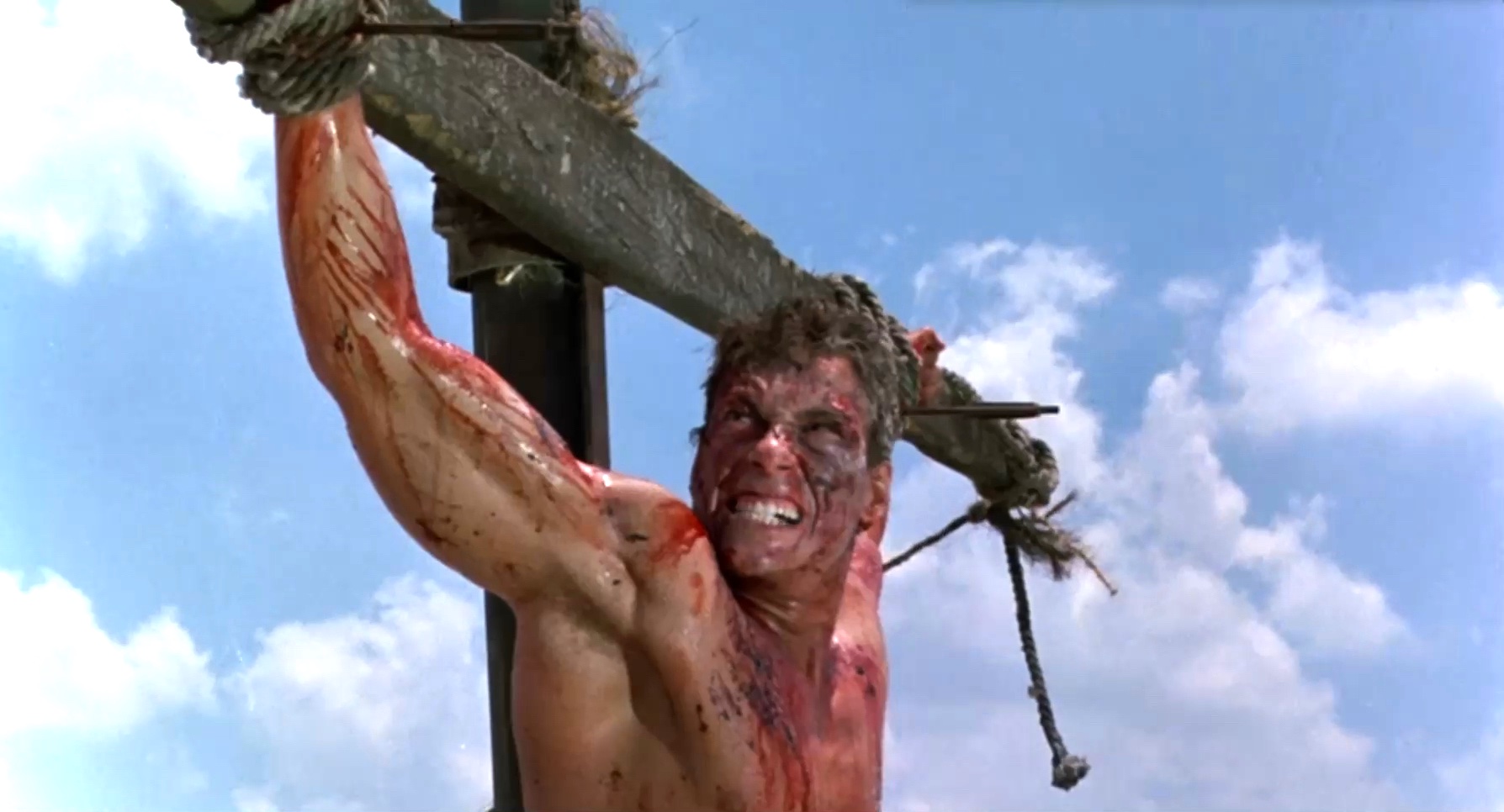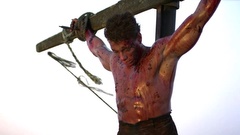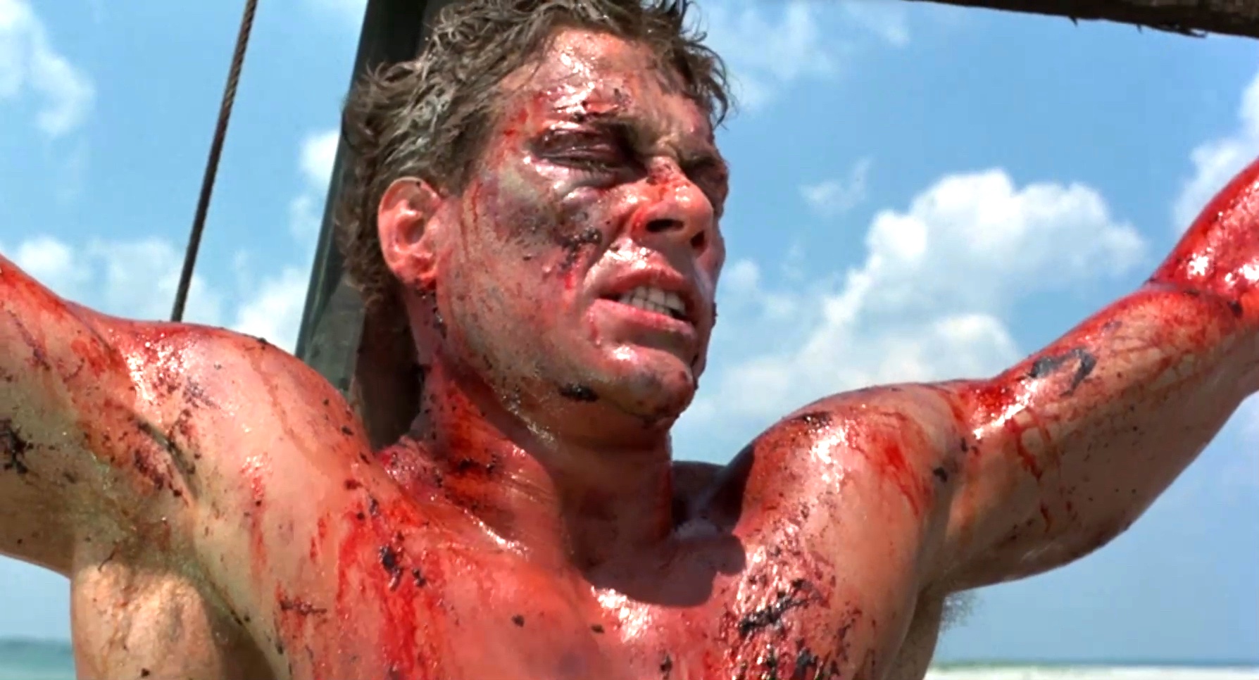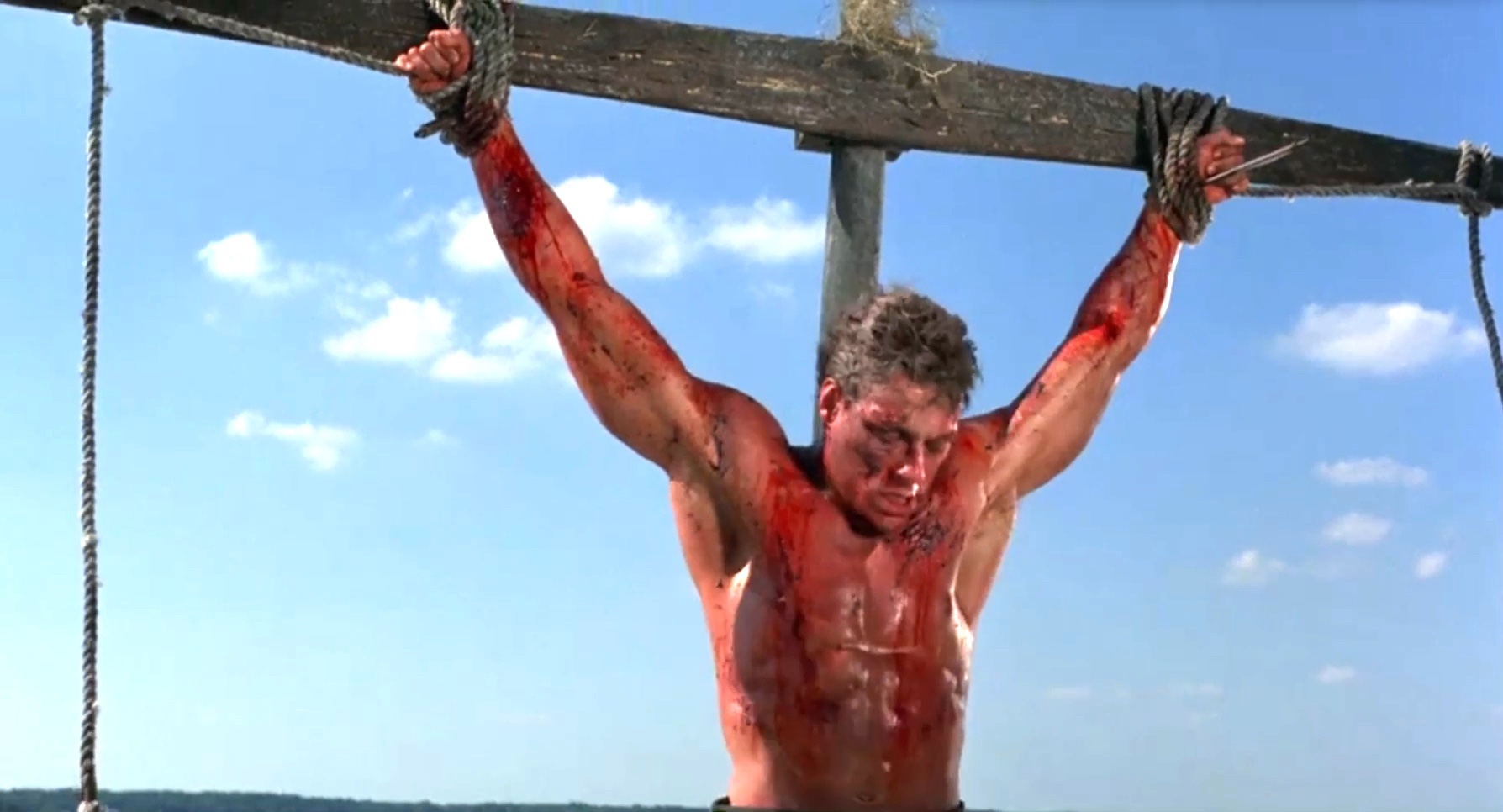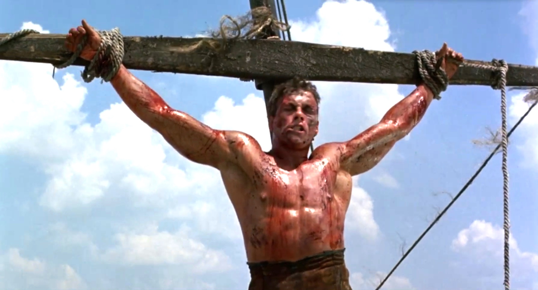 A mercenary is crucified on the mast of a ship by post-apocalyptic pirates.
