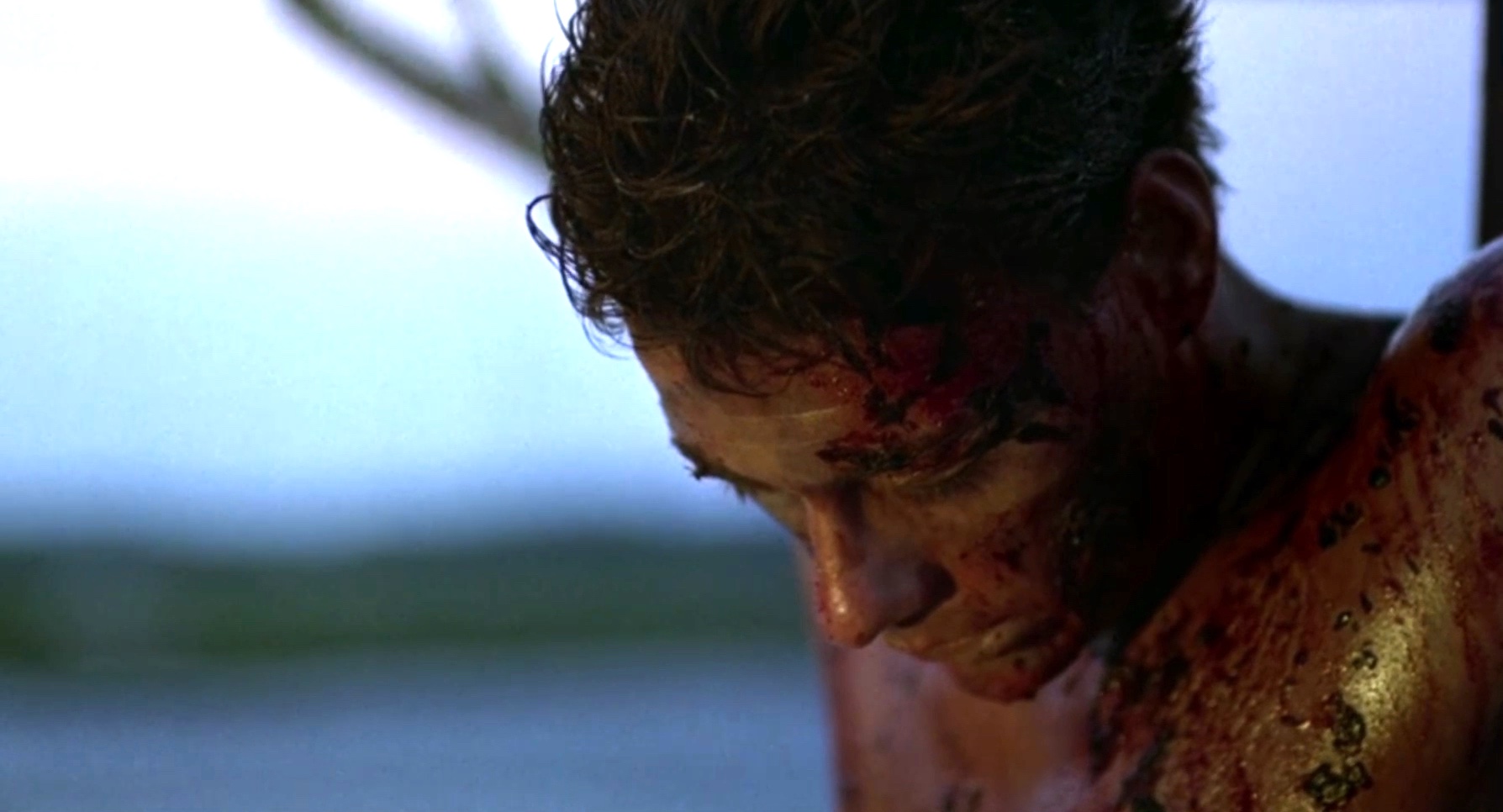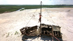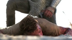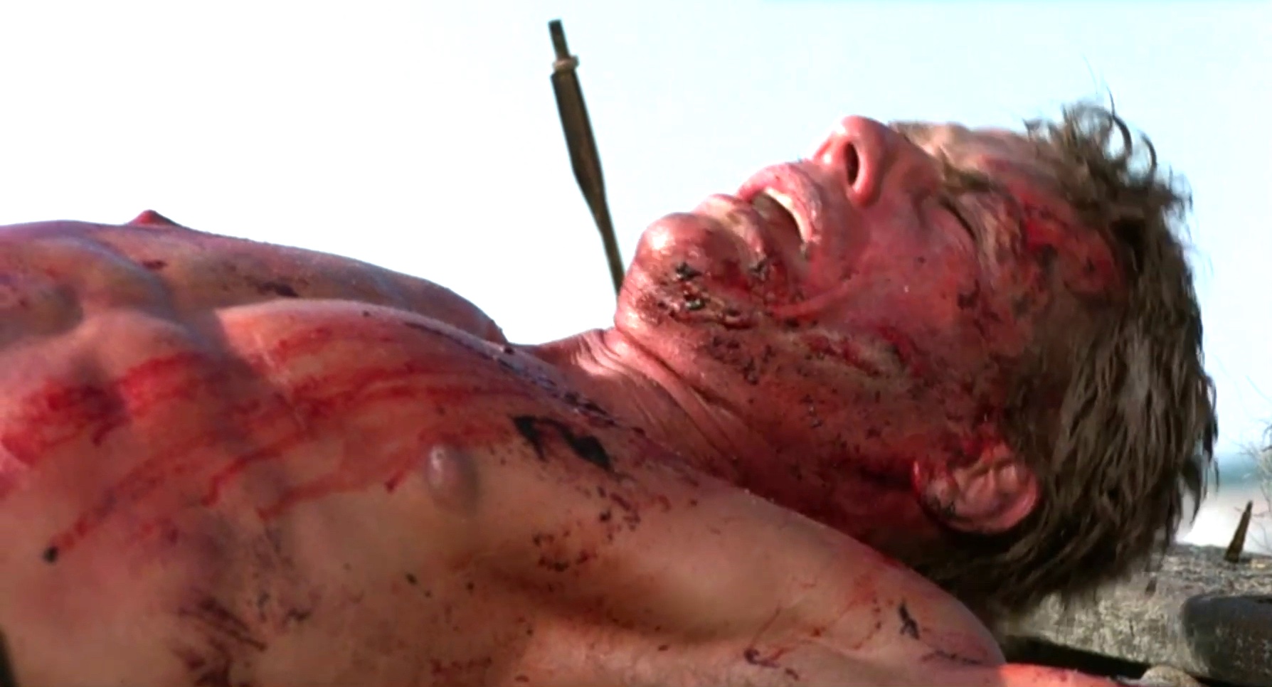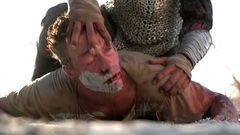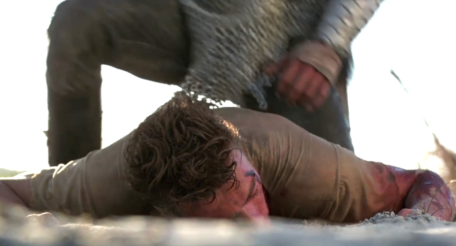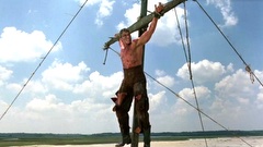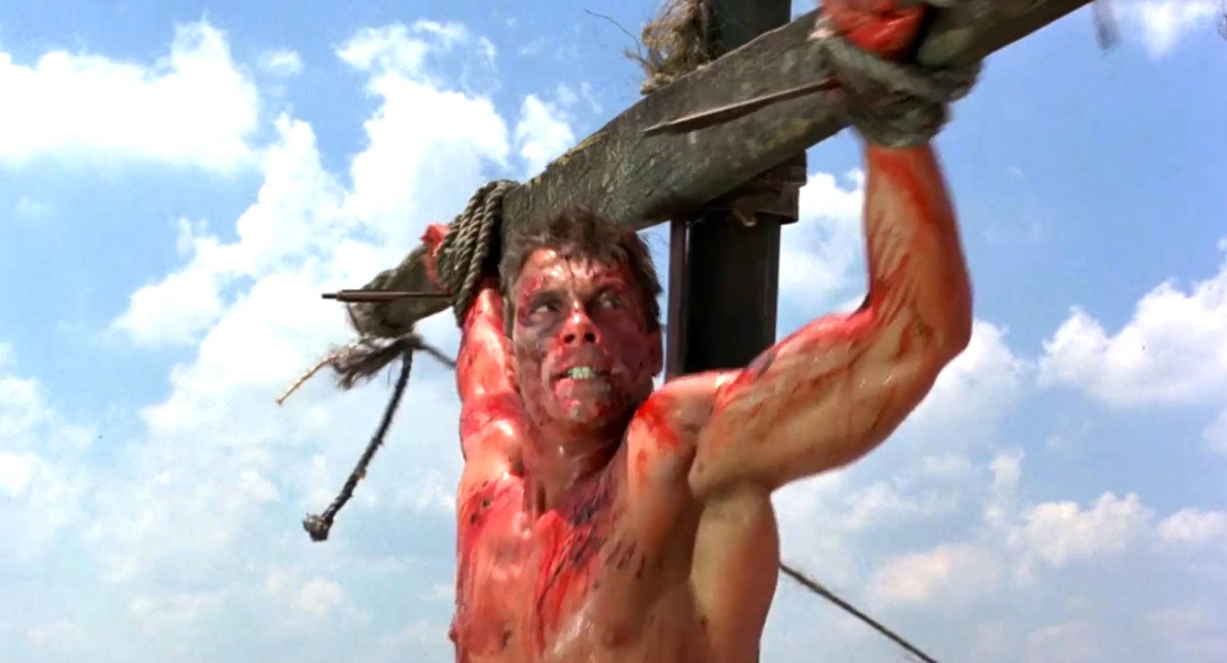 A mercenary is crucified on the mast of a ship by post-apocalyptic pirates.