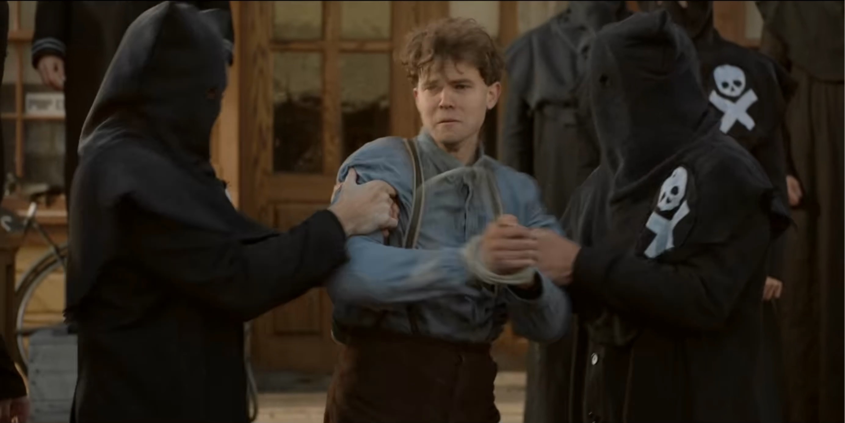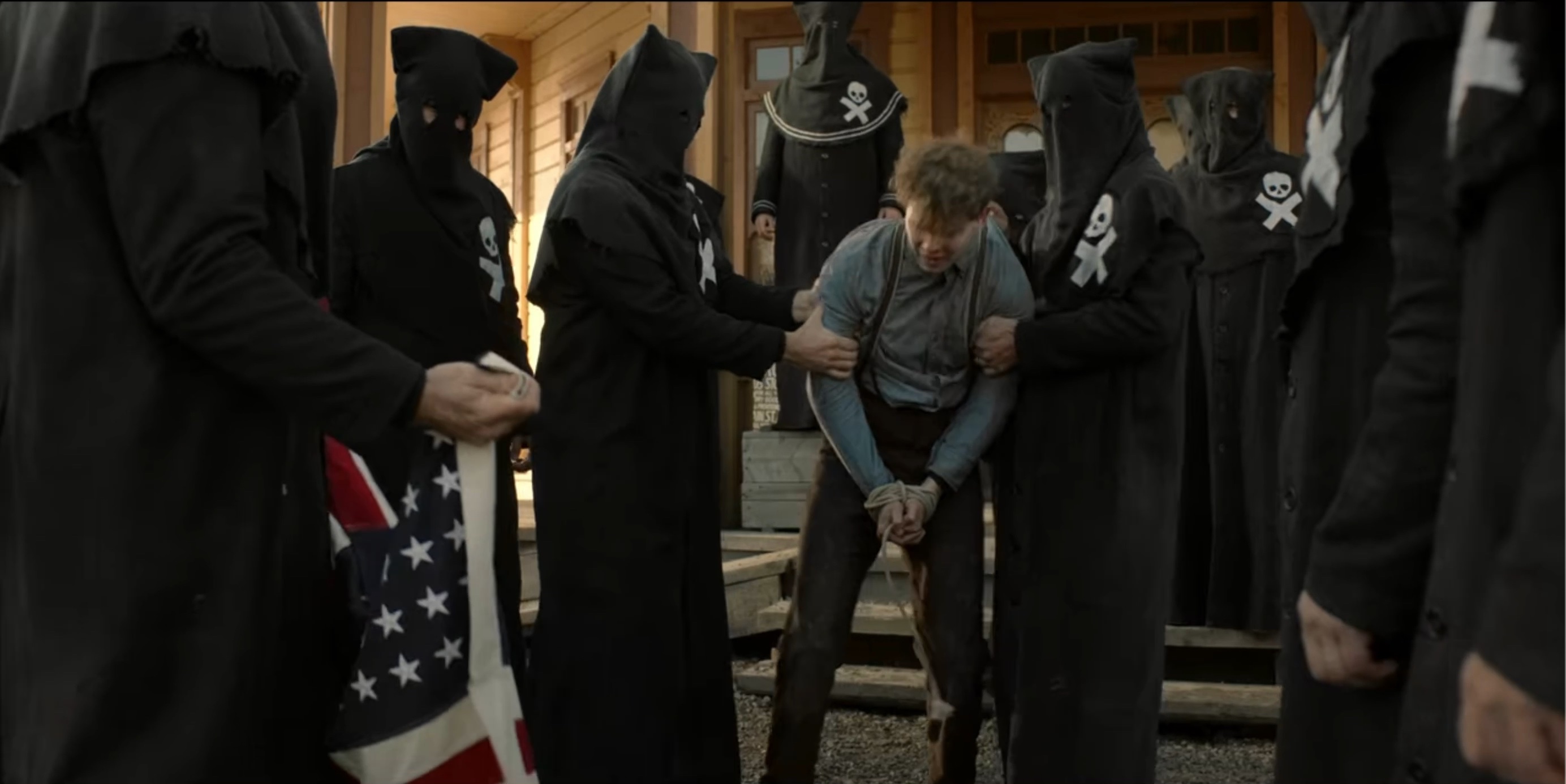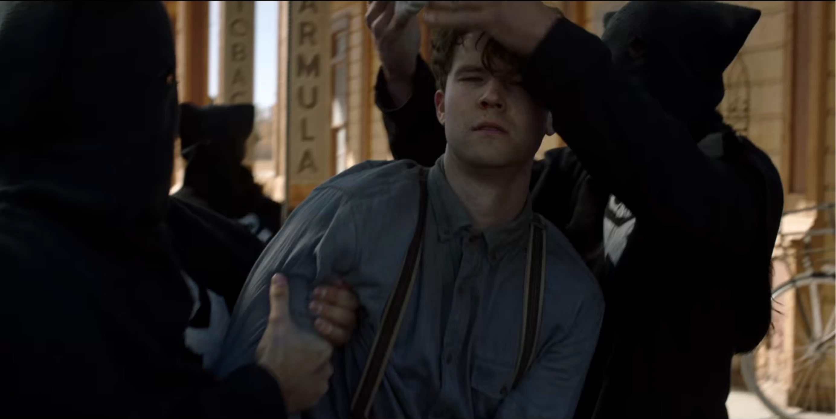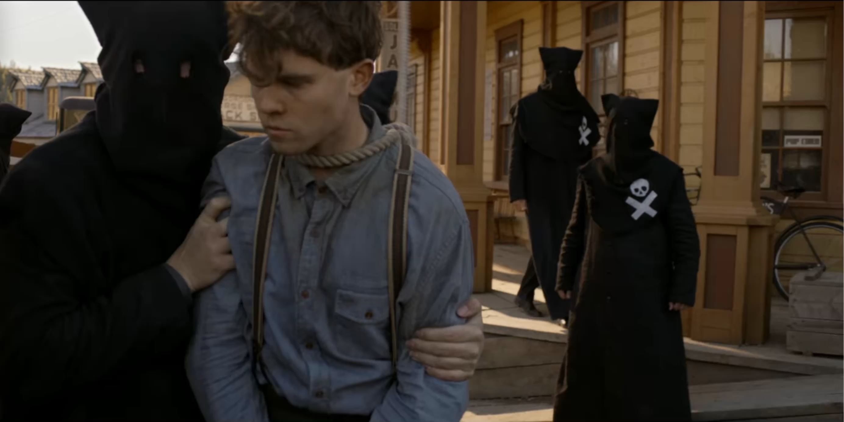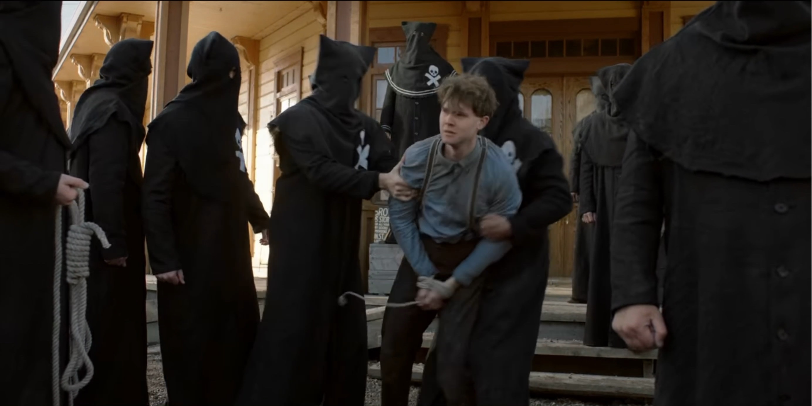 The Black Legion attempt to hang Sam Riley, Jr. (Mead). When Seth (Scott) is discovered posing as a member of the Legion they also plan to hang him.