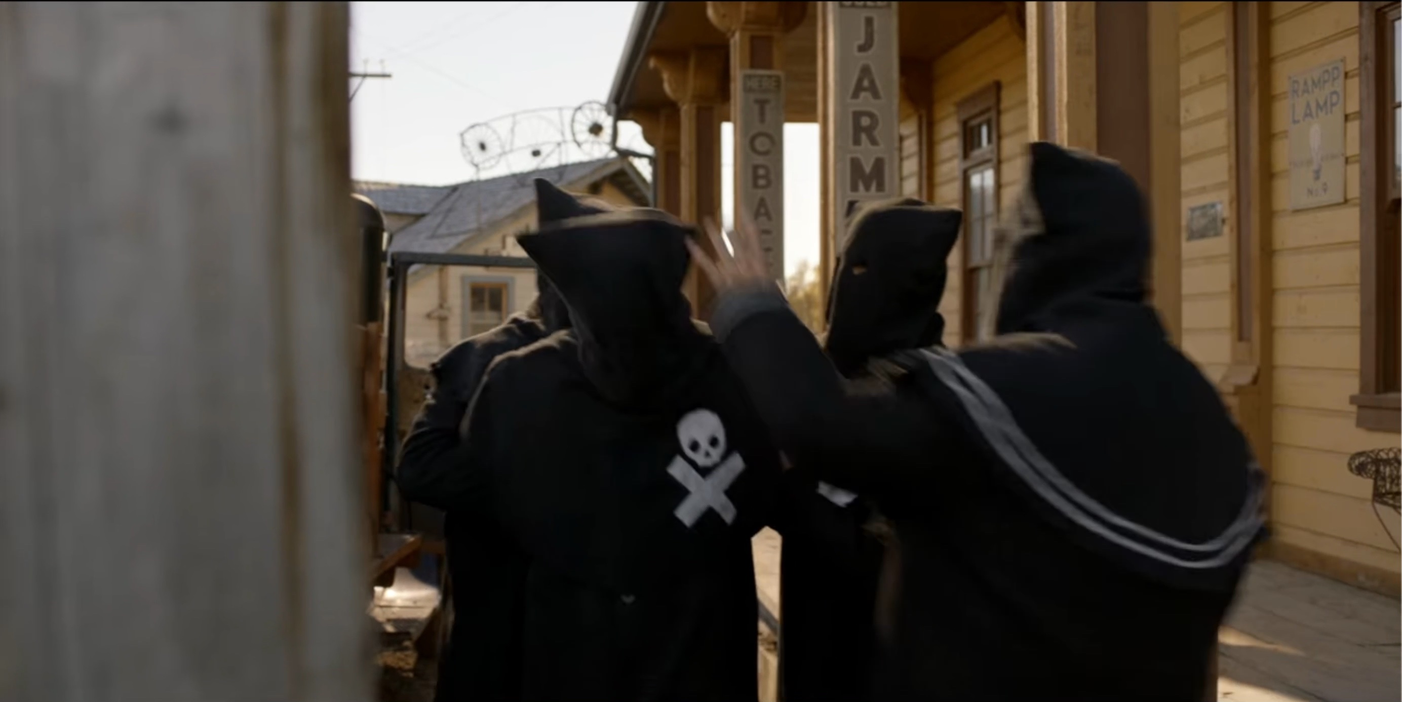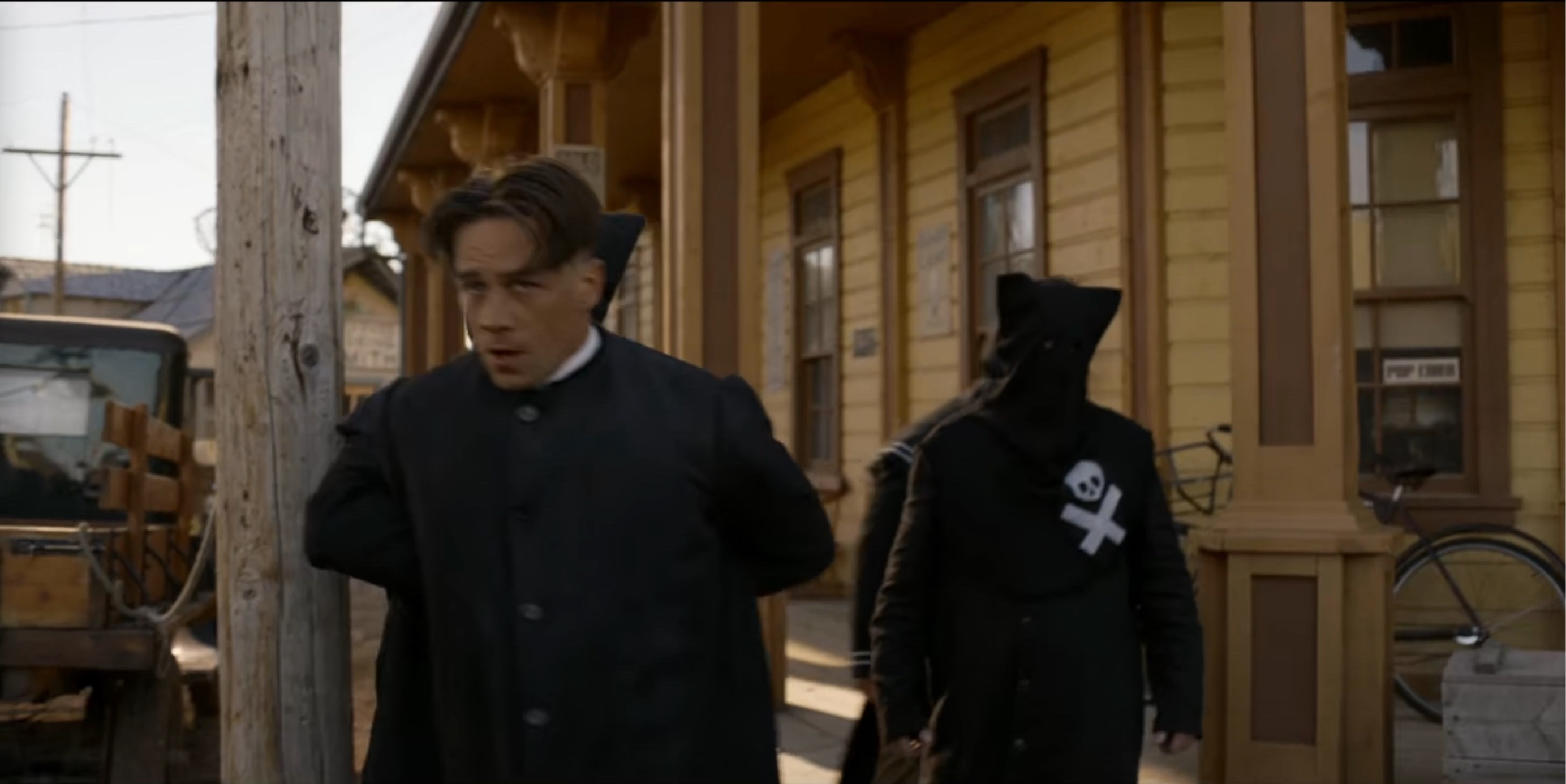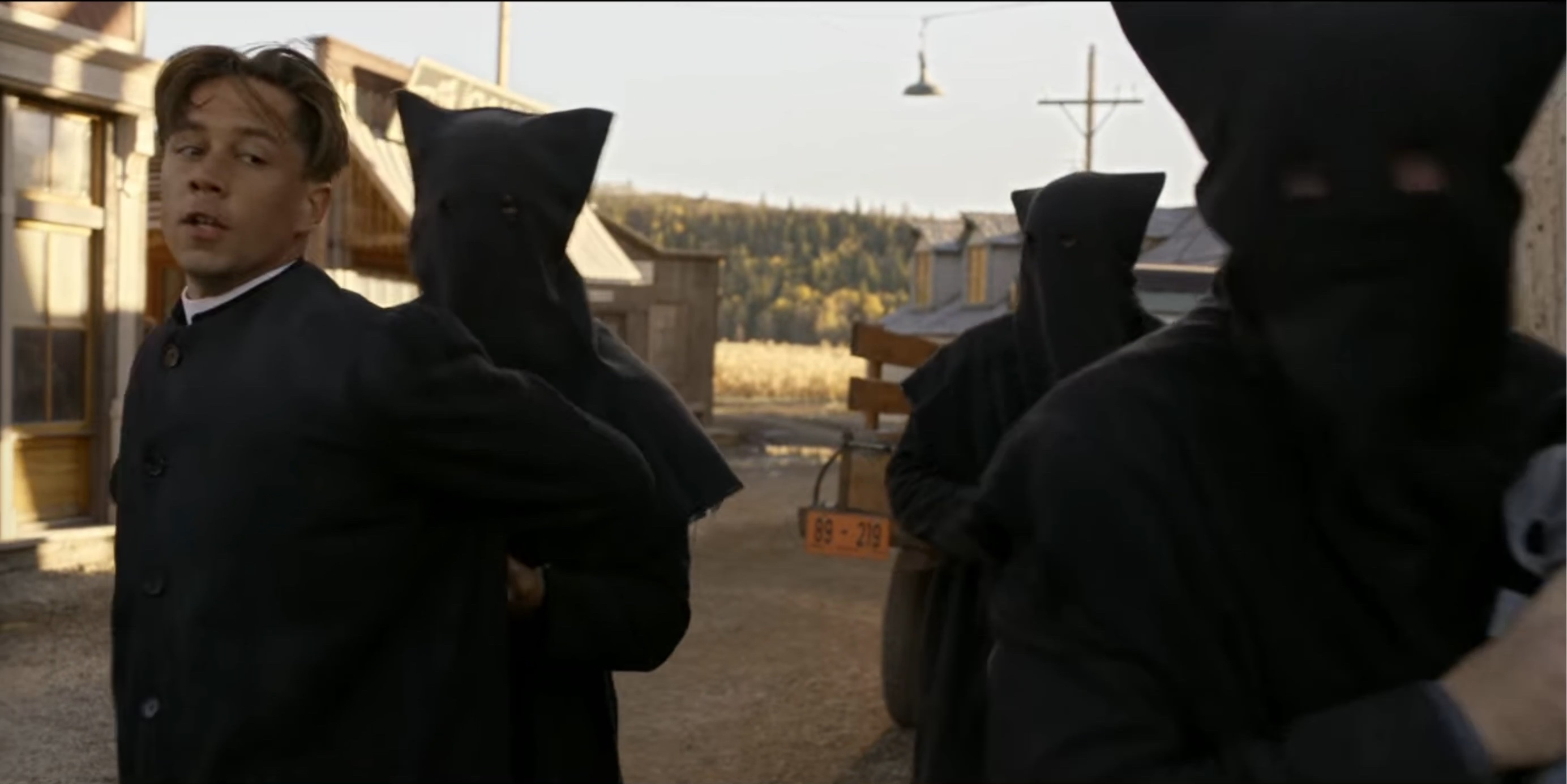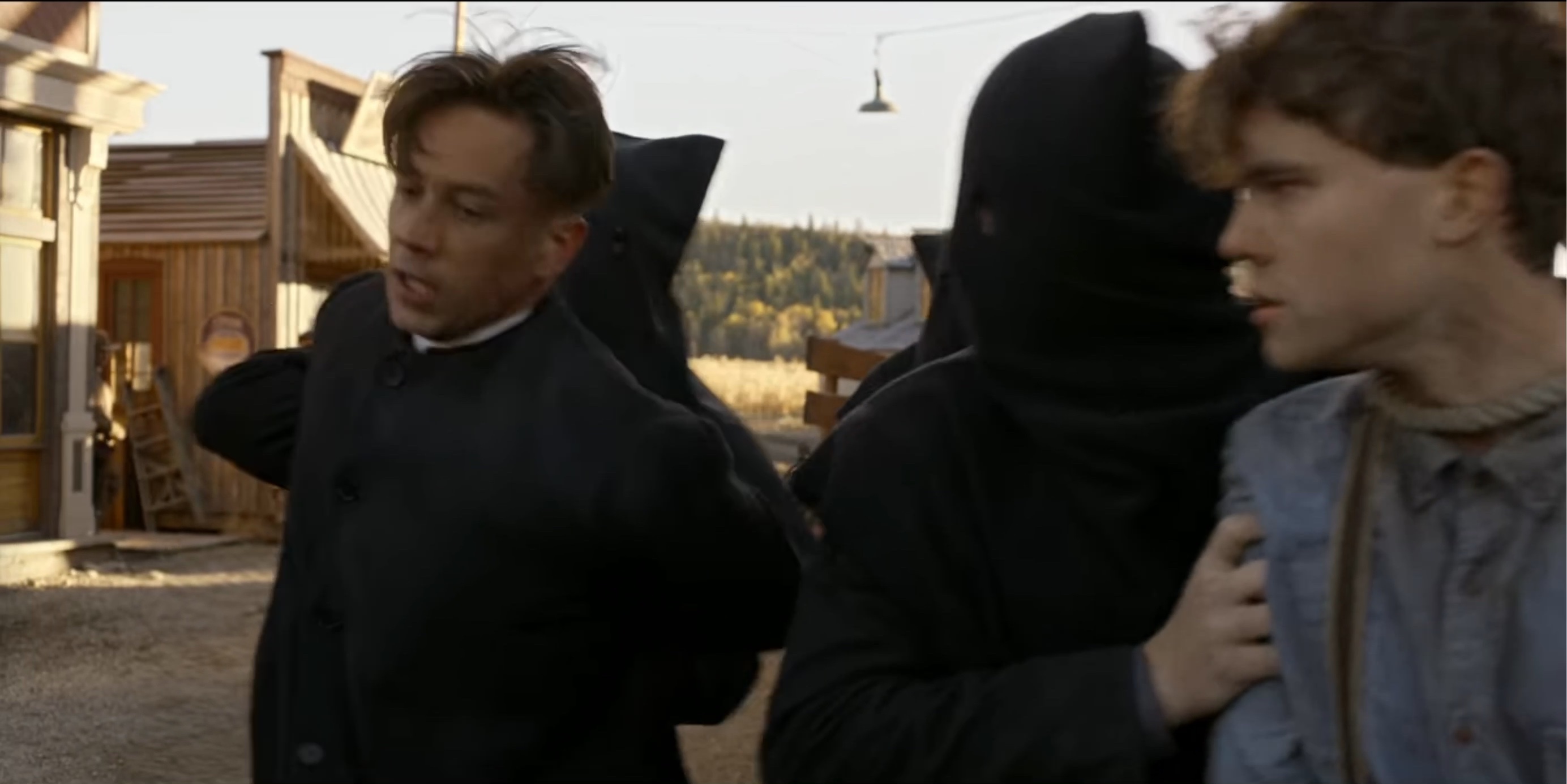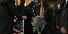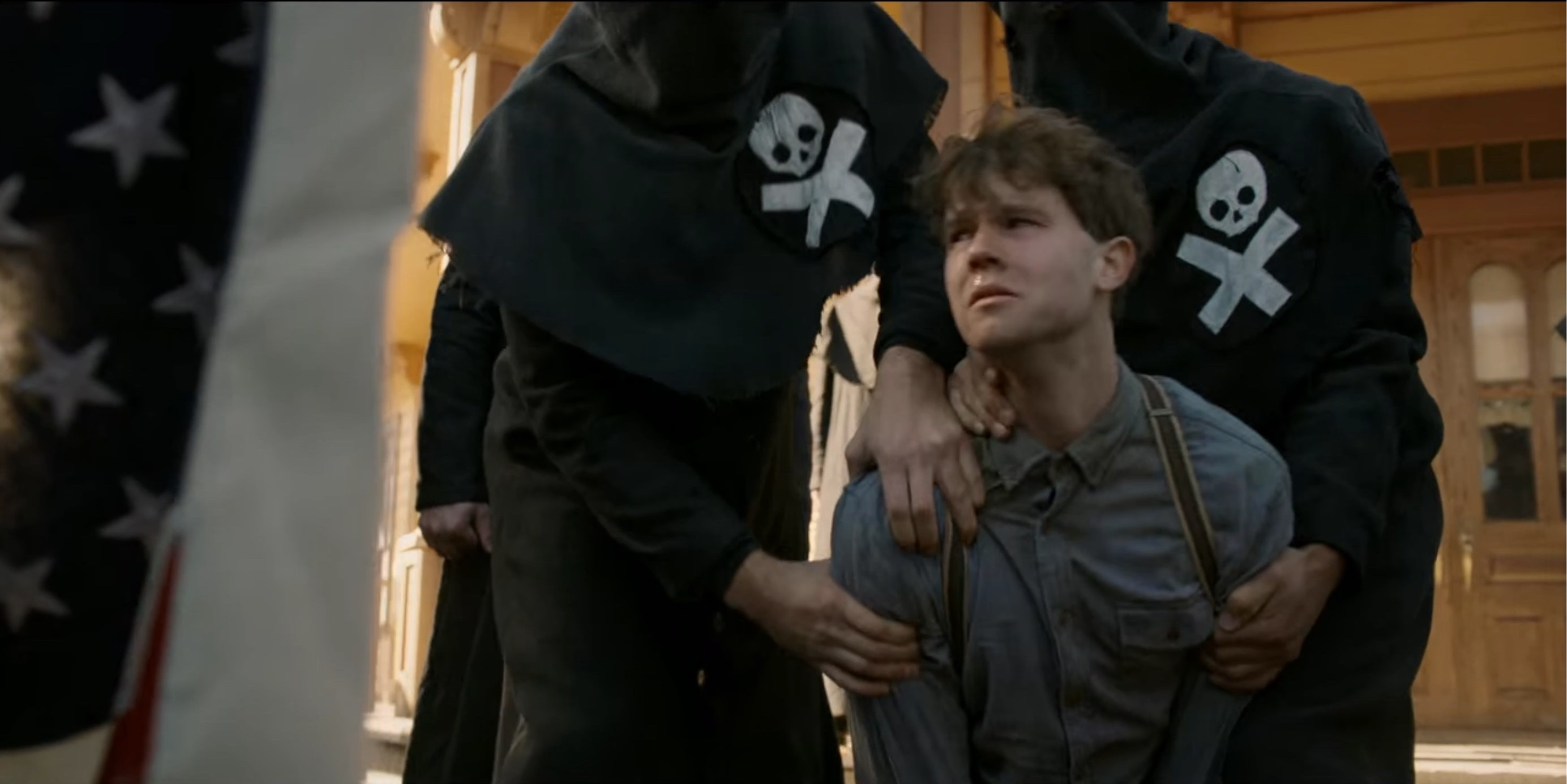 The Black Legion attempt to hang Sam Riley, Jr. (Mead). When Seth (Scott) is discovered posing as a member of the Legion they also plan to hang him.
