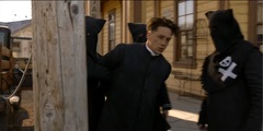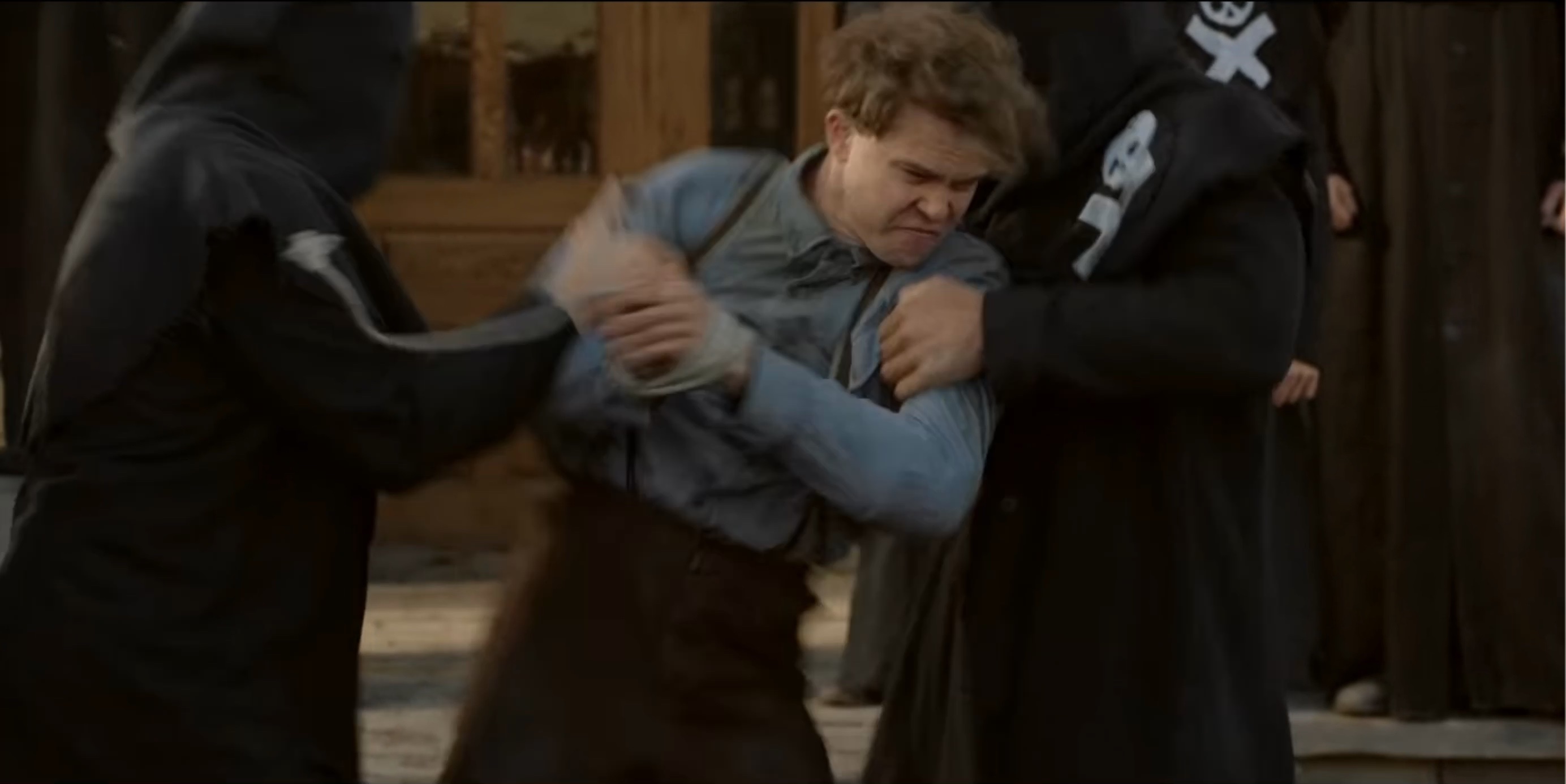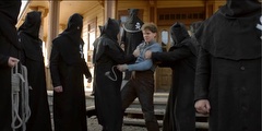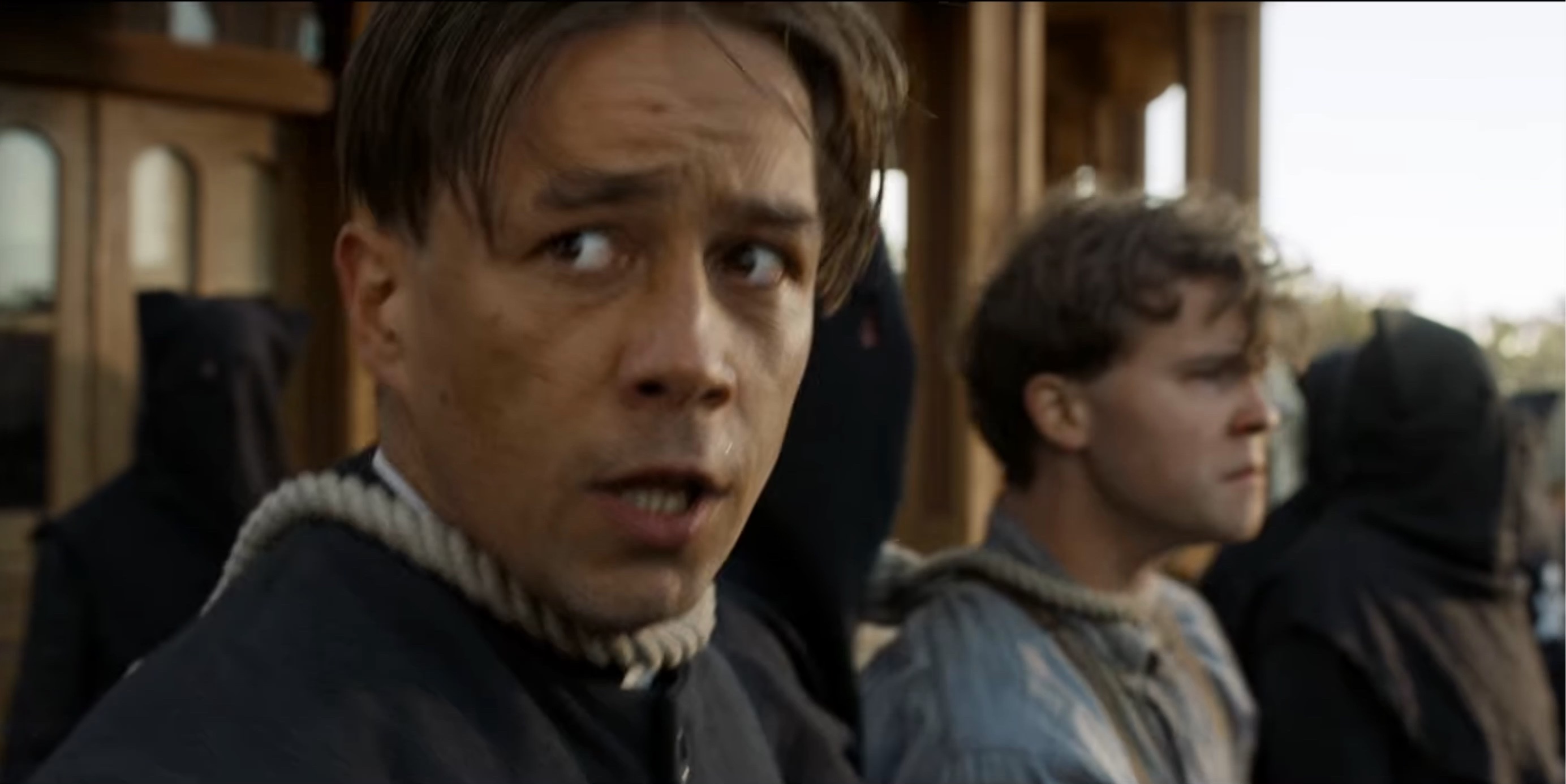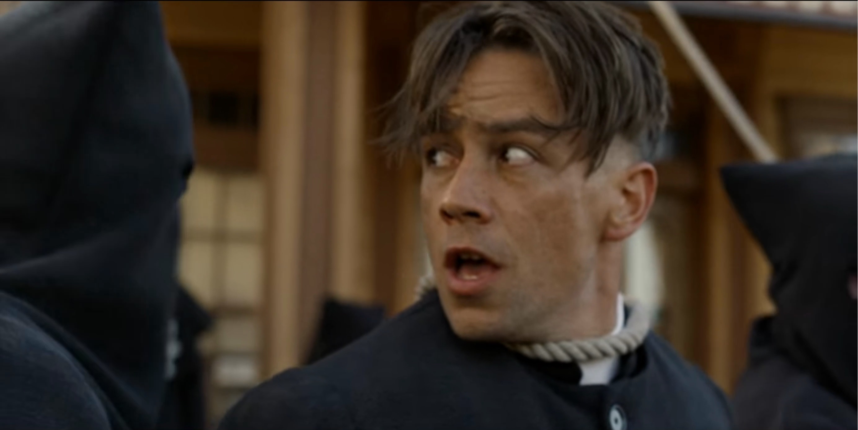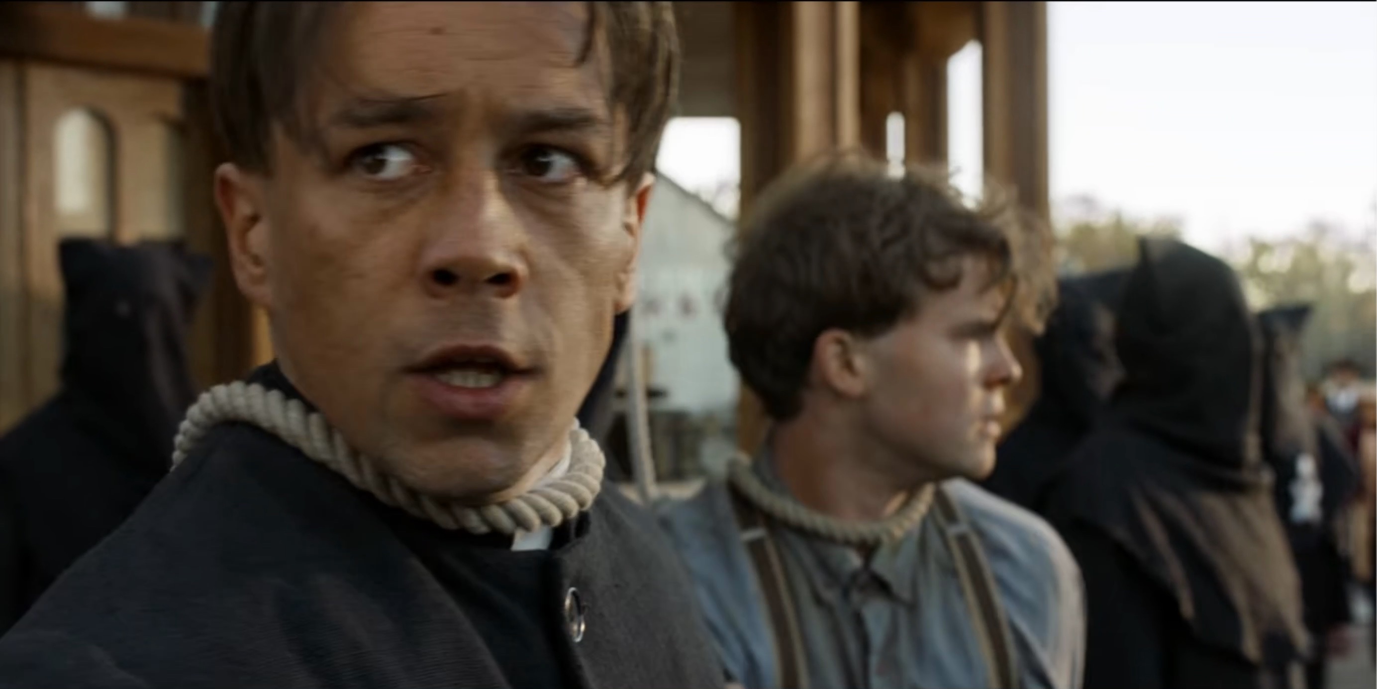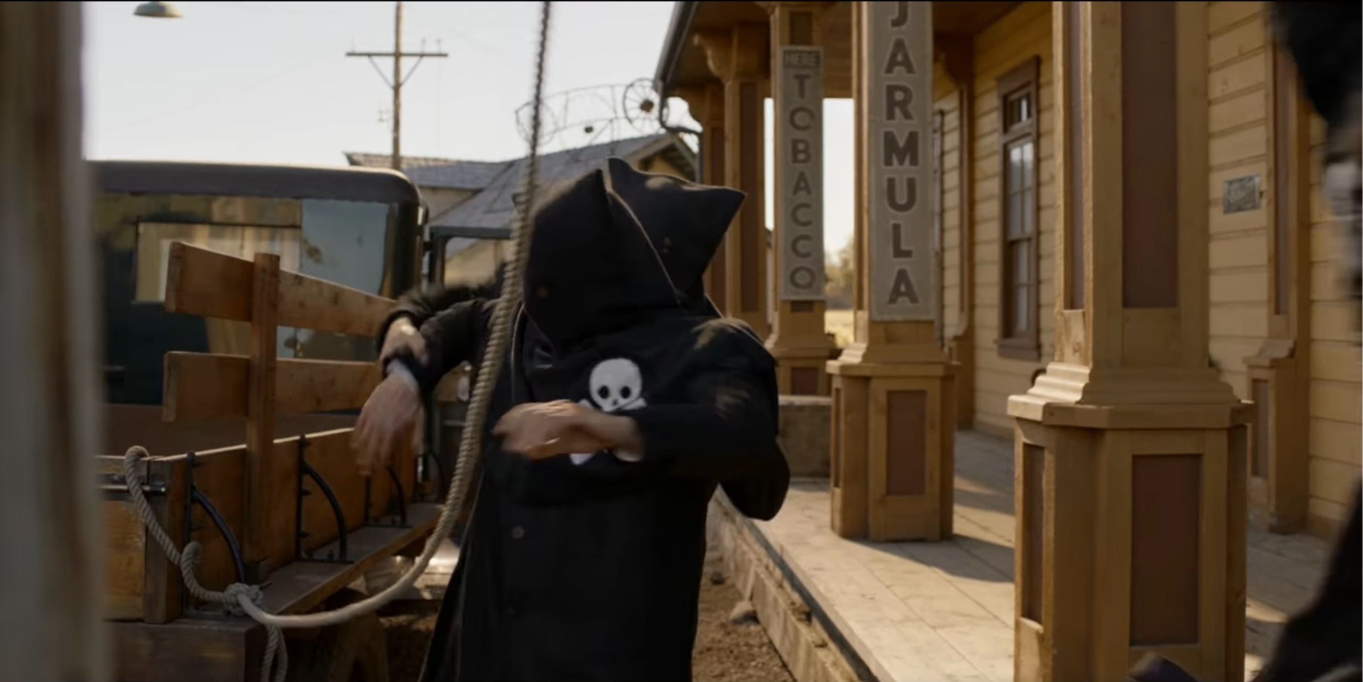 The Black Legion attempt to hang Sam Riley, Jr. (Mead). When Seth (Scott) is discovered posing as a member of the Legion they also plan to hang him.