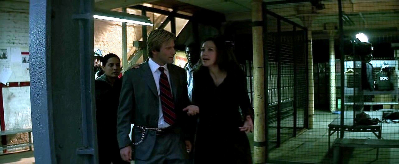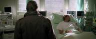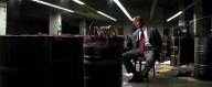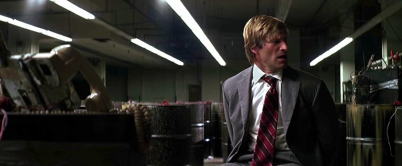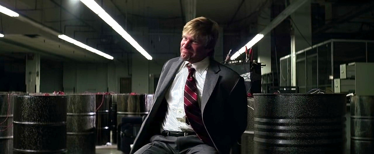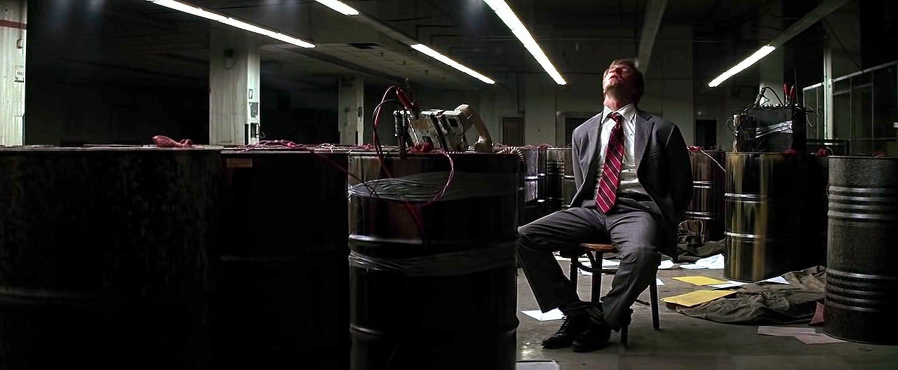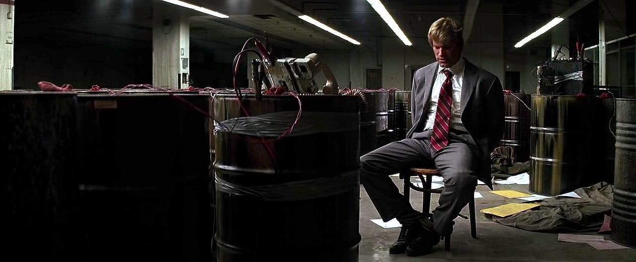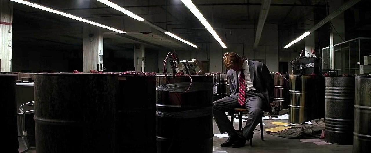 Harvey Dent is tied up near some oil drums by the Joker, where a mishap turns him into Two-Face.