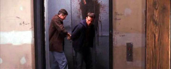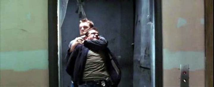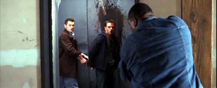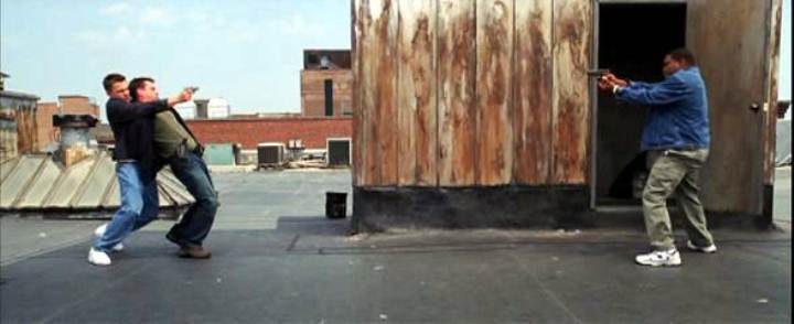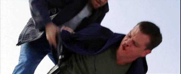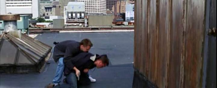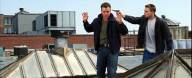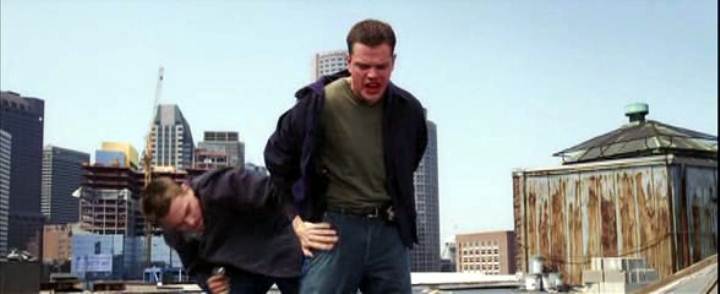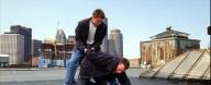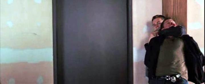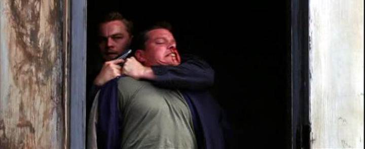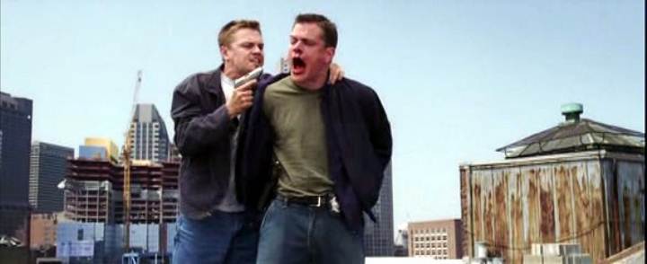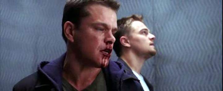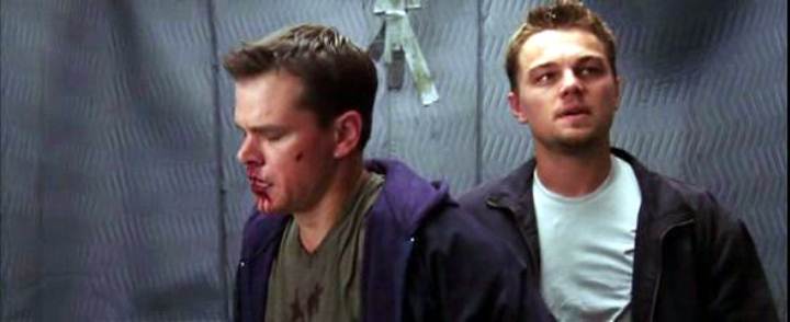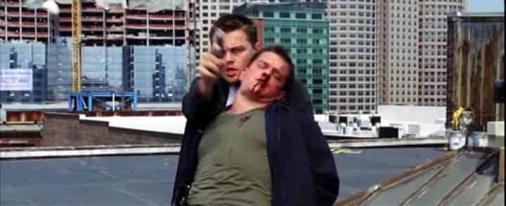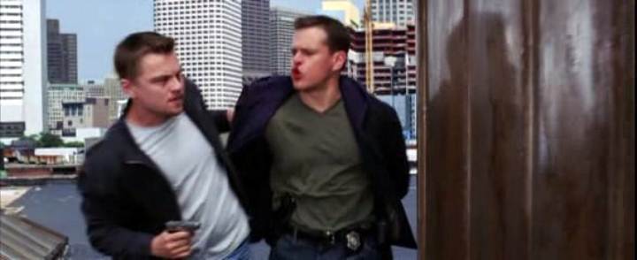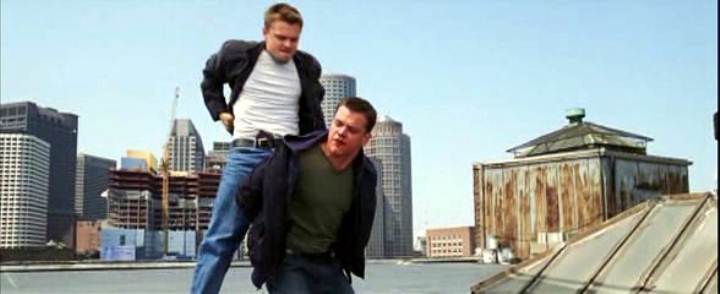 Leonardo DiCaprio handcuffs Matt Damon on a roof in this story of police moles and double-crosses.