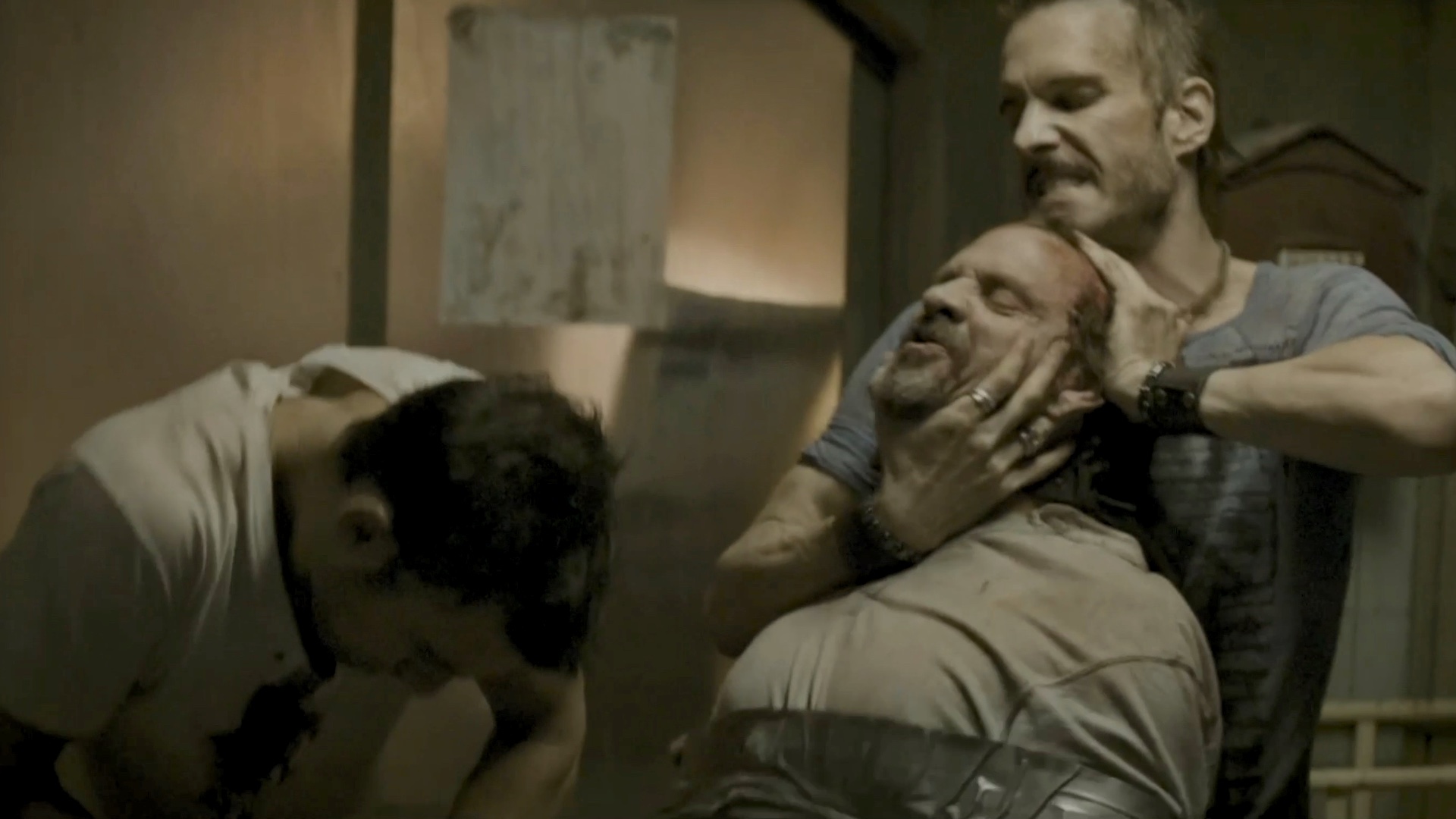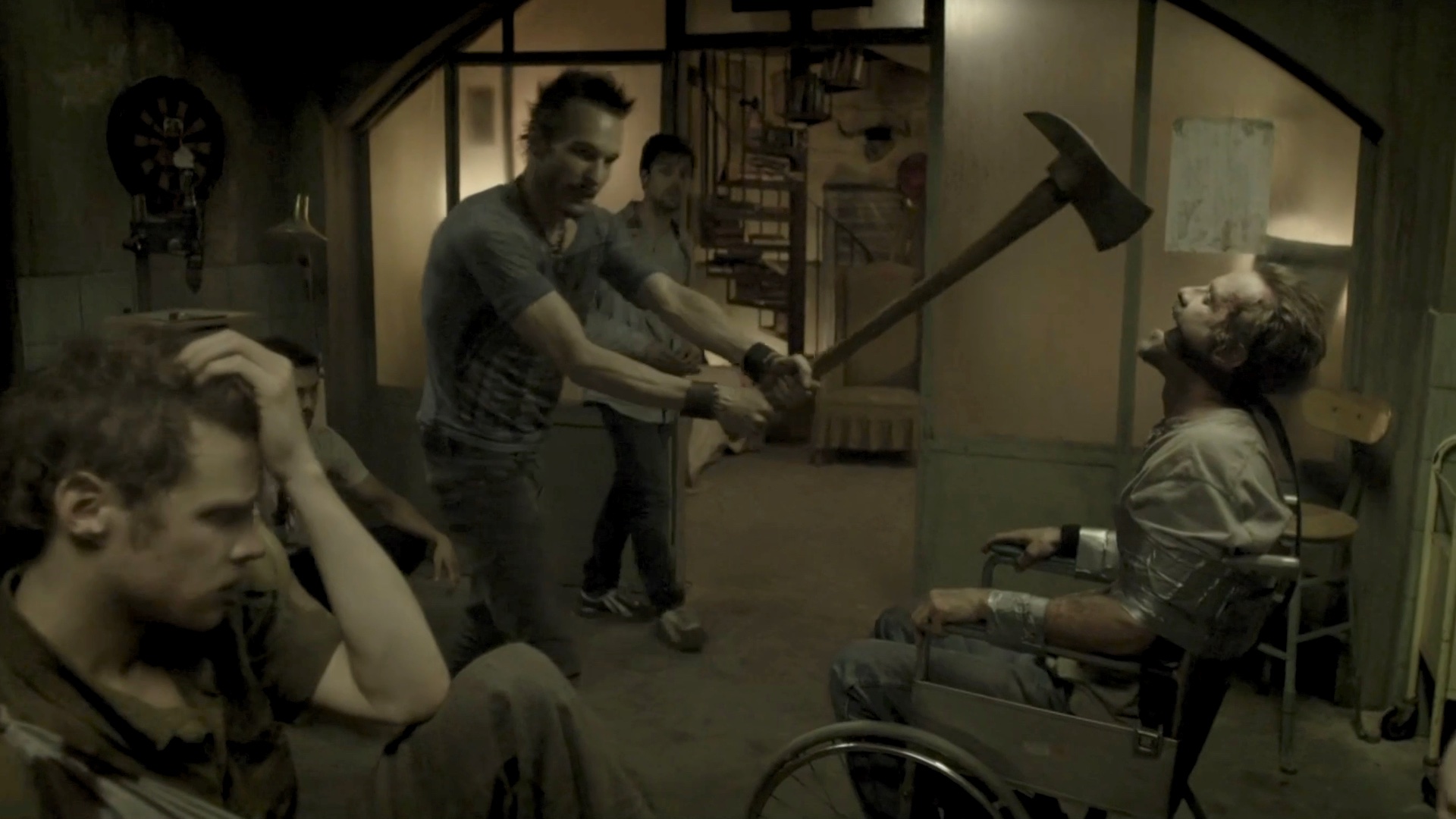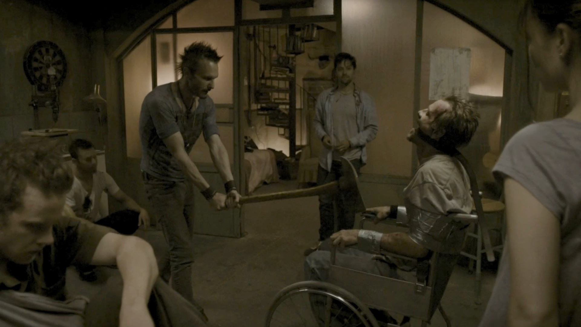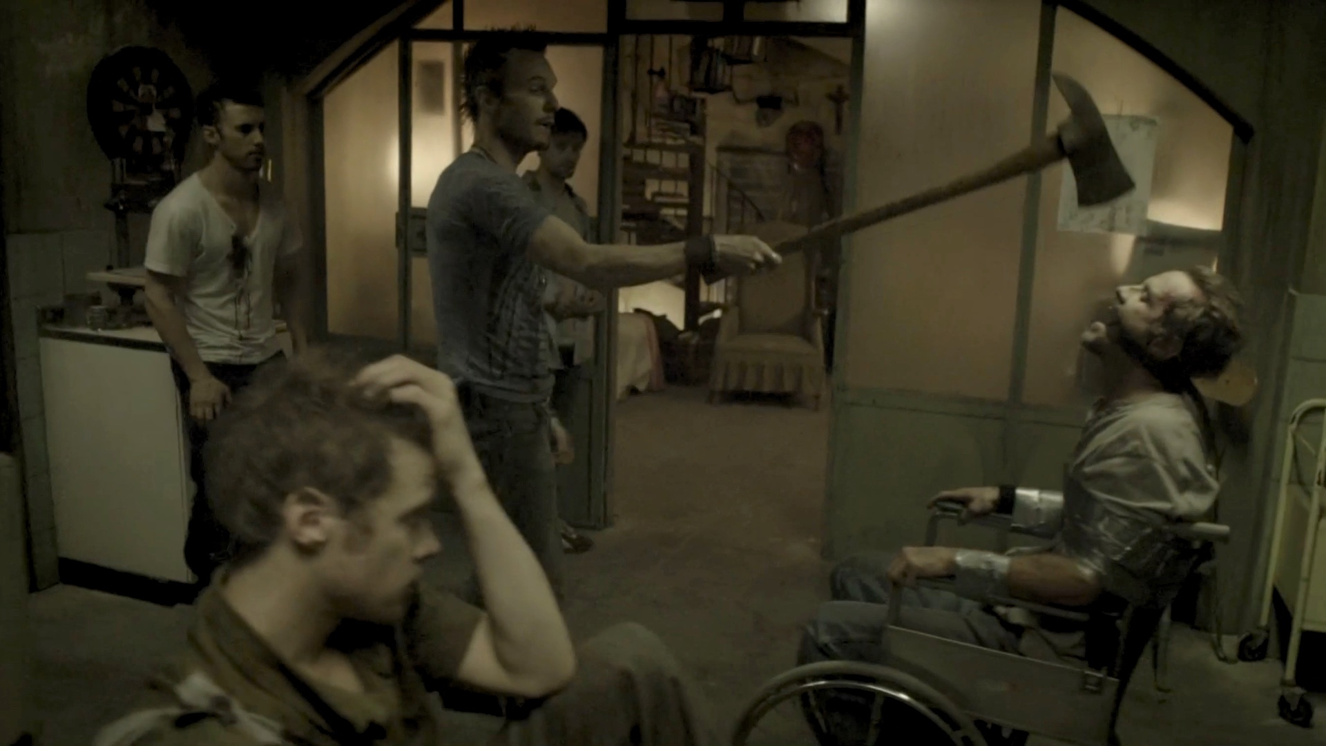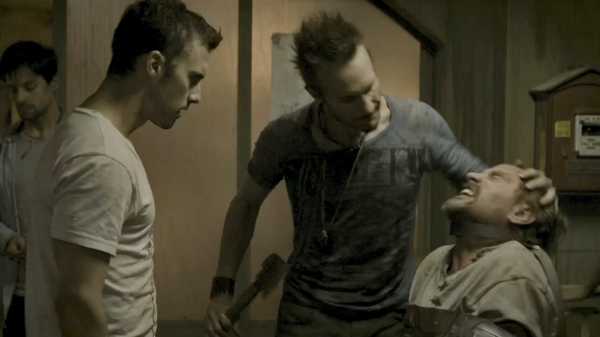 One of a group of survivors is tortured by some of the others.