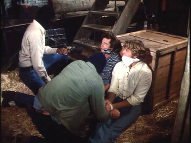 Boss Hogg's cohorts keep the boys tied up while they give the General Lee a "tune-down".