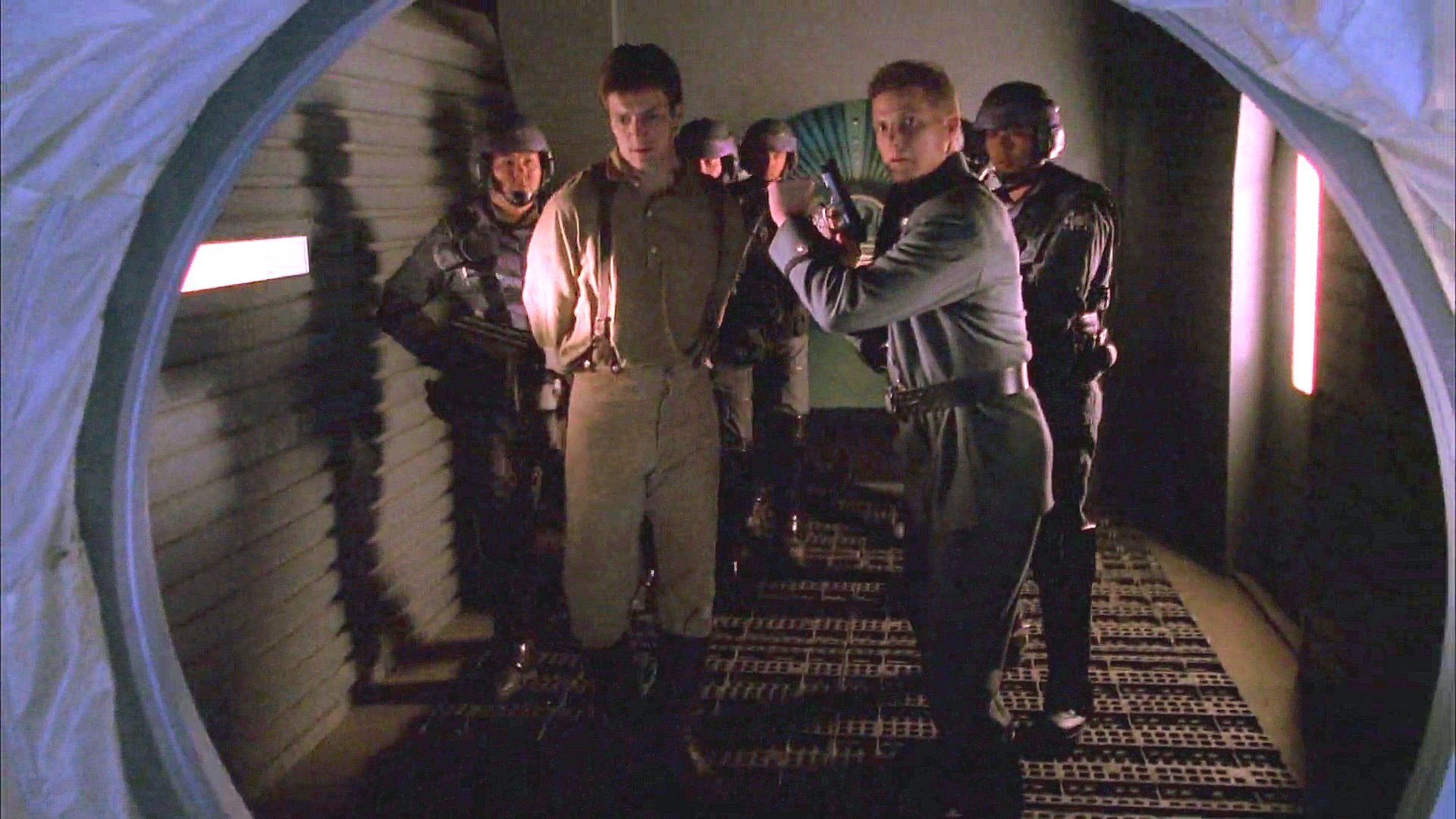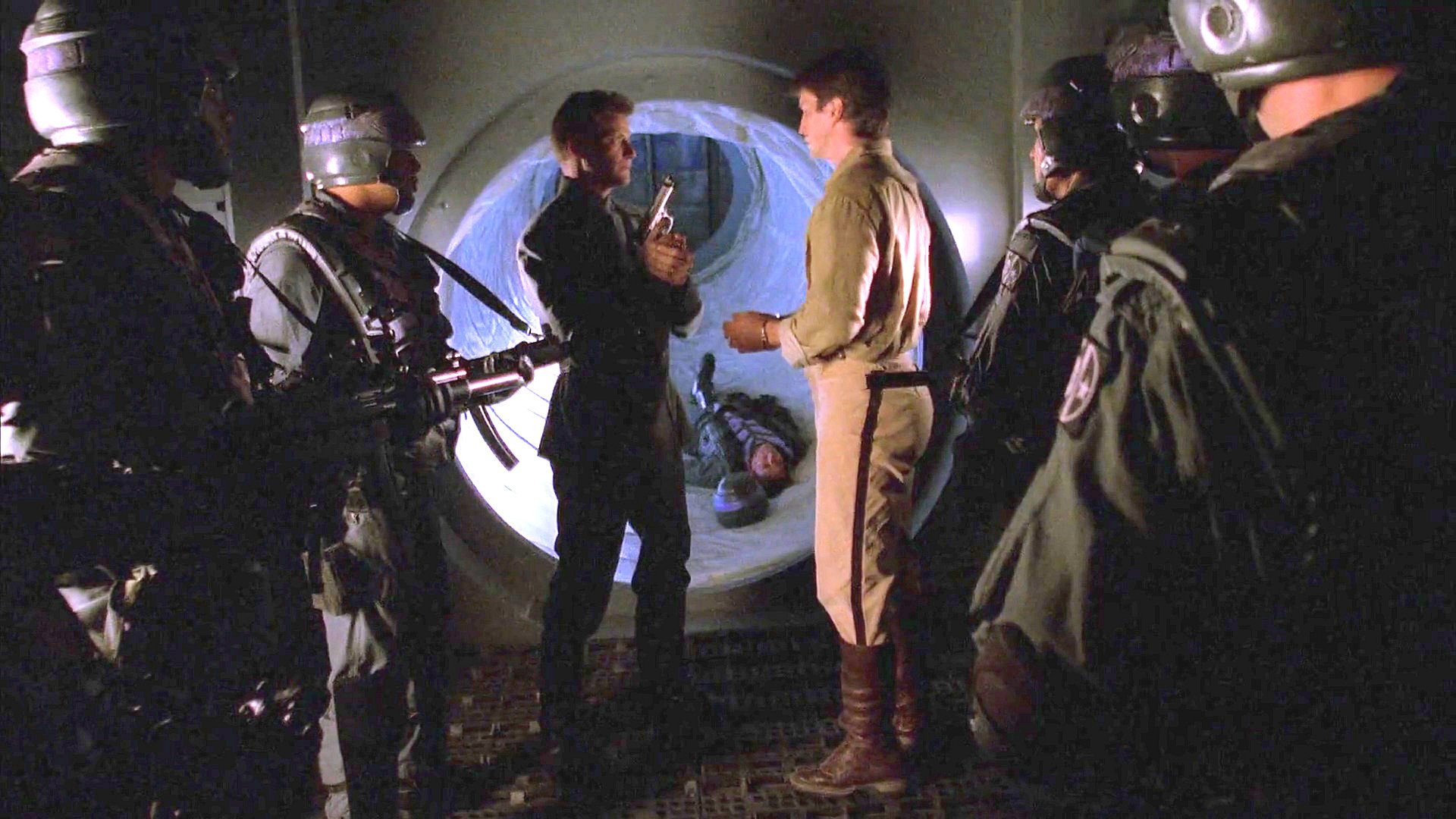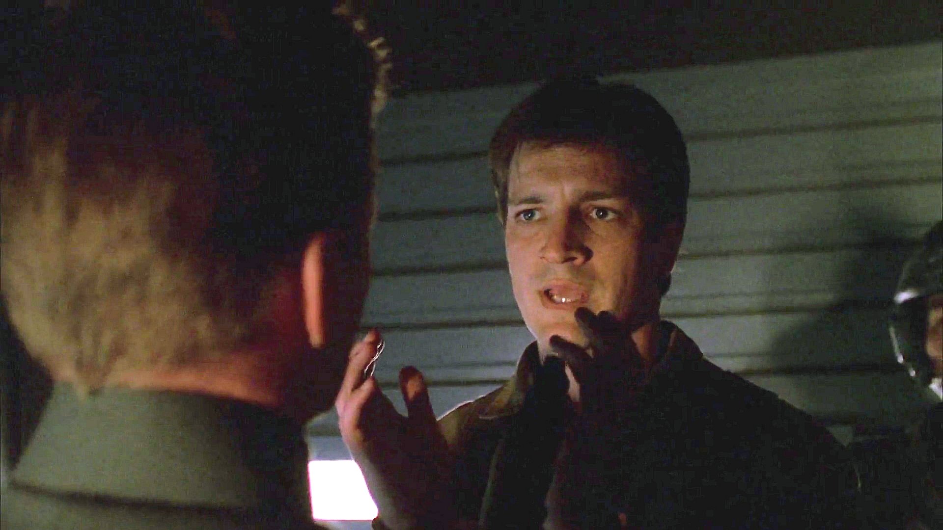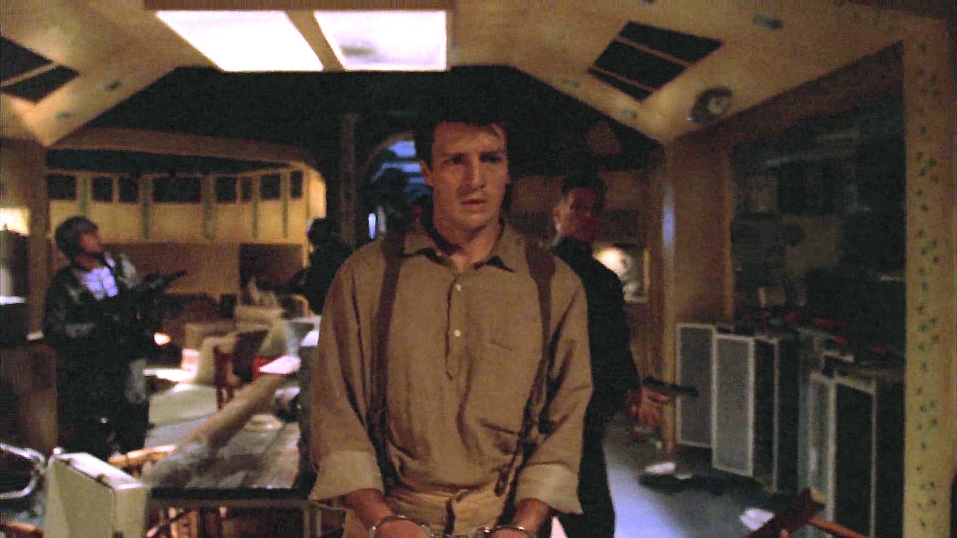 Mal searches the ship along with an Alliance team to find a Reaver. Mal objects to having his hands cuffed behind his back, at which point