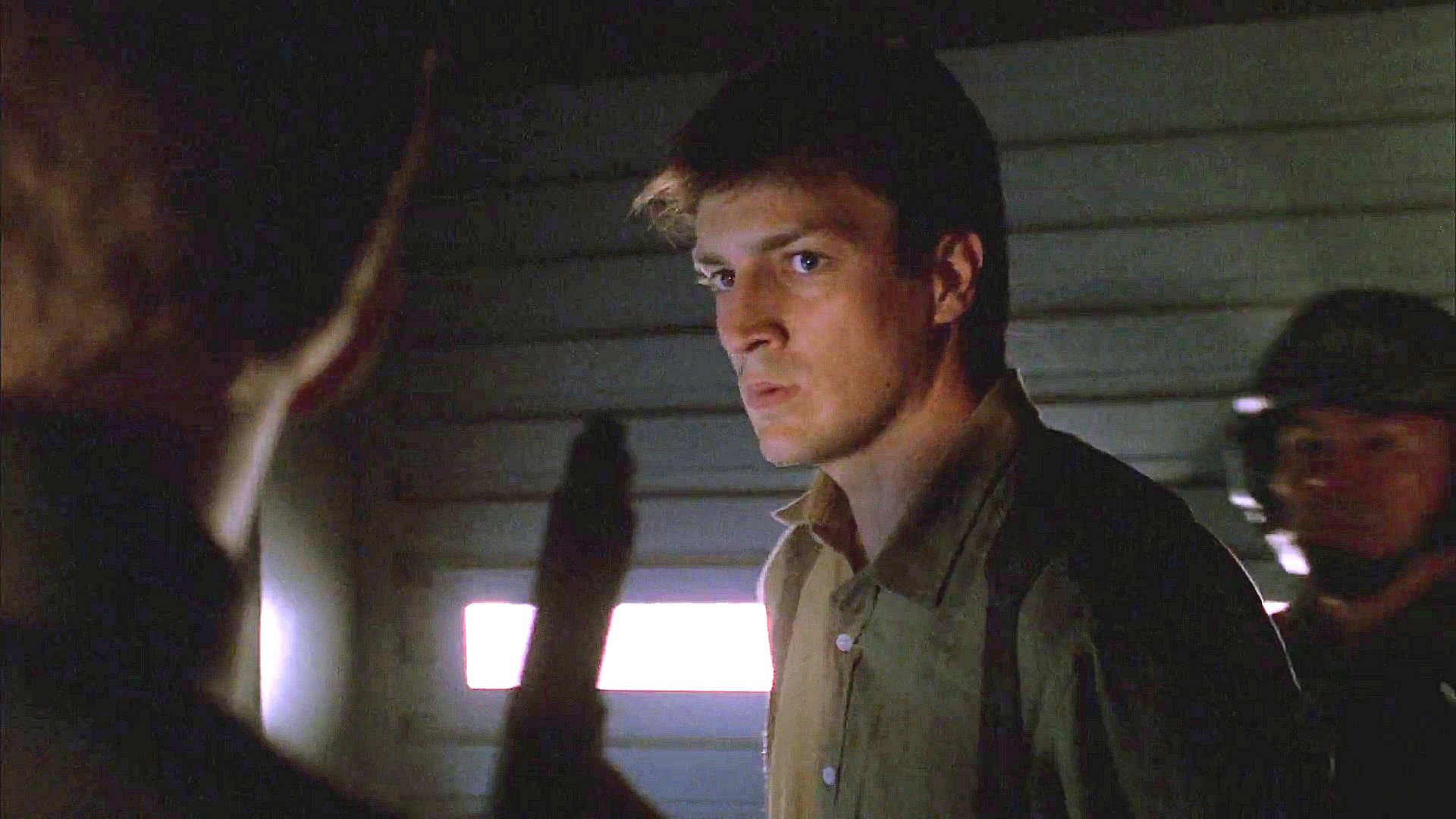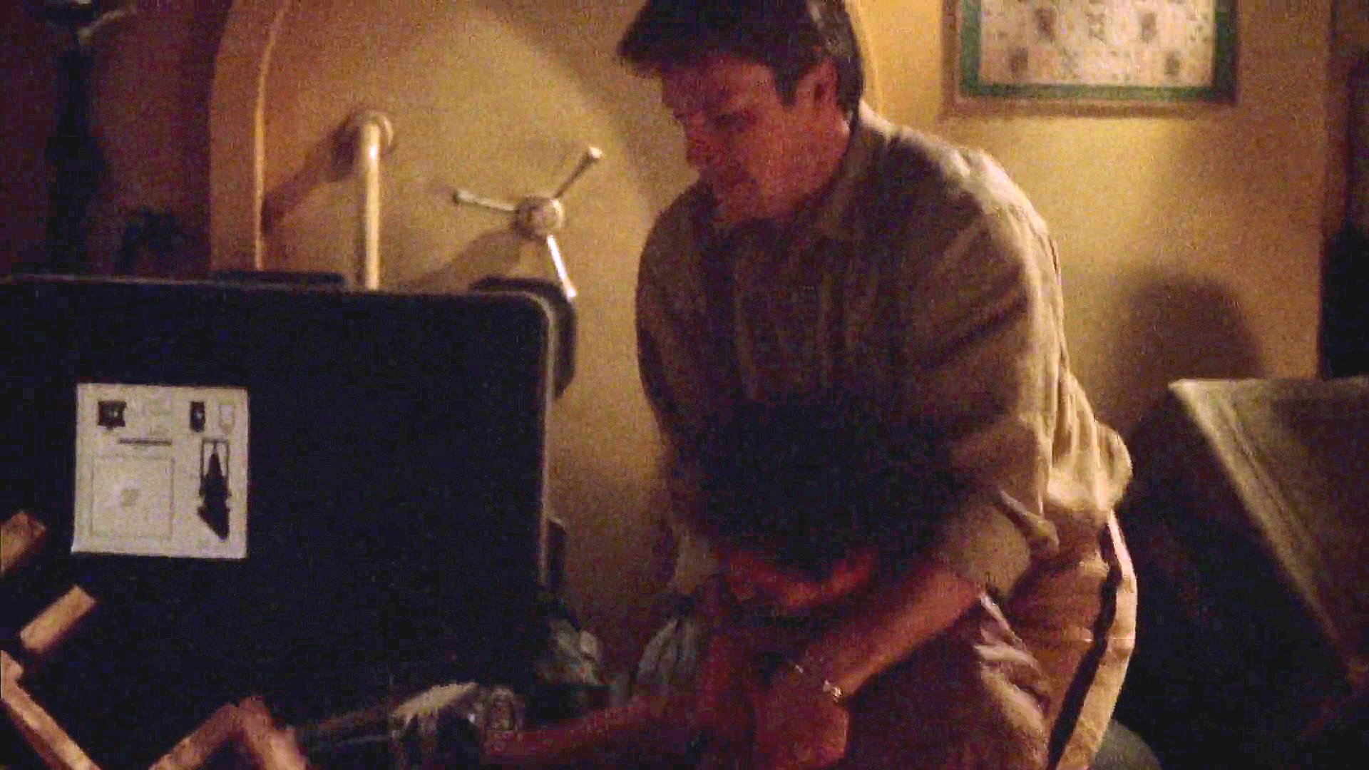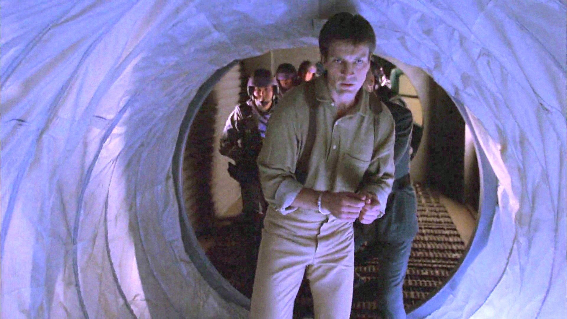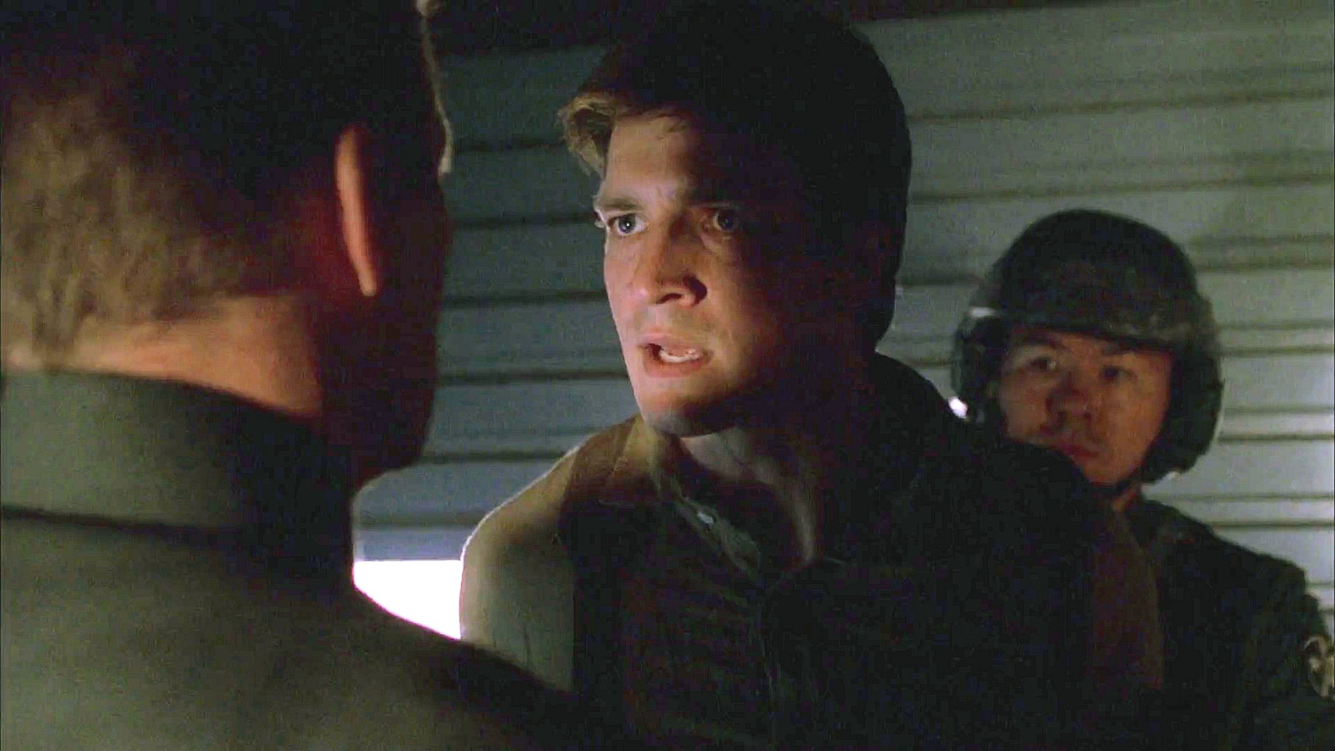 Mal searches the ship along with an Alliance team to find a Reaver. Mal objects to having his hands cuffed behind his back, at which point