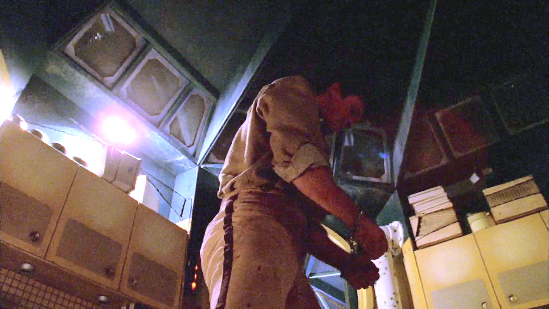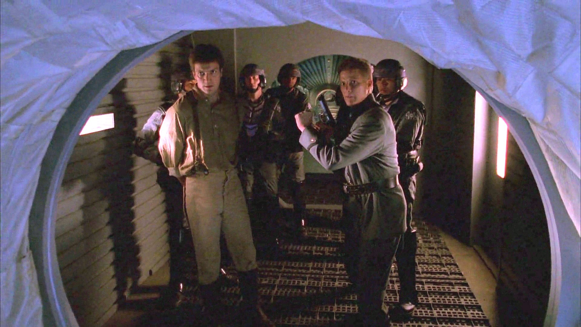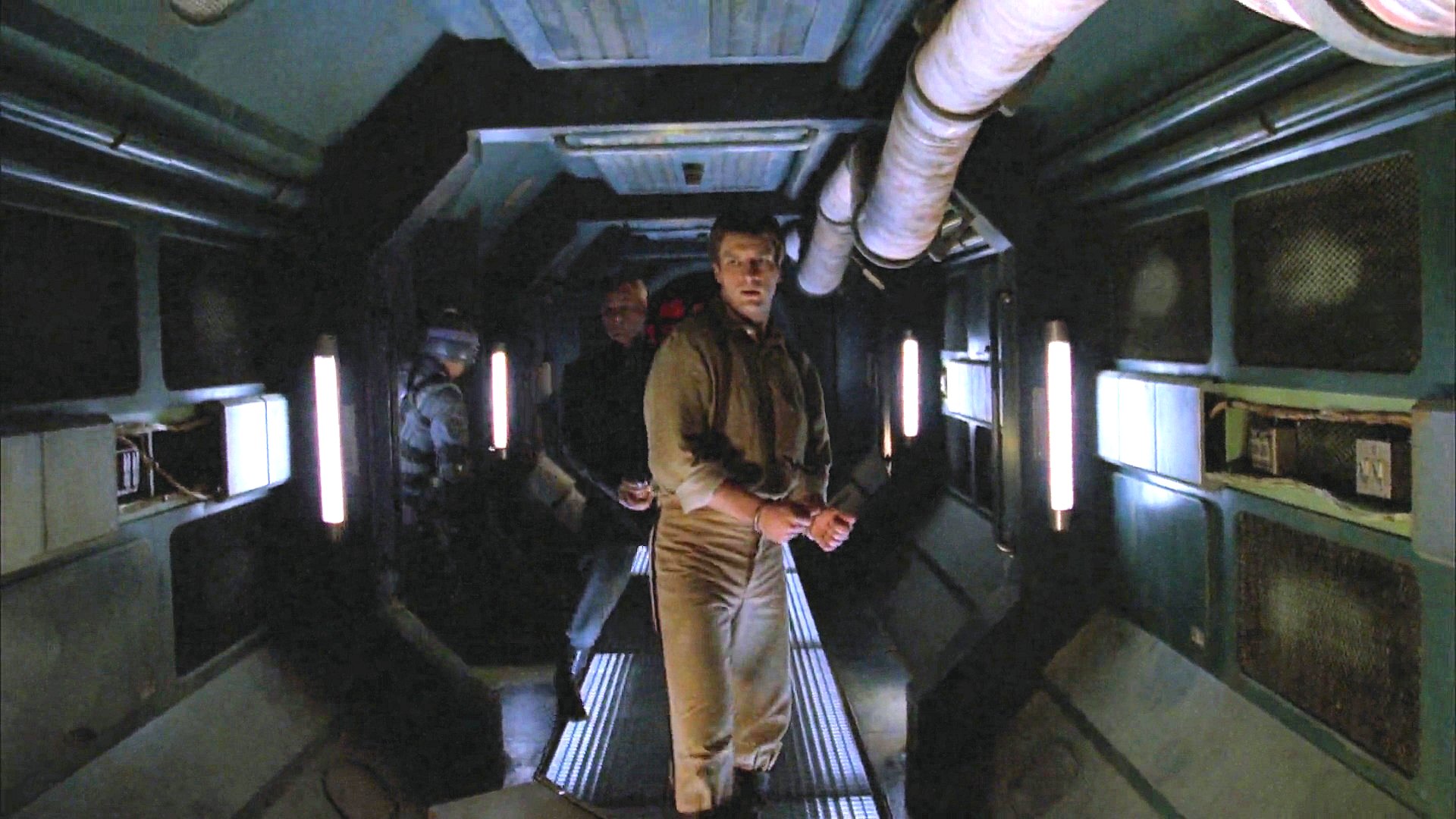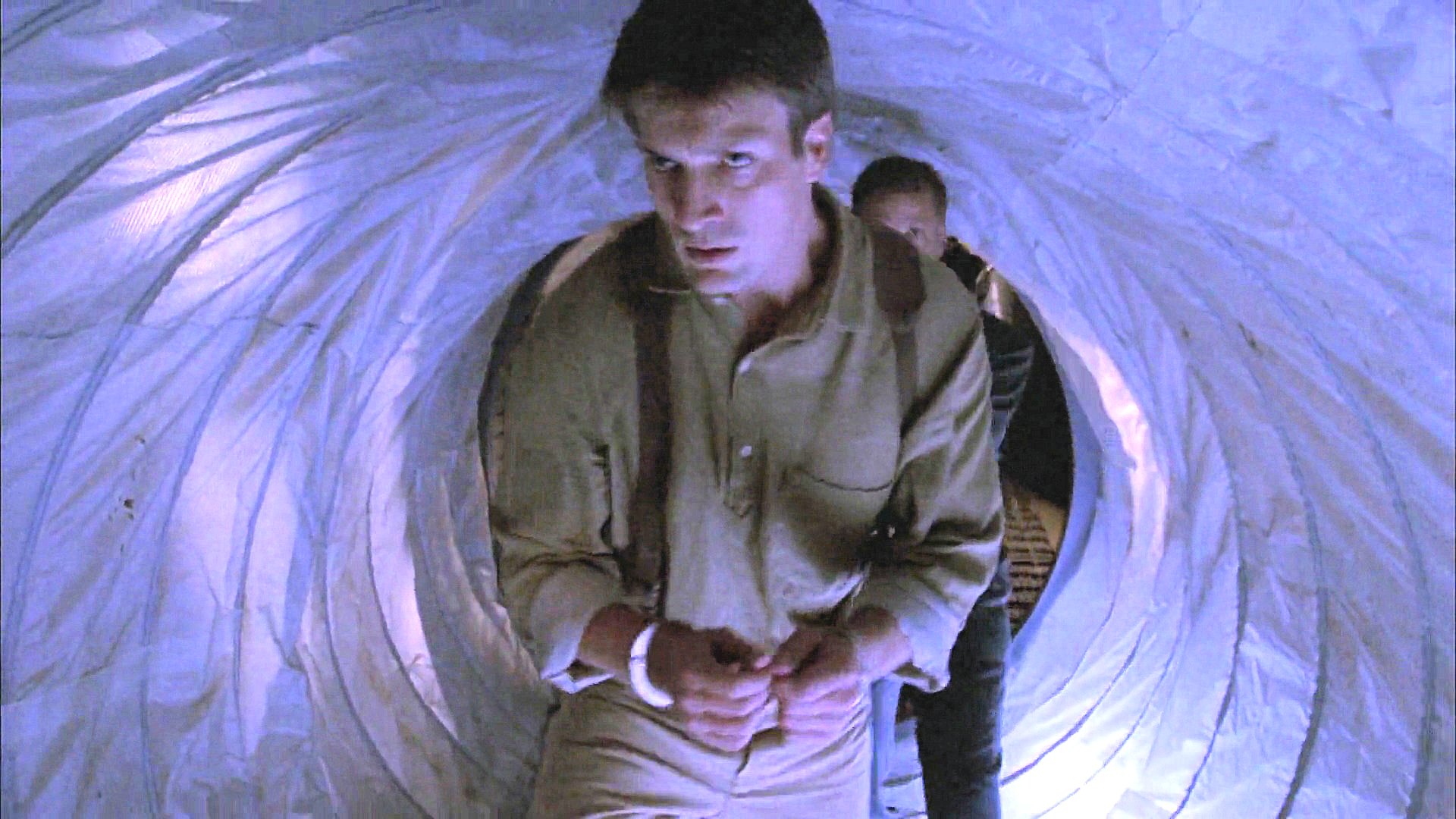 Mal searches the ship along with an Alliance team to find a Reaver. Mal objects to having his hands cuffed behind his back, at which point