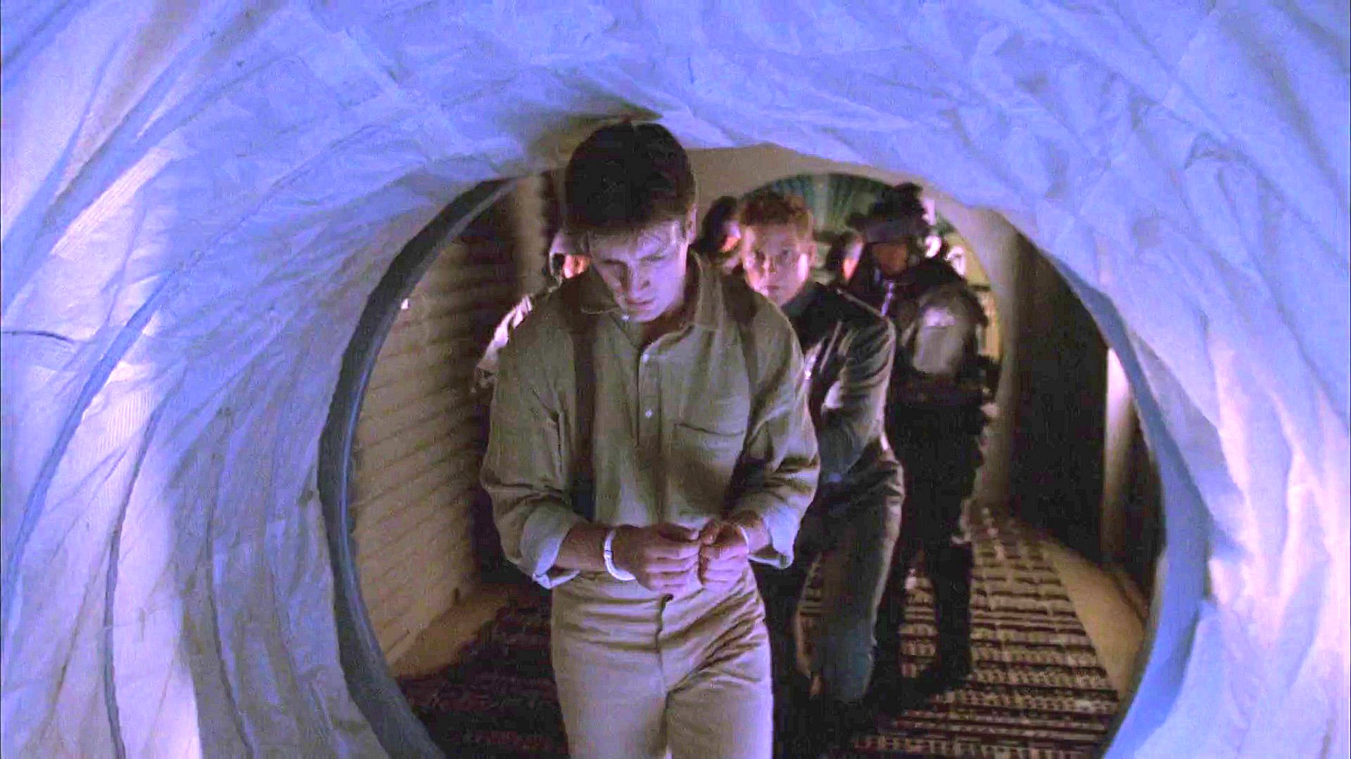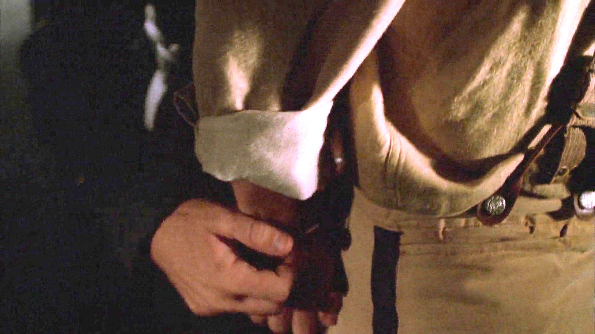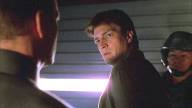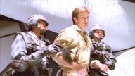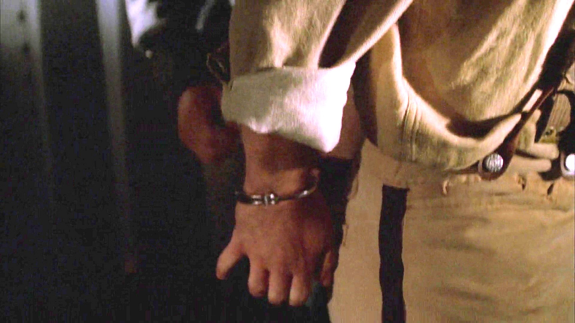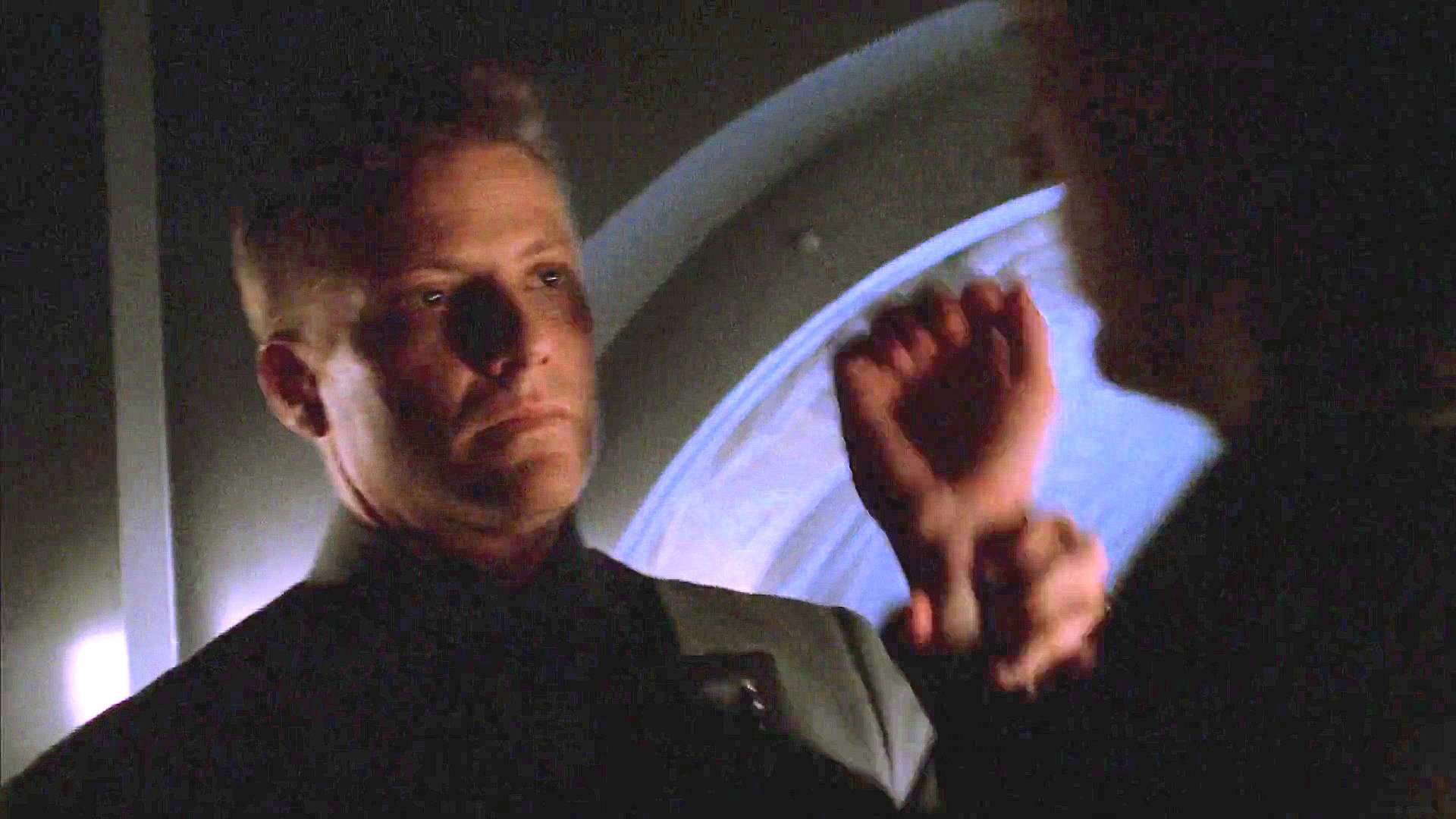 Mal searches the ship along with an Alliance team to find a Reaver. Mal objects to having his hands cuffed behind his back, at which point