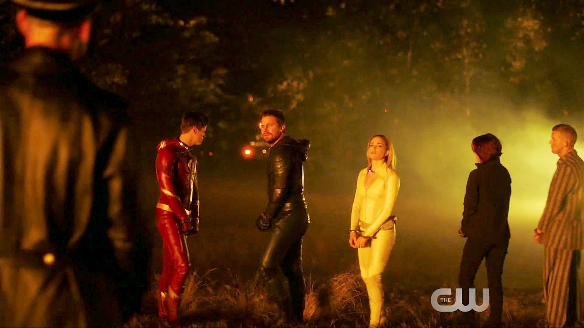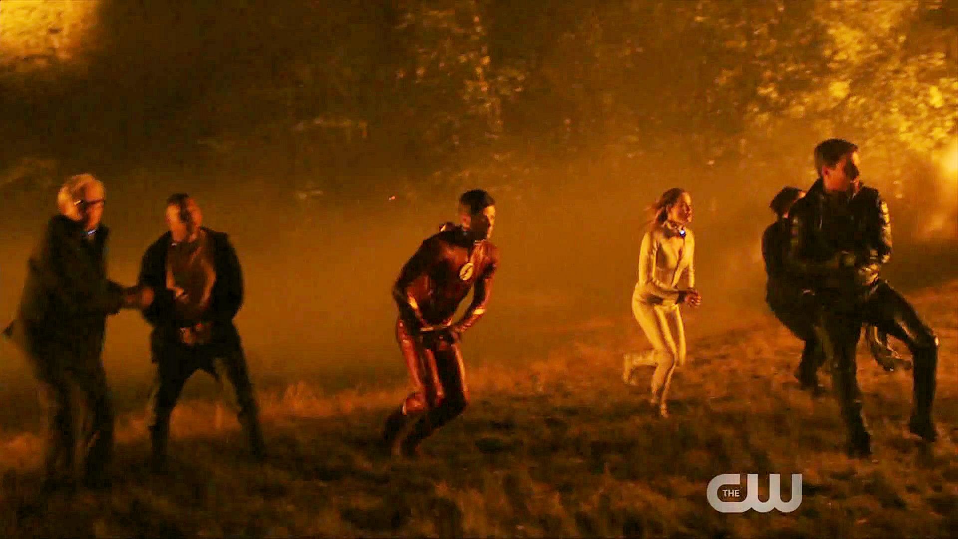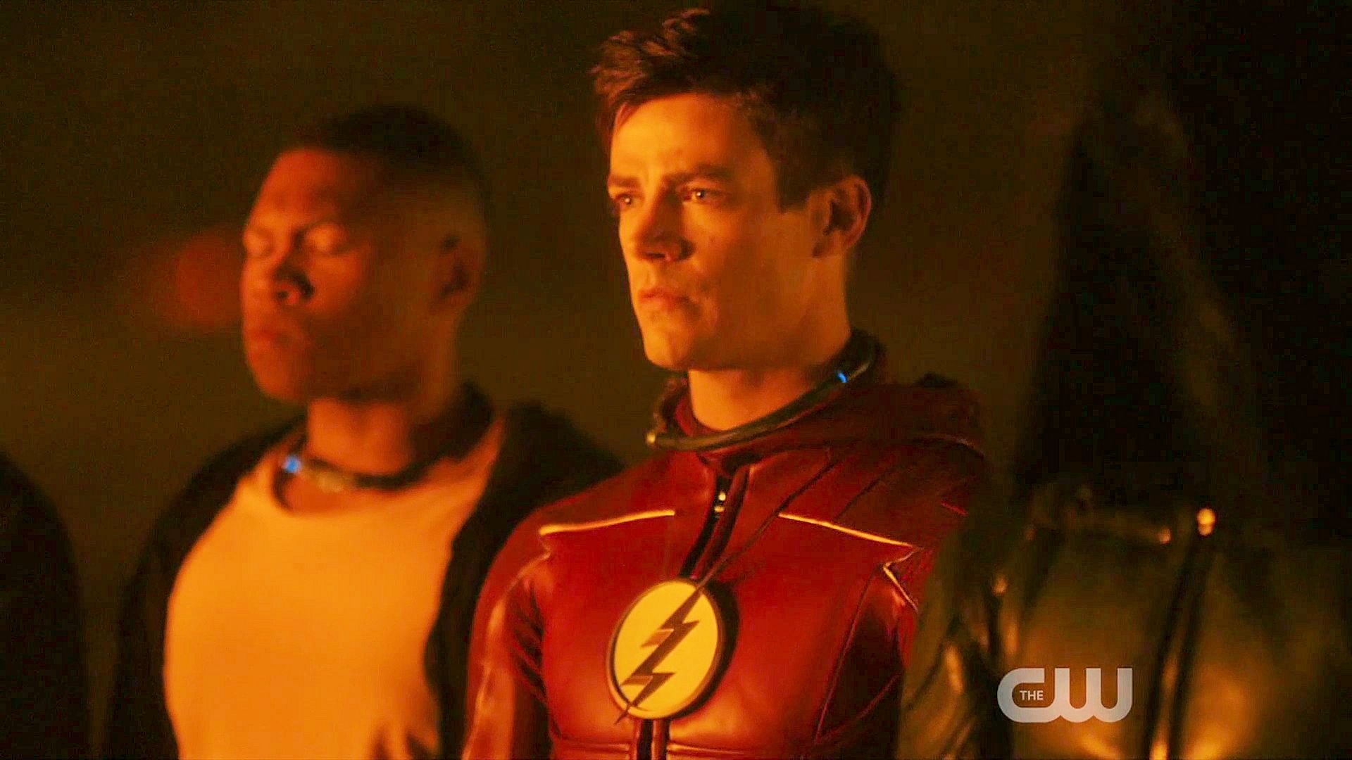 Grant Gustin, Stephen Amell and Franz Drameh in