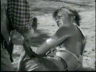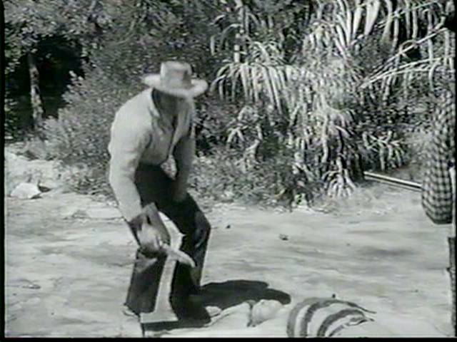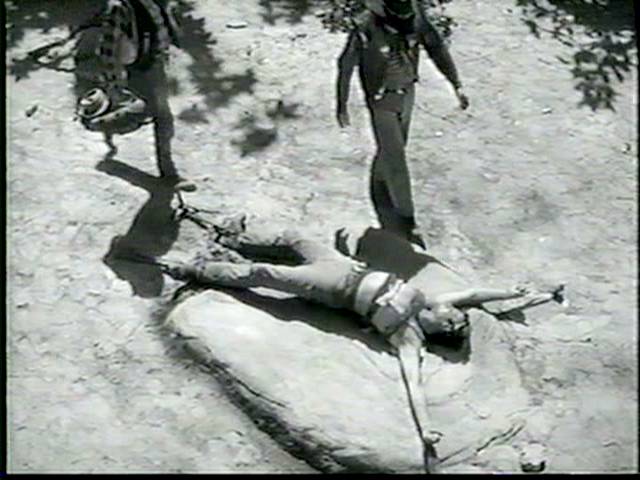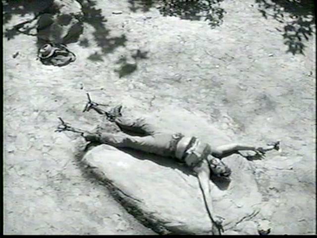 Moore is caught by the villian, who wraps his torso in wet rawhide, so that it will get tighter and more painful as it dries.