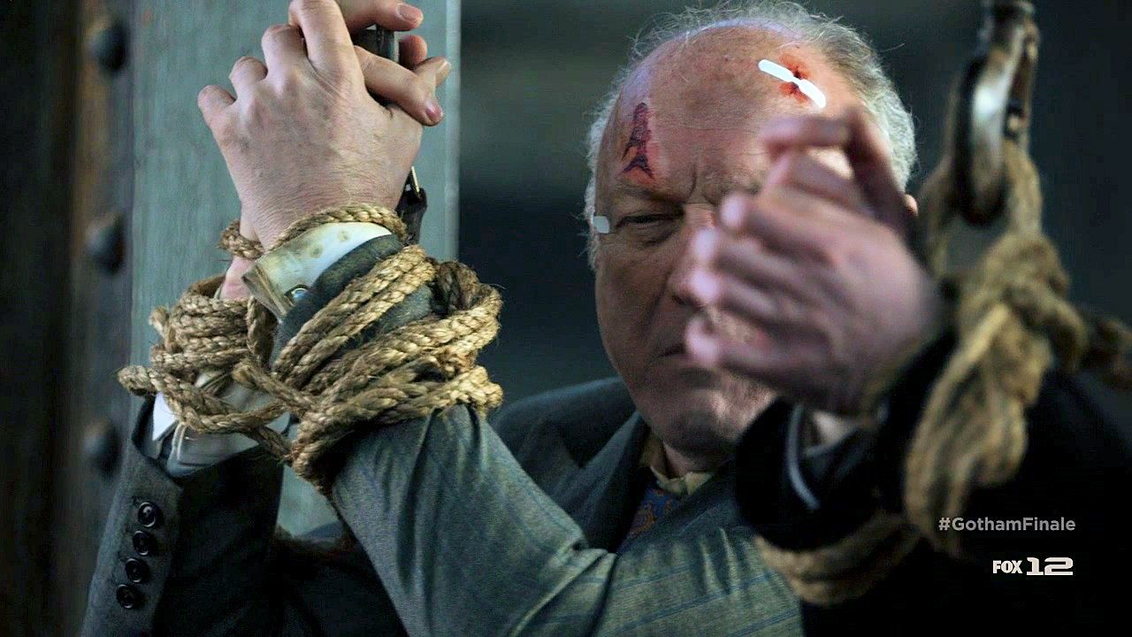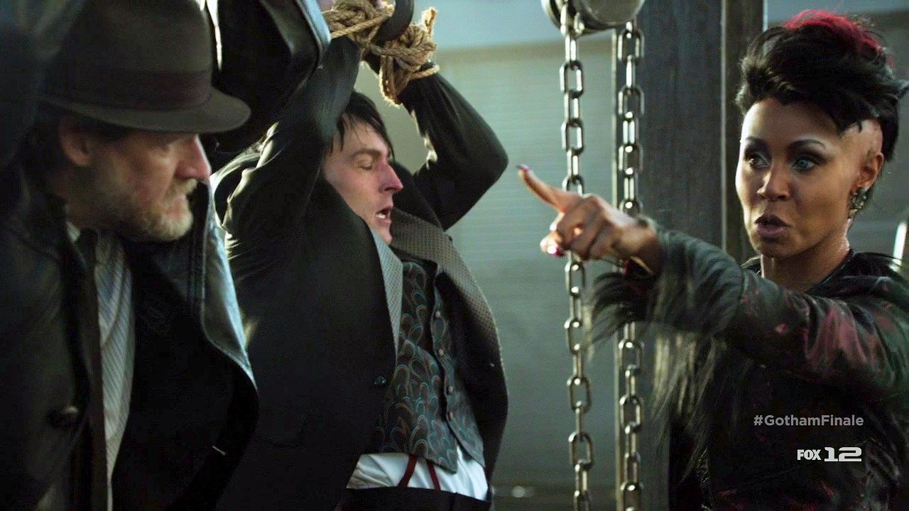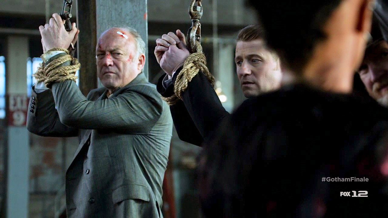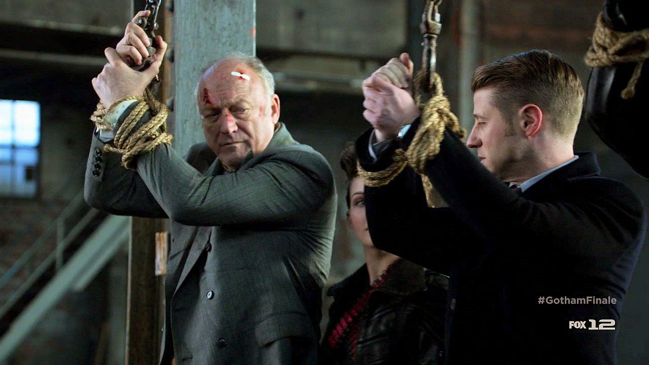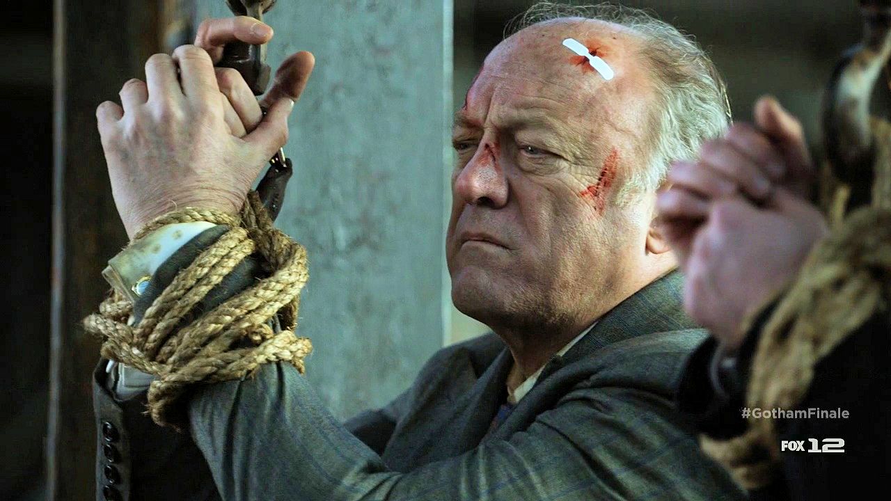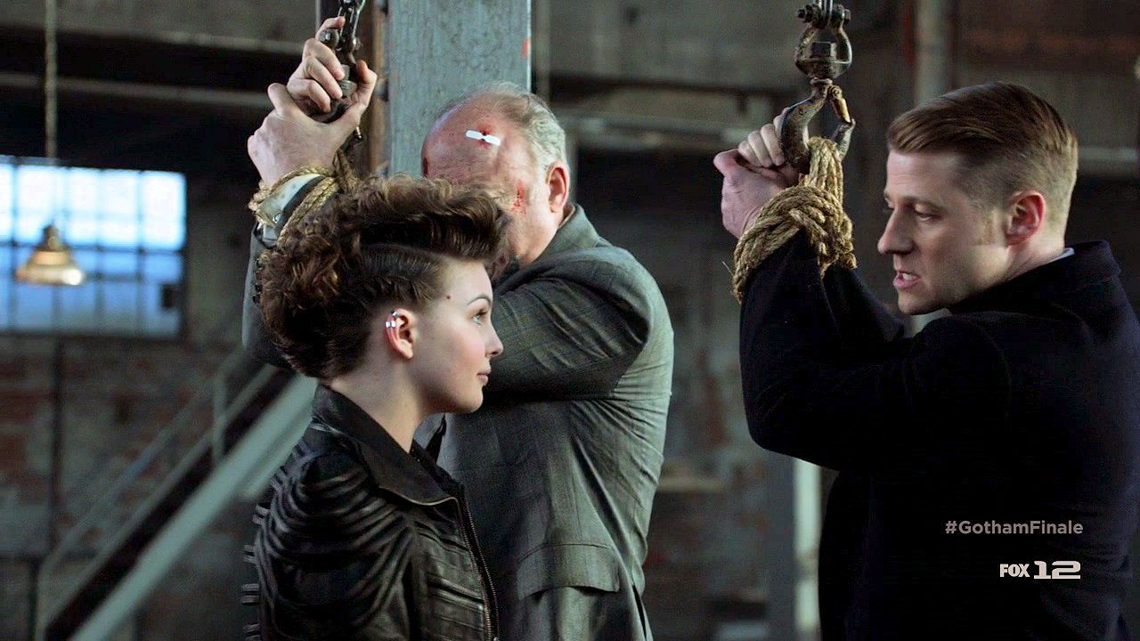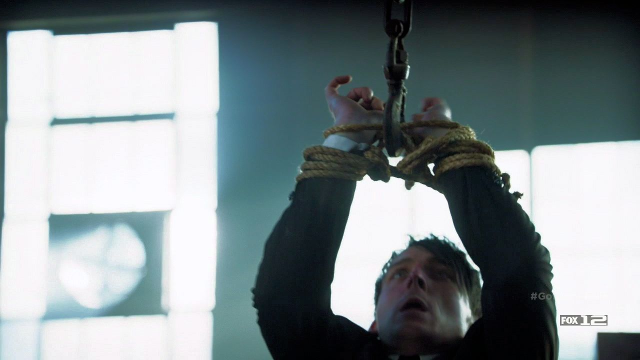 Gordon, Bullock, Oswald and Falcone are captured and tied up by Fish. (Anna Karenina it ain't.)