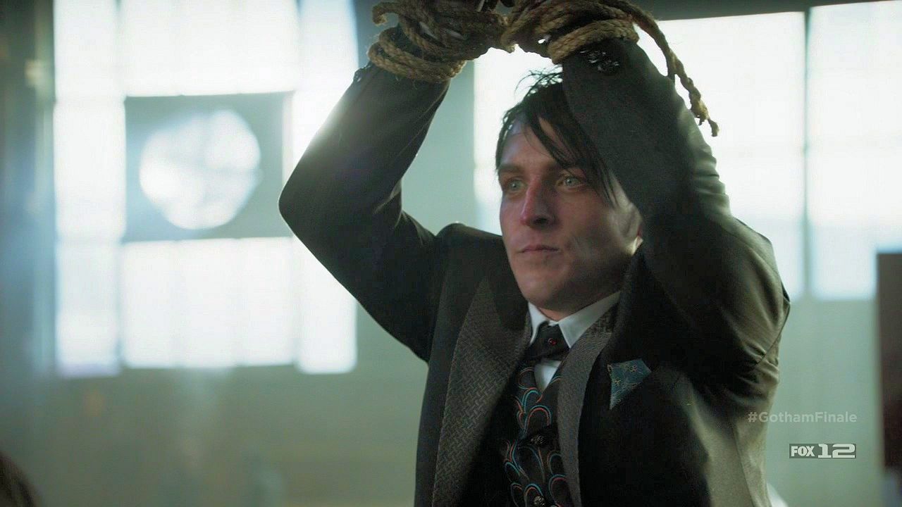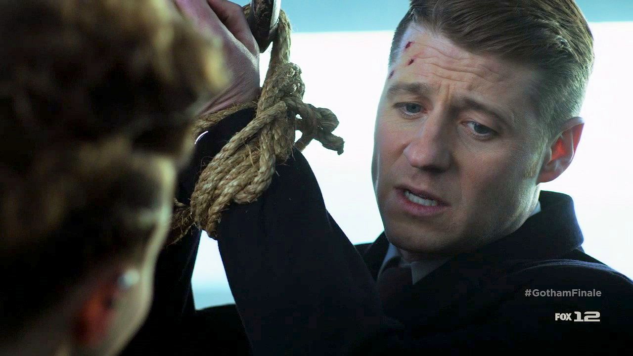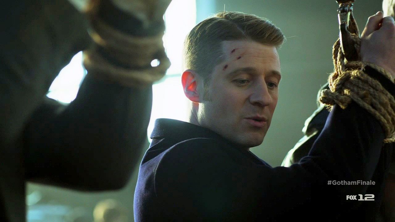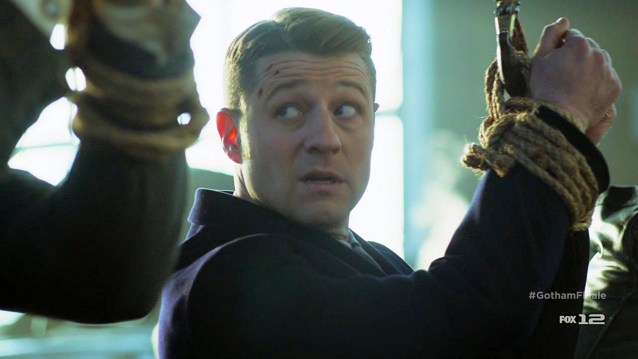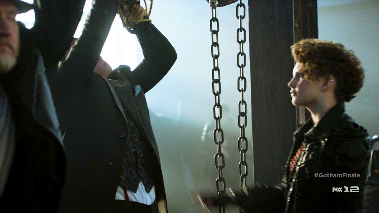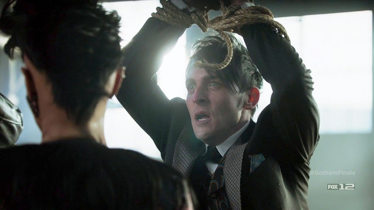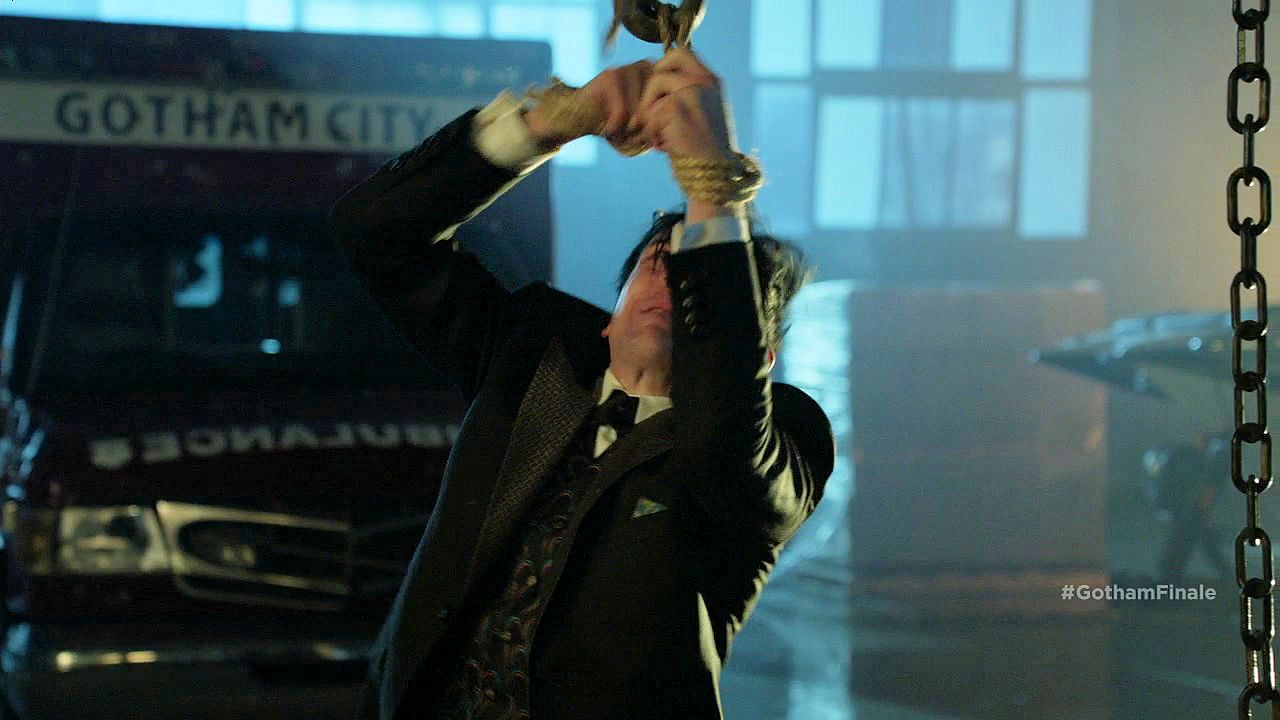 Gordon, Bullock, Oswald and Falcone are captured and tied up by Fish. (Anna Karenina it ain't.)