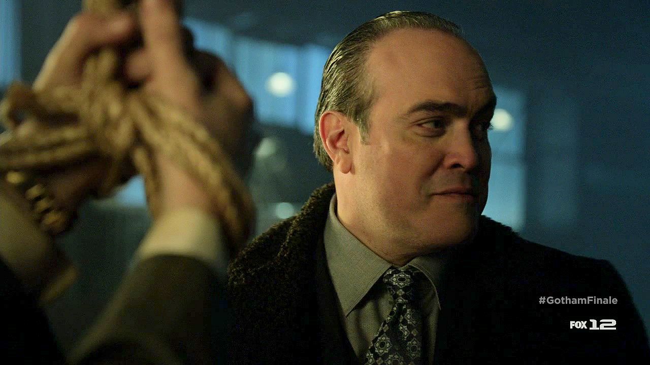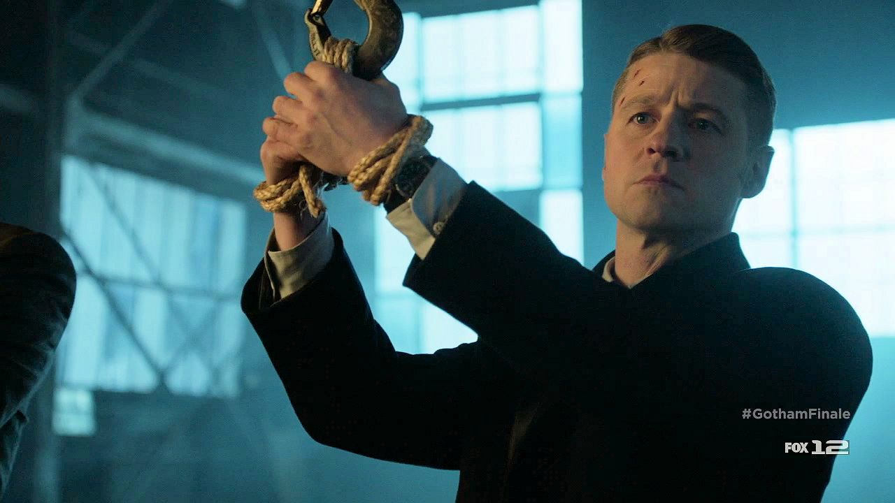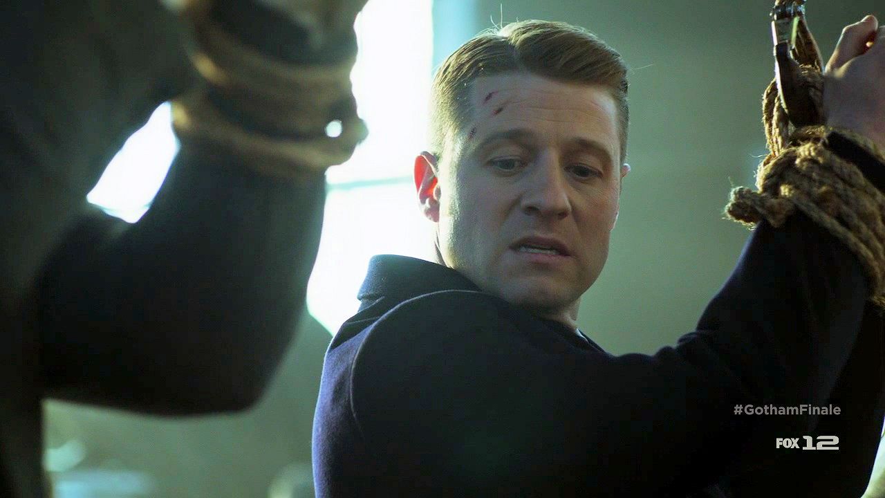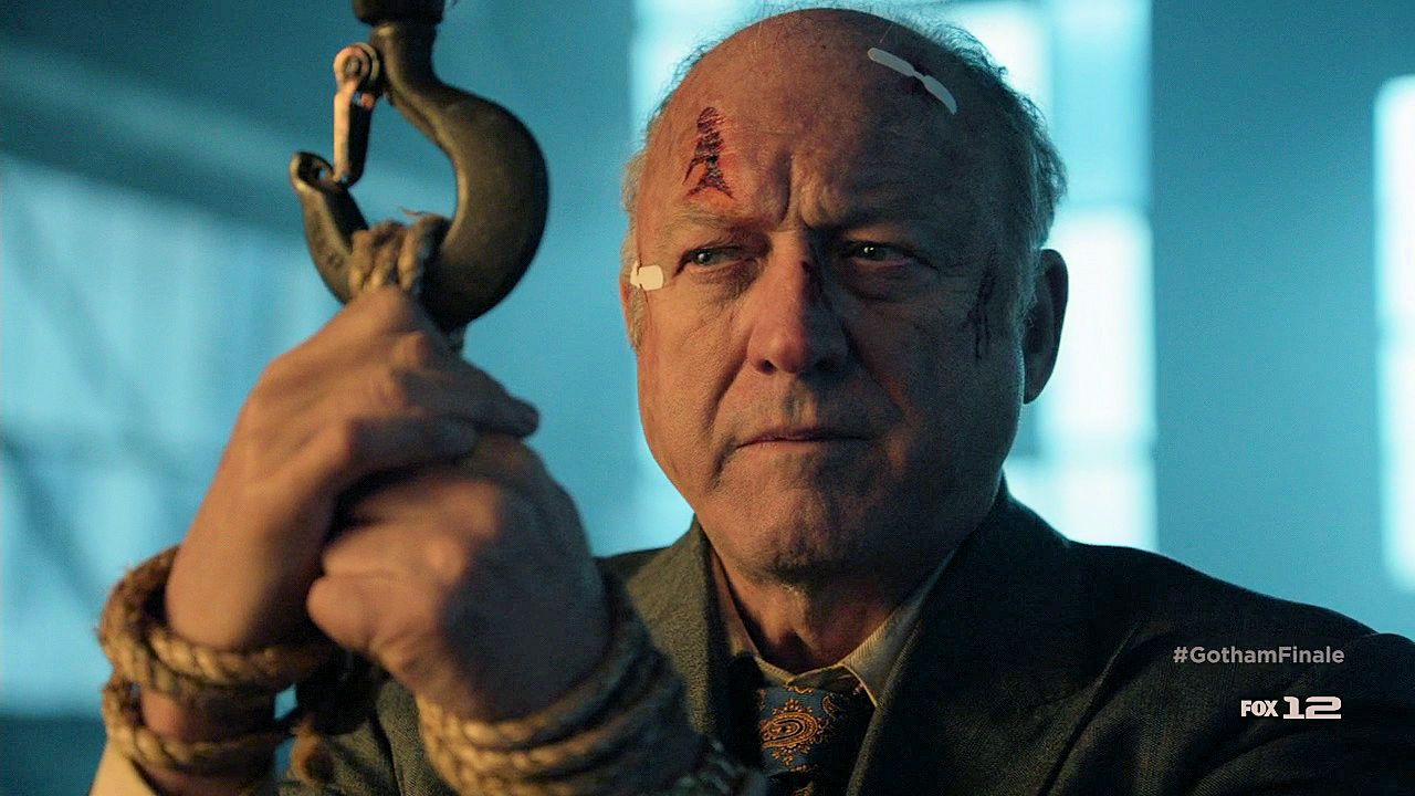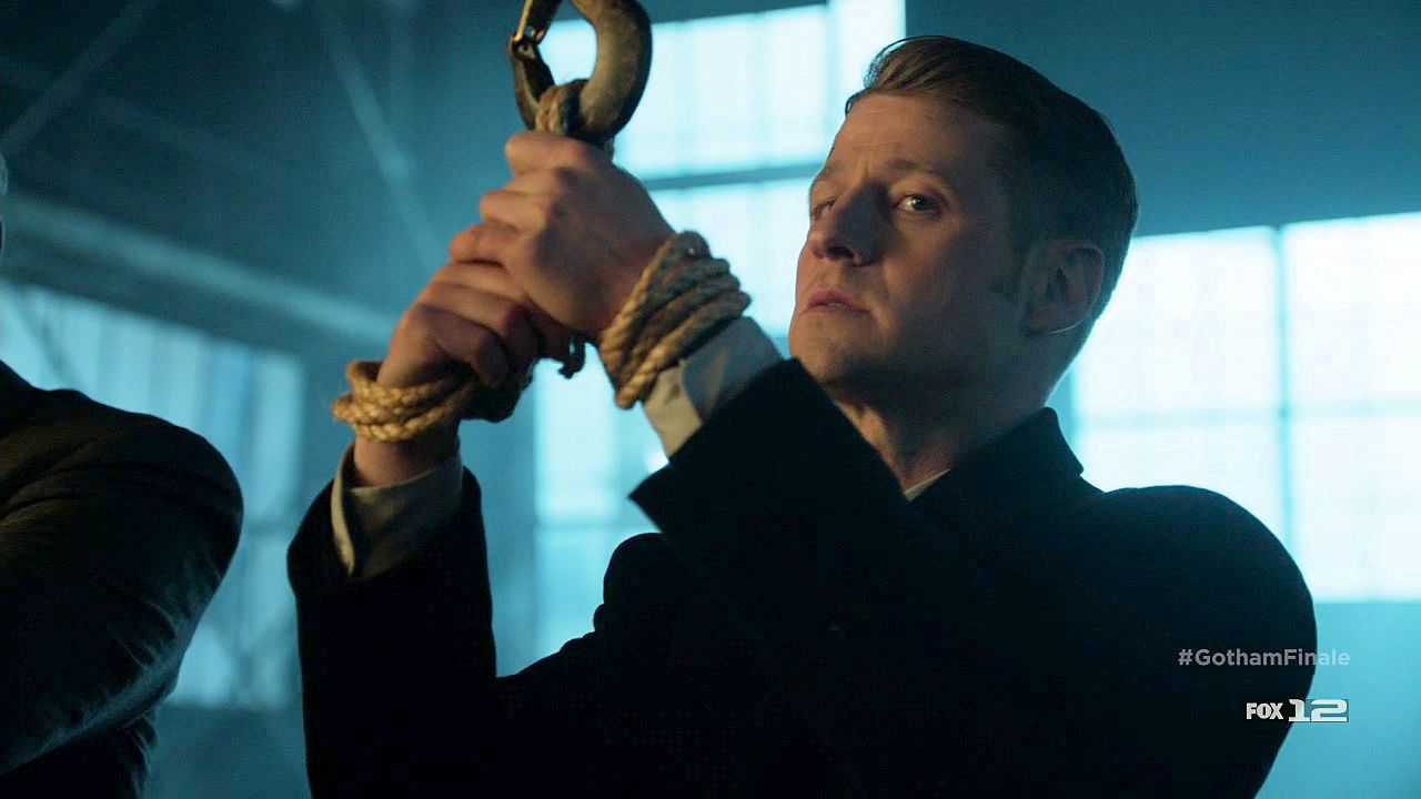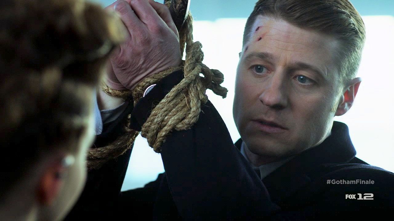 Gordon, Bullock, Oswald and Falcone are captured and tied up by Fish. (Anna Karenina it ain't.)
