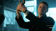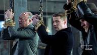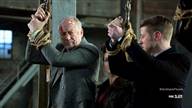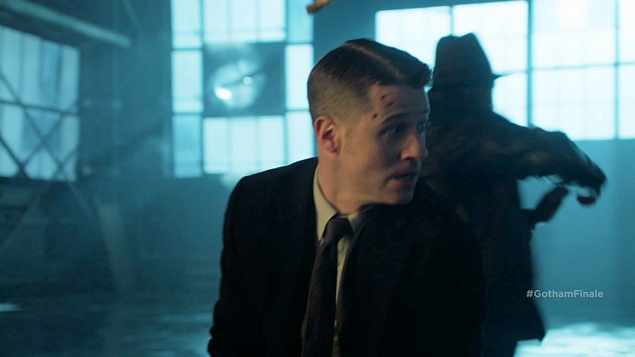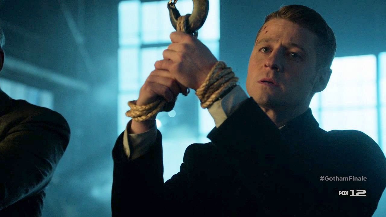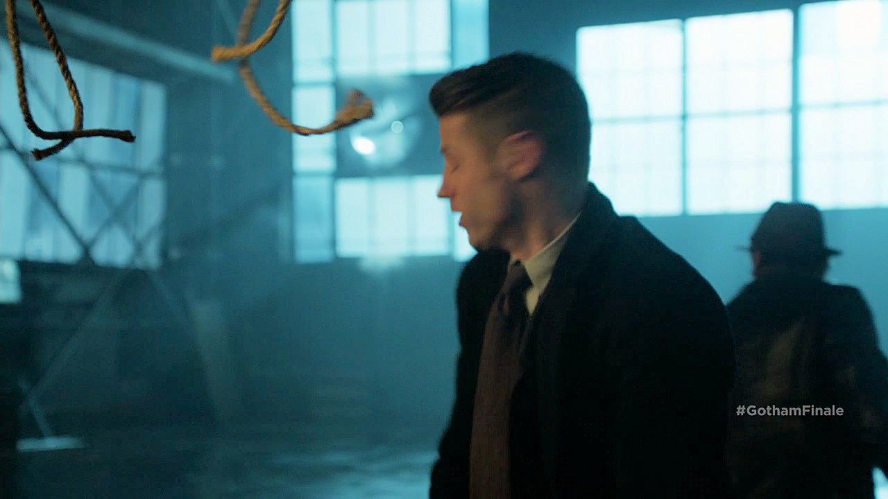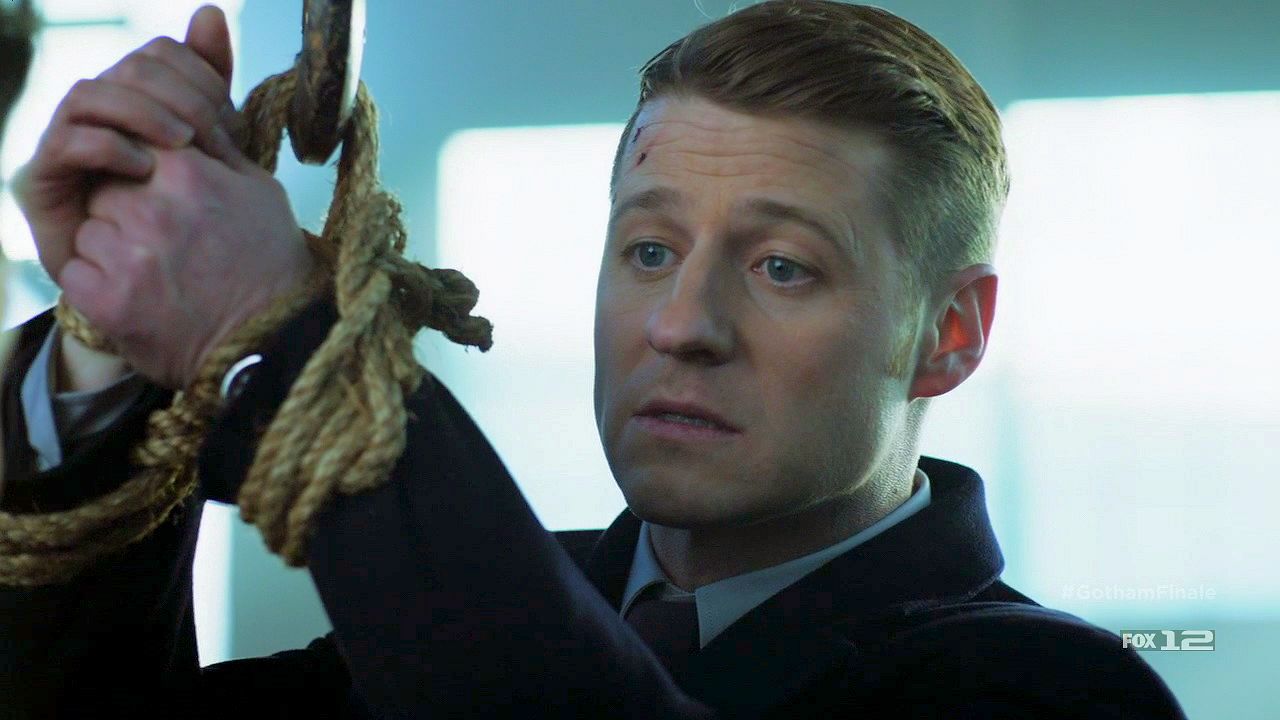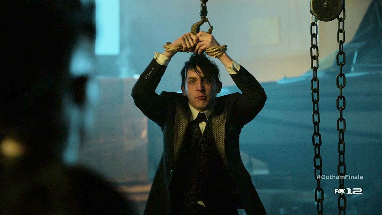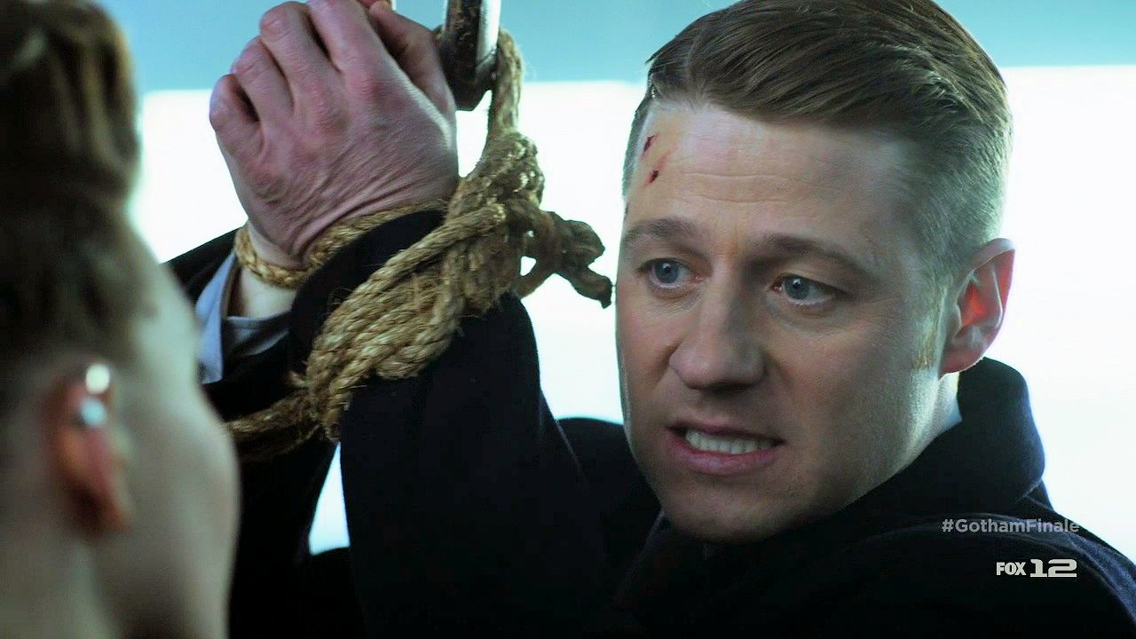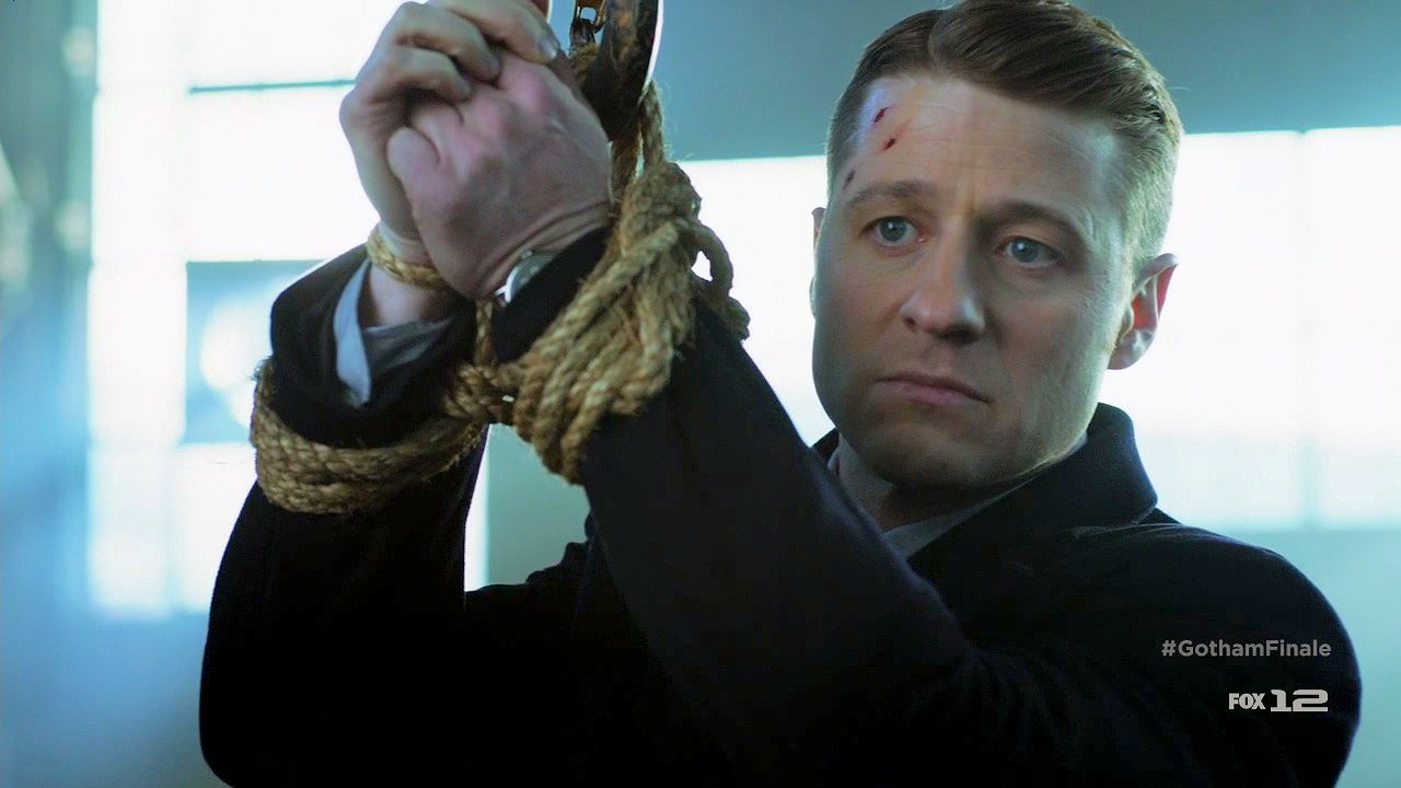 Gordon, Bullock, Oswald and Falcone are captured and tied up by Fish. (Anna Karenina it ain't.)