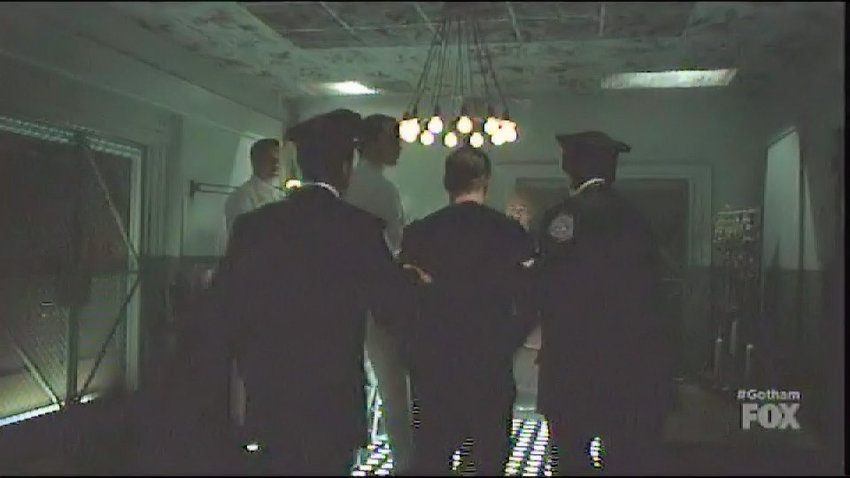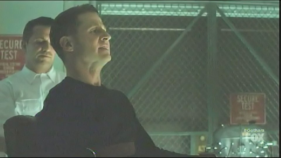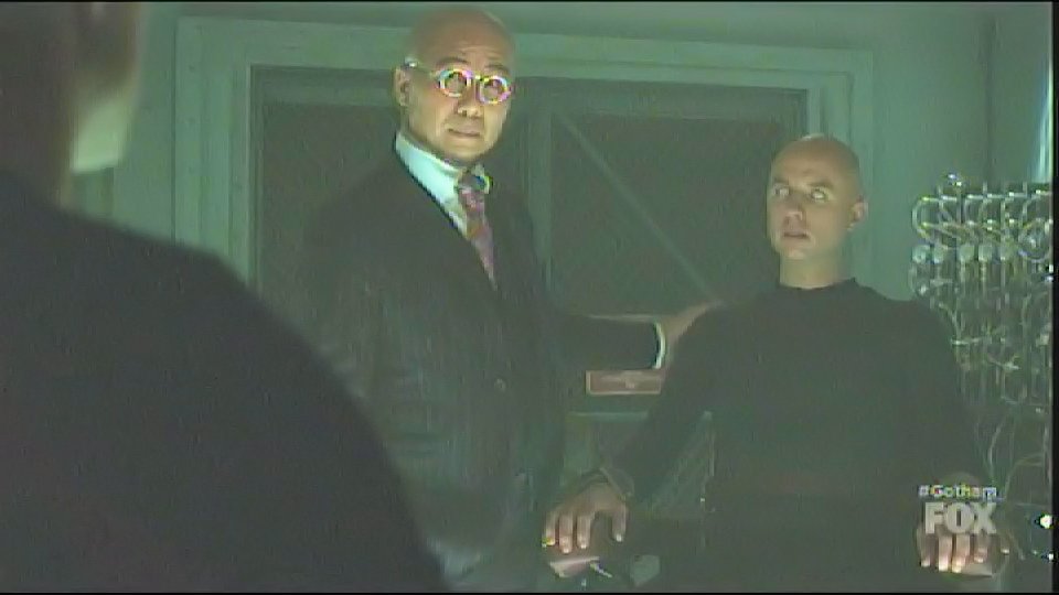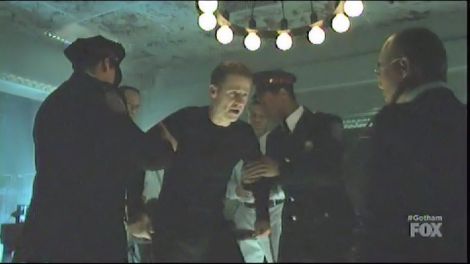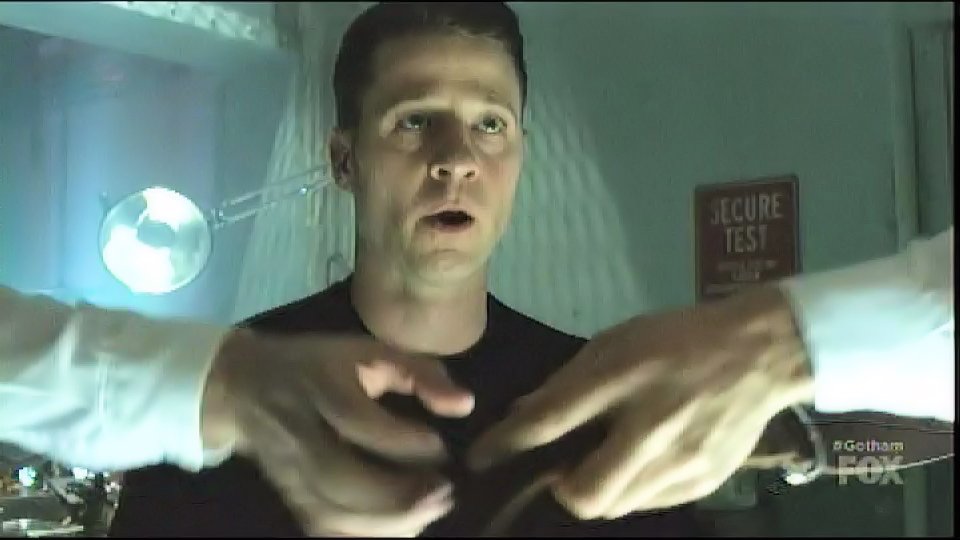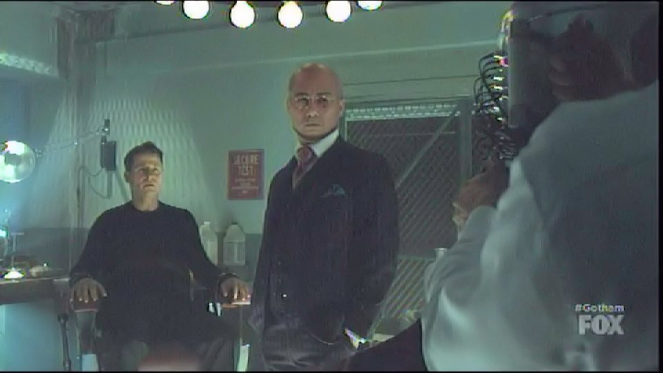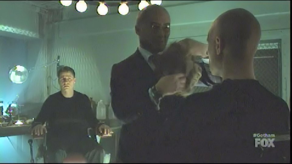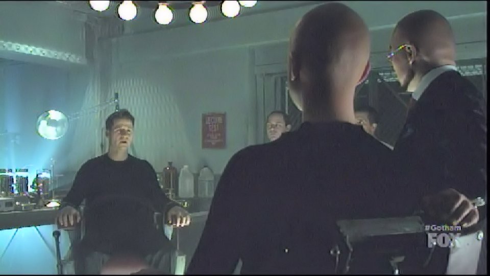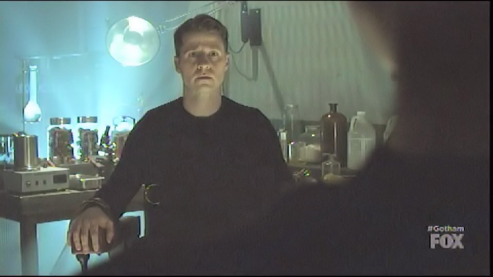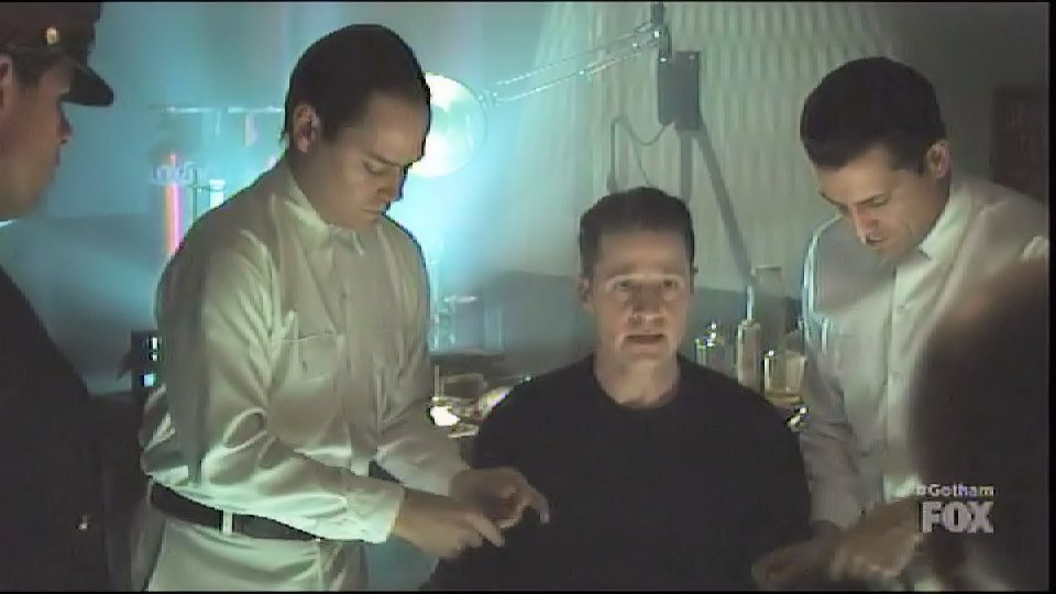 Hugo Strange captures Gordon and has him tied to a chair in one of his labs, locking his head in a device filled with white liquid.