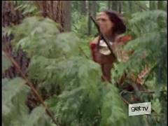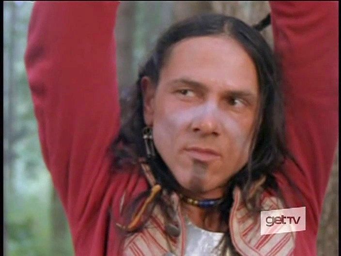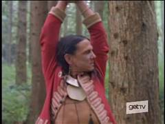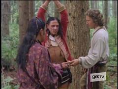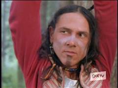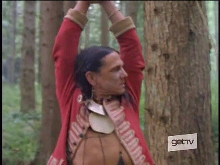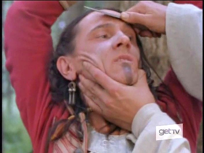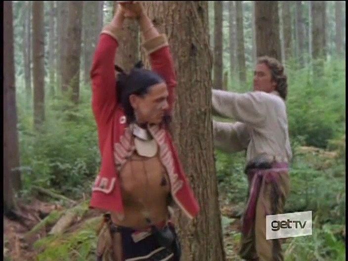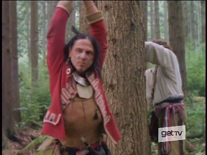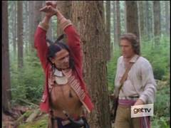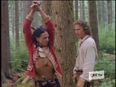 Hawkeye and Chingachgook interrogate a Huron brave.