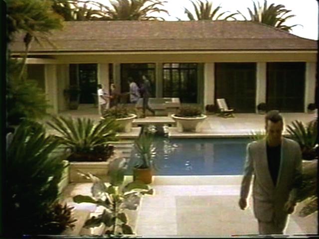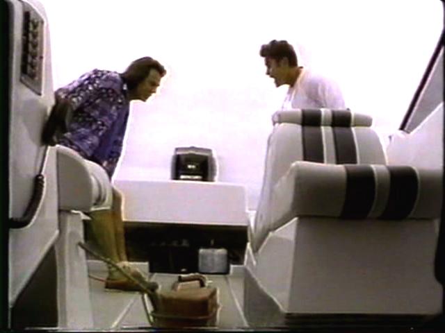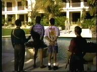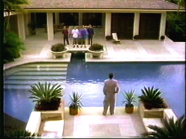 The guys are tied up and brought to the villian for some poolside threats. Then they're put on a boat with a bomb, and throw themselves overboard just in time.