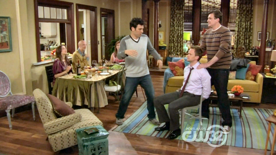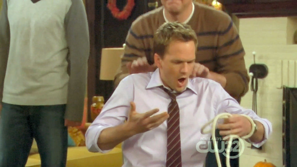 Having won a "slap bet" with Barney, Marshall ties Barney to a chair and
