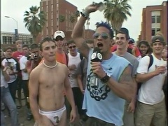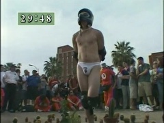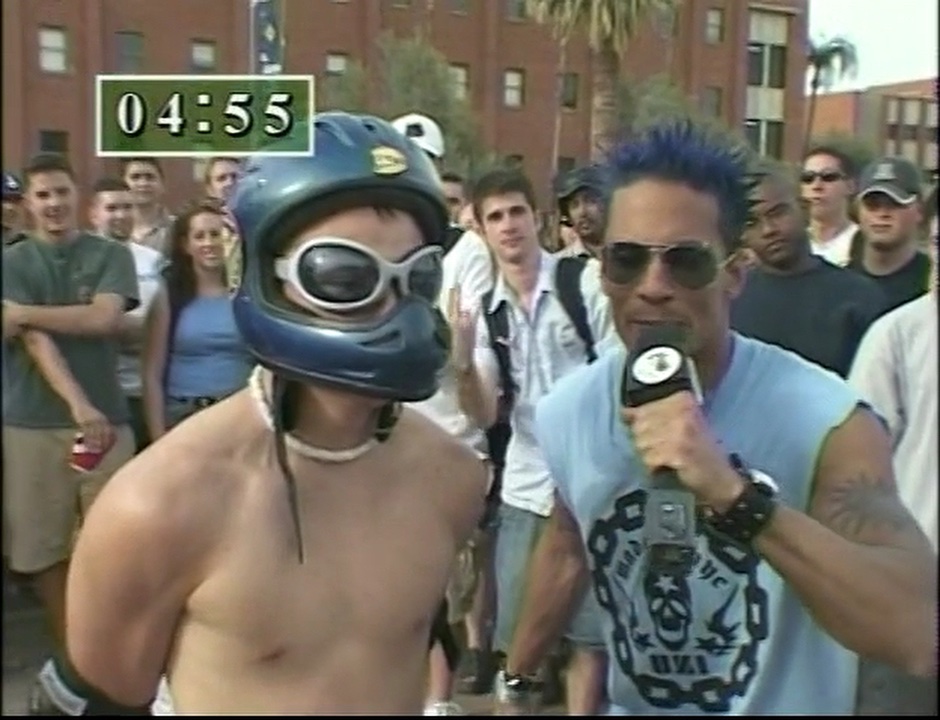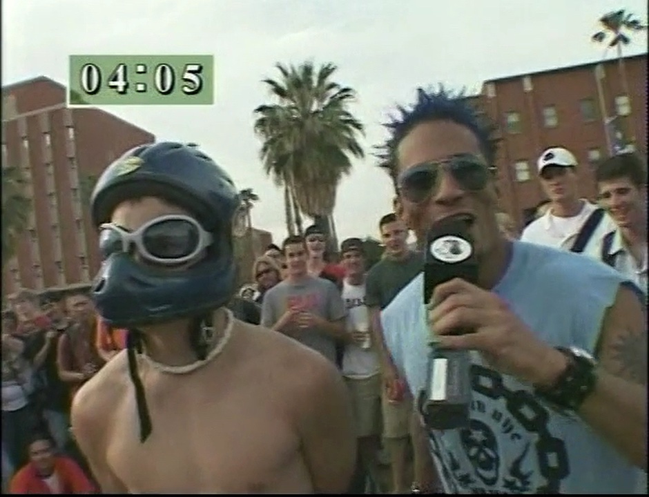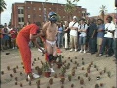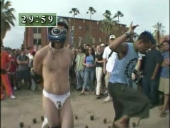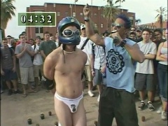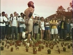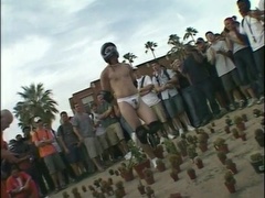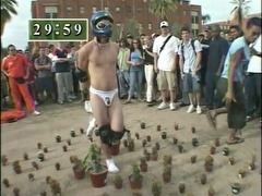 A man accepts a bet to stand on one leg in a bed of cactus while handcuffed and then to have ice poured into his jockstrap.