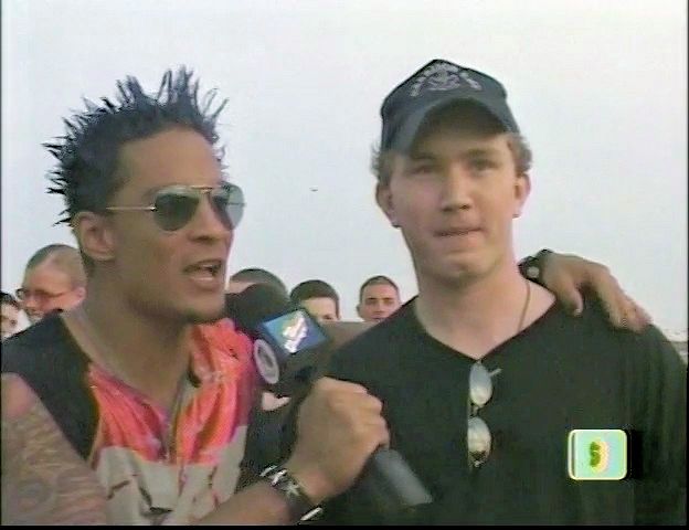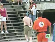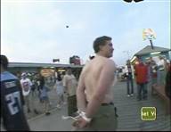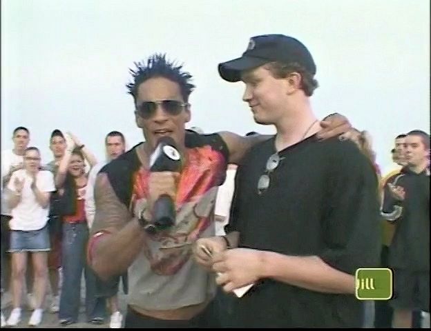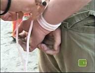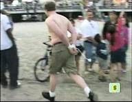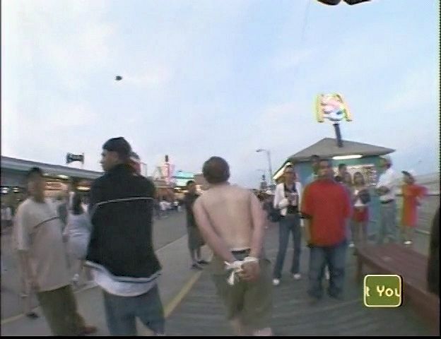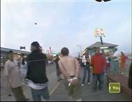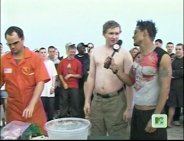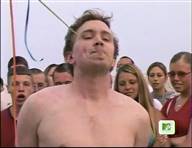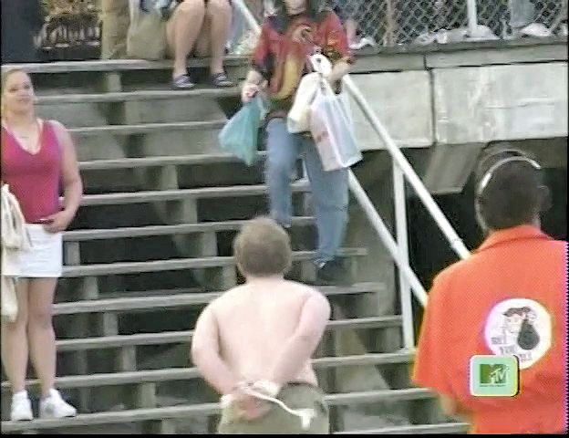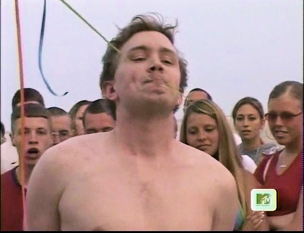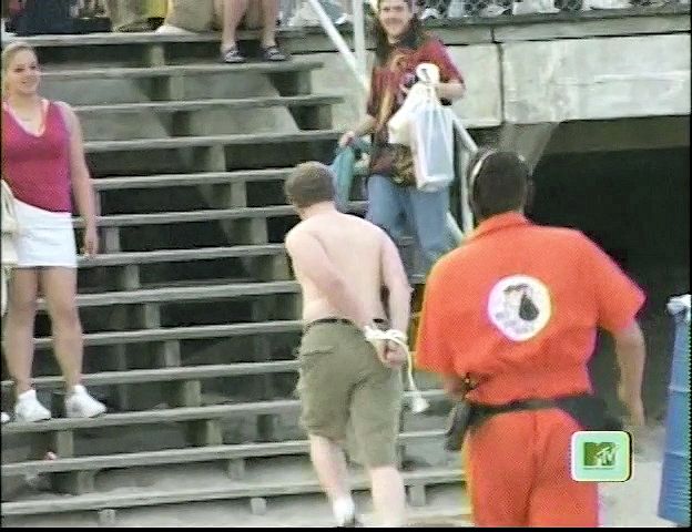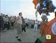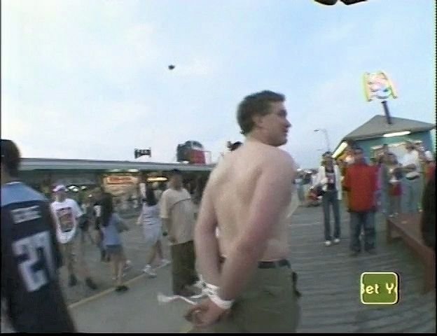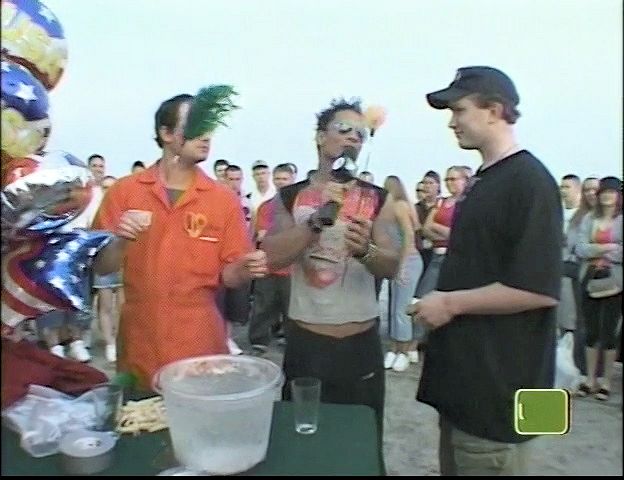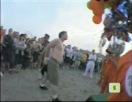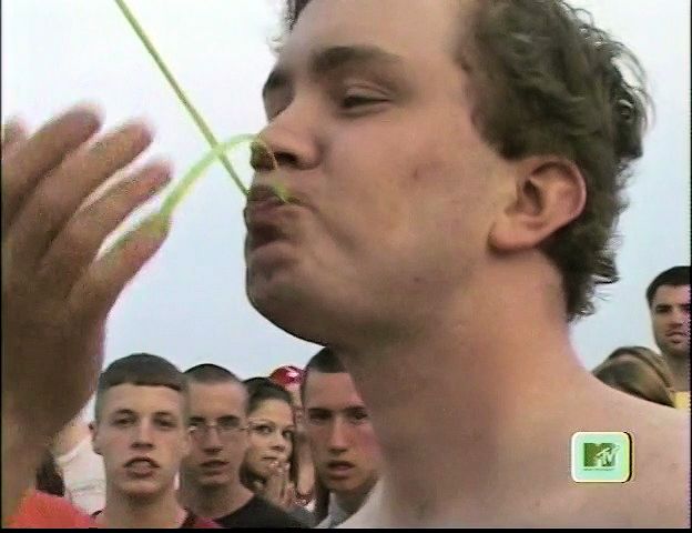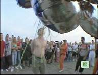 In this MTV stunt show, a beach-goer tries and fails to hold a bunch of balloons in his teeth with his hands tied behind his back,