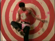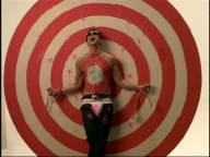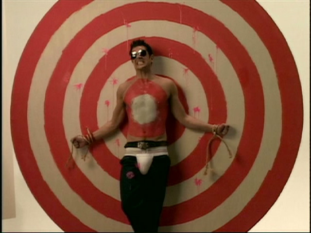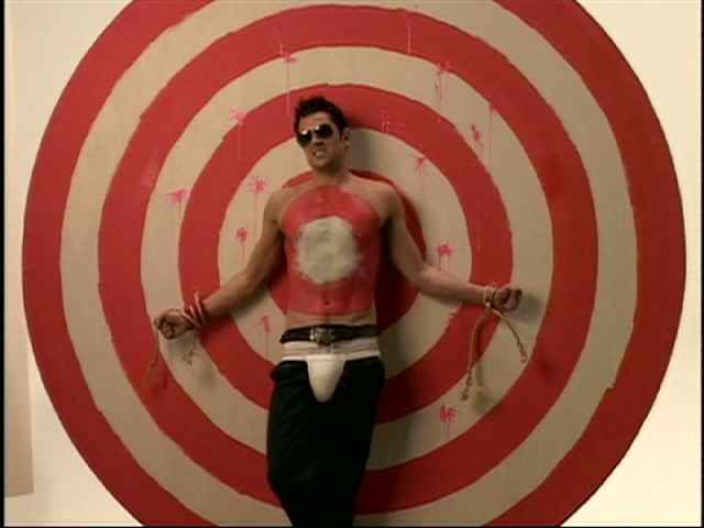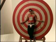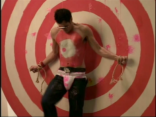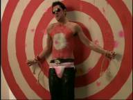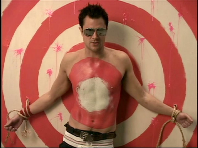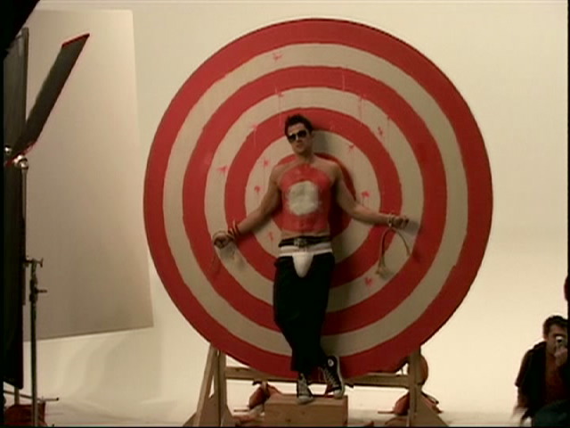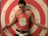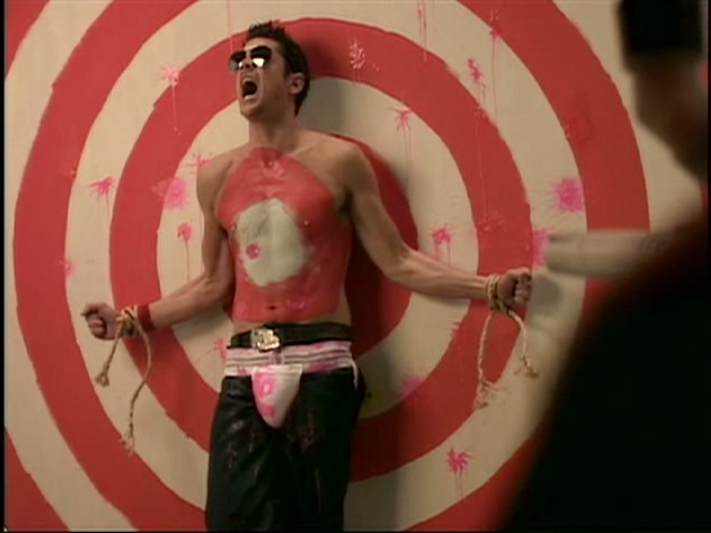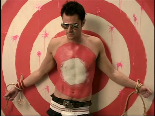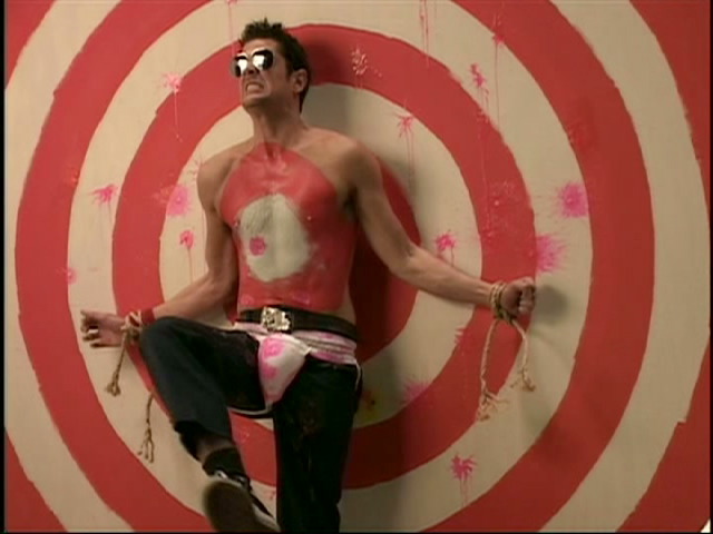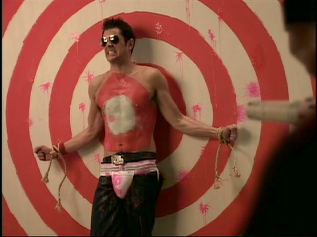 In a stunt for a Rolling Stone cover, Johnny Knoxville is tied to a target and shot with paintballs by the rest of the group.