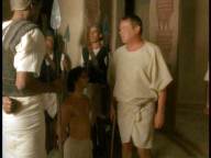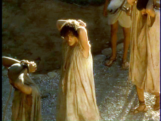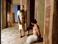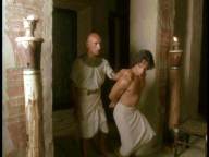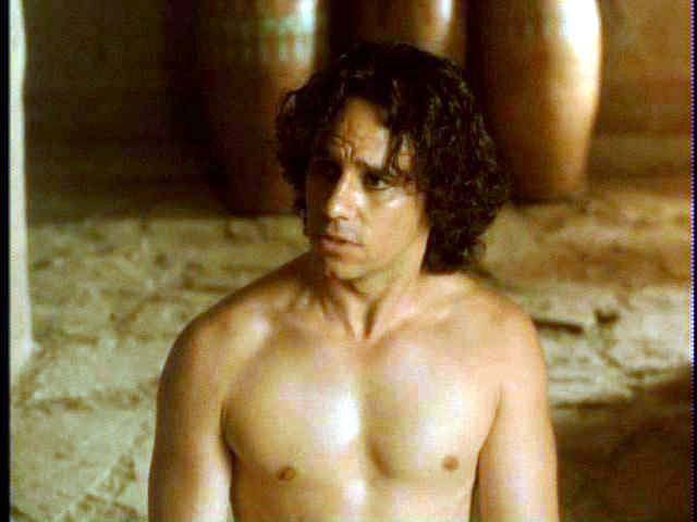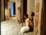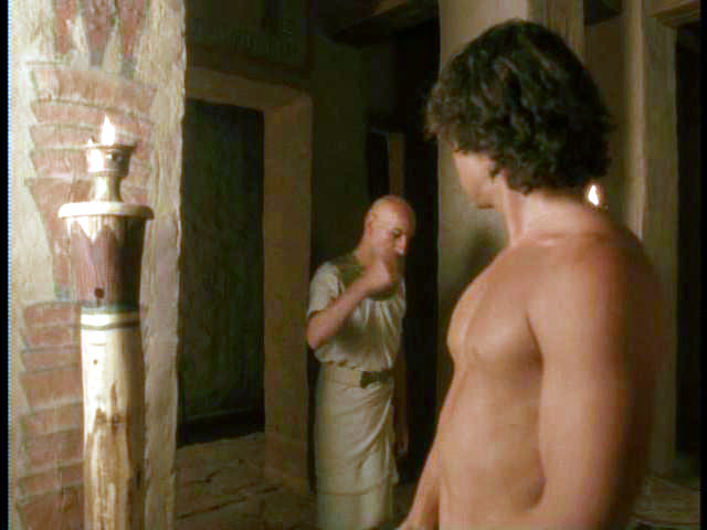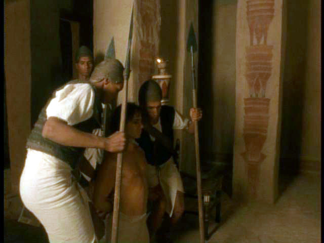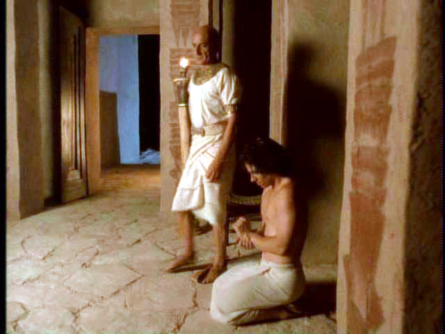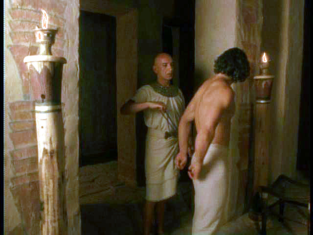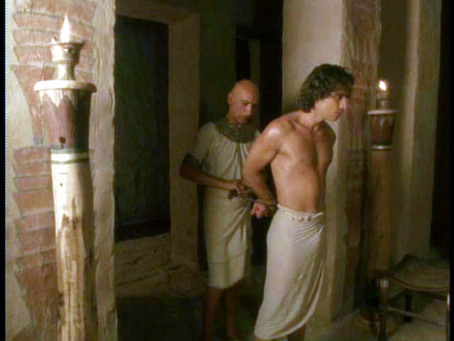 When Joseph is sold into slavery, Ben Kingsley becomes the lucky owner. He unties Joseph to talk to him, but afterward ties his hands again to keep up appearances.