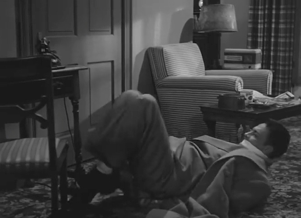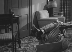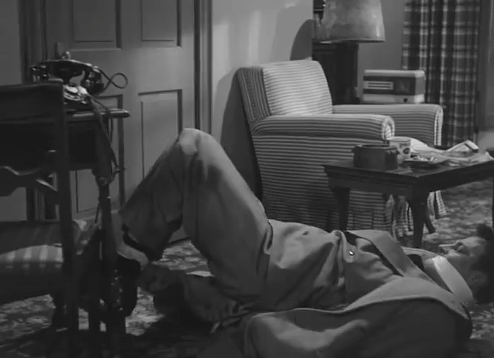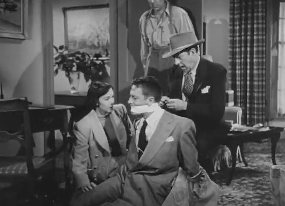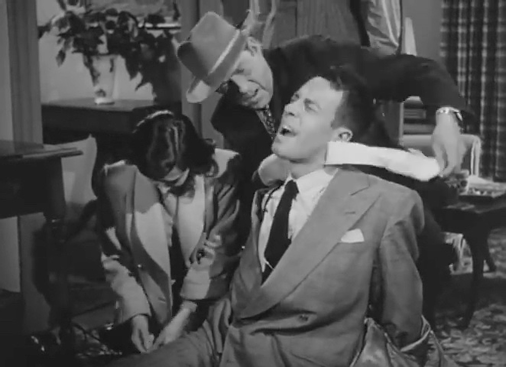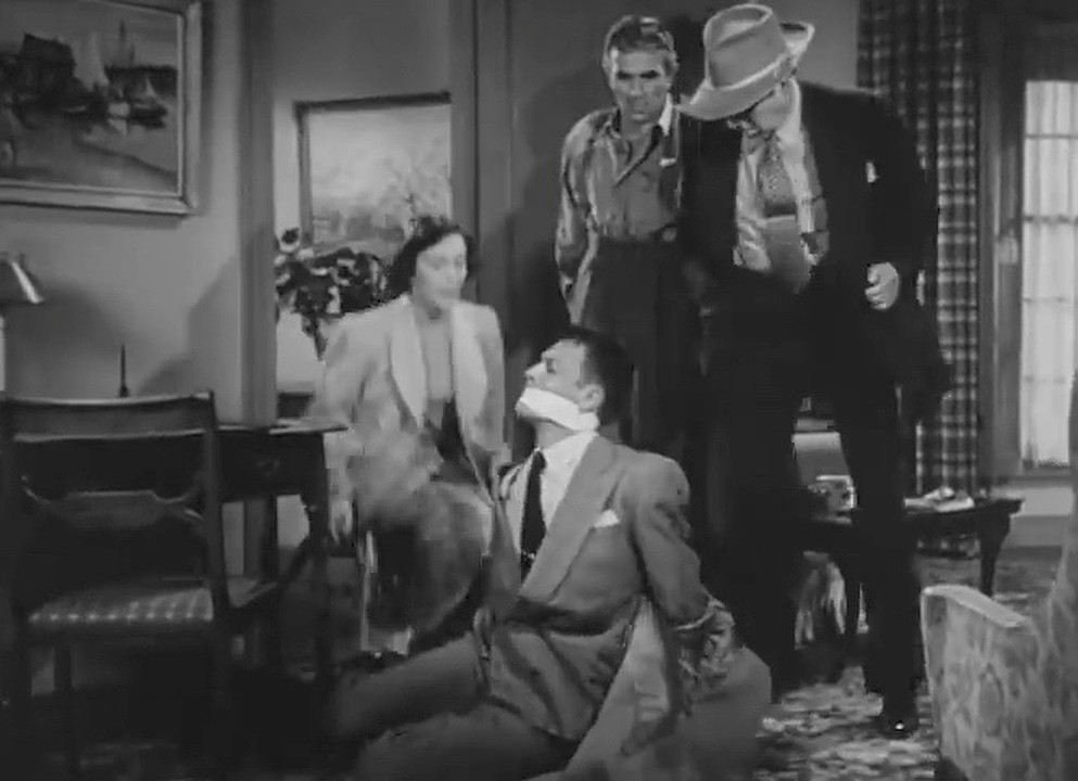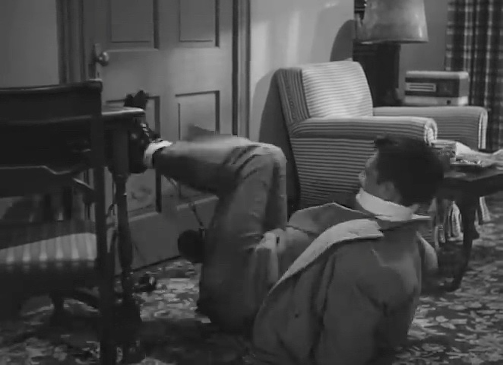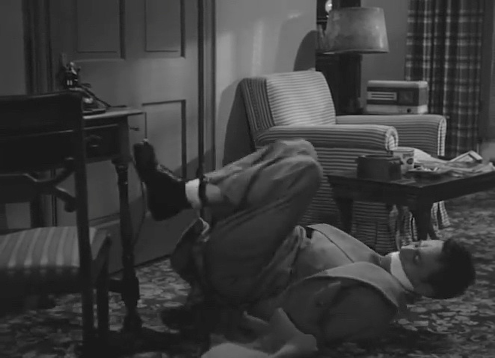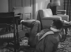 A detective who's been hogtied and gagged by his brother tries unsuccessfully to answer the phone.