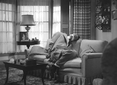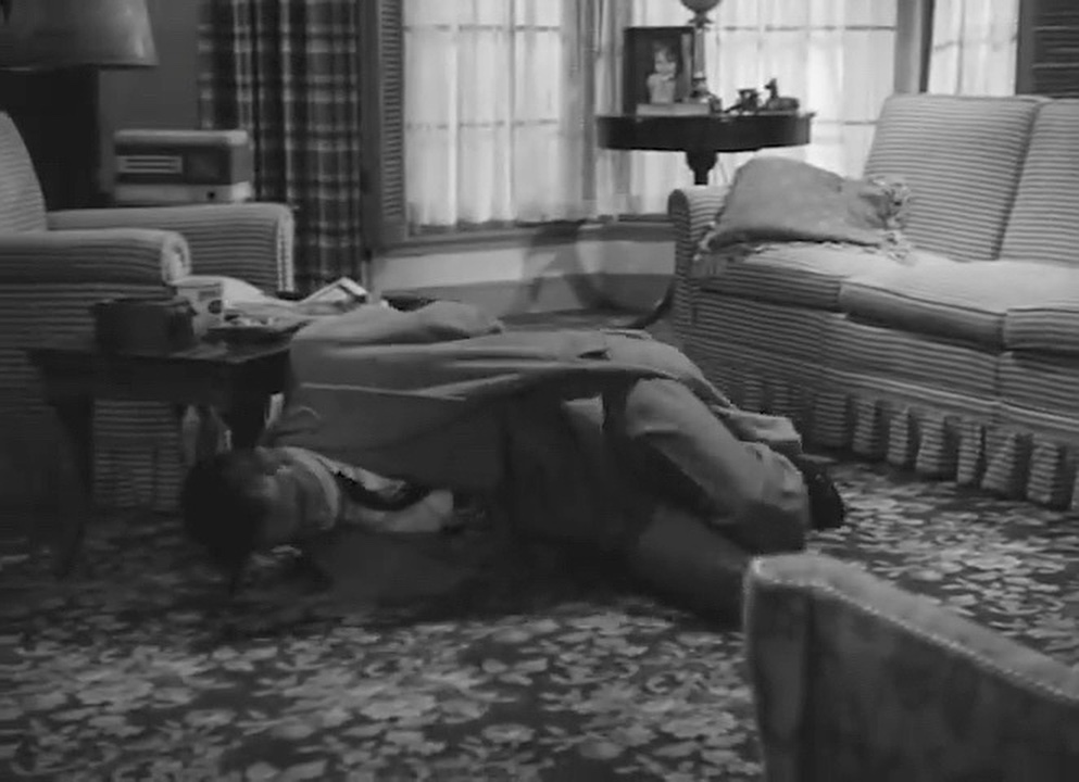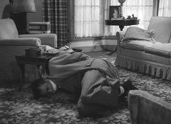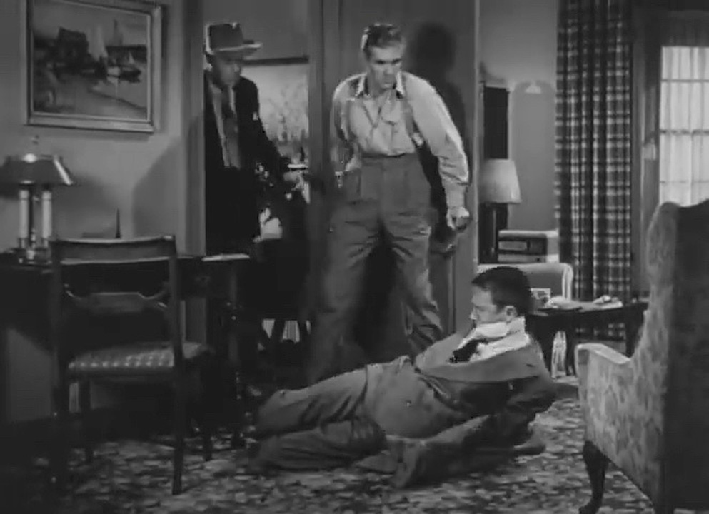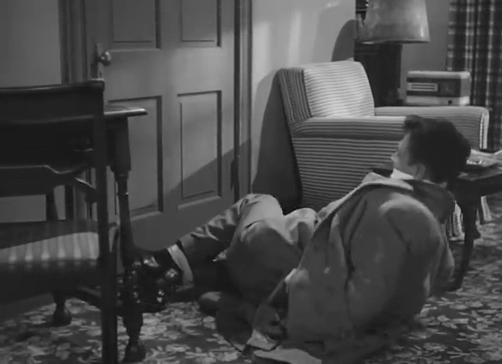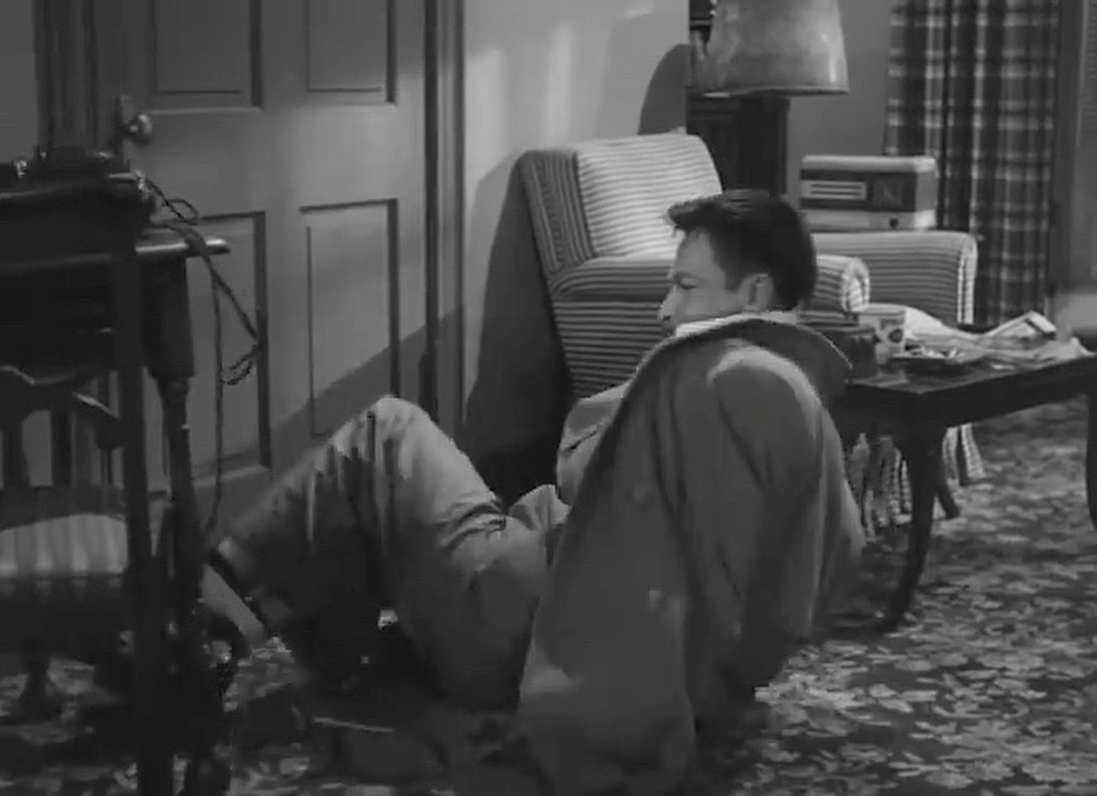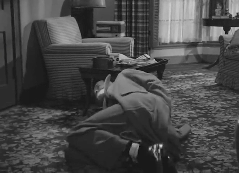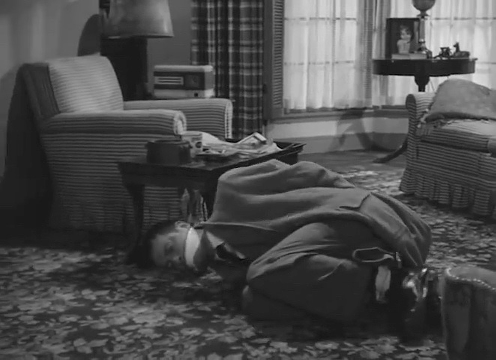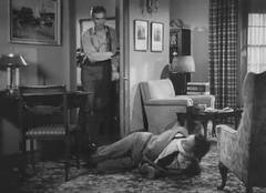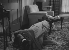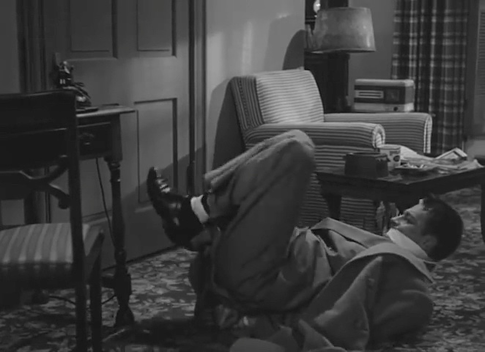 A detective who's been hogtied and gagged by his brother tries unsuccessfully to answer the phone.