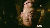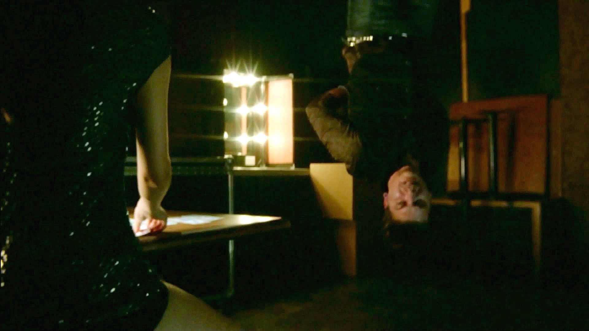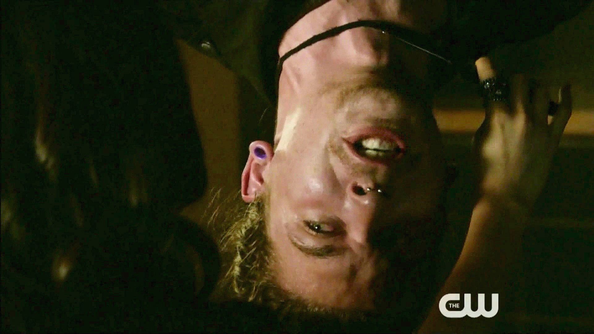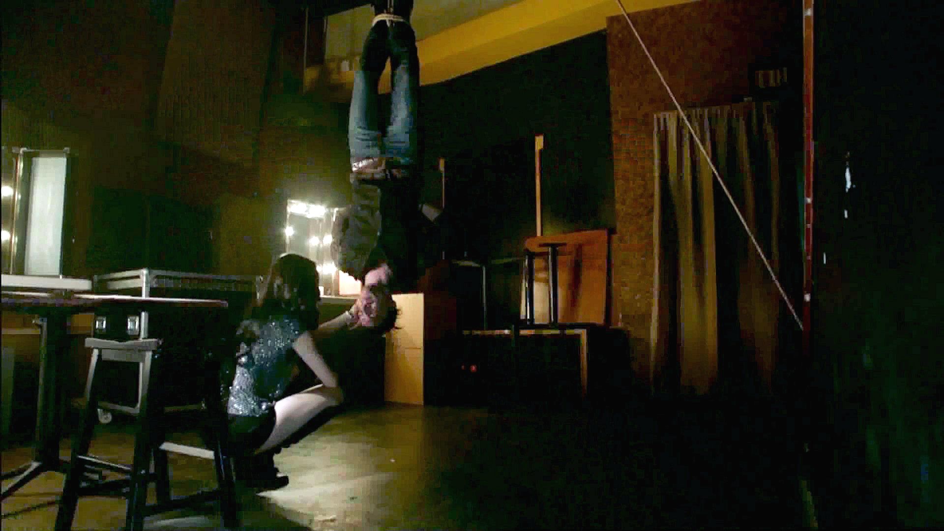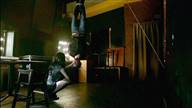 Koa has a guy tied up and hung upside down as she interrogates him about Abadon's leader.
