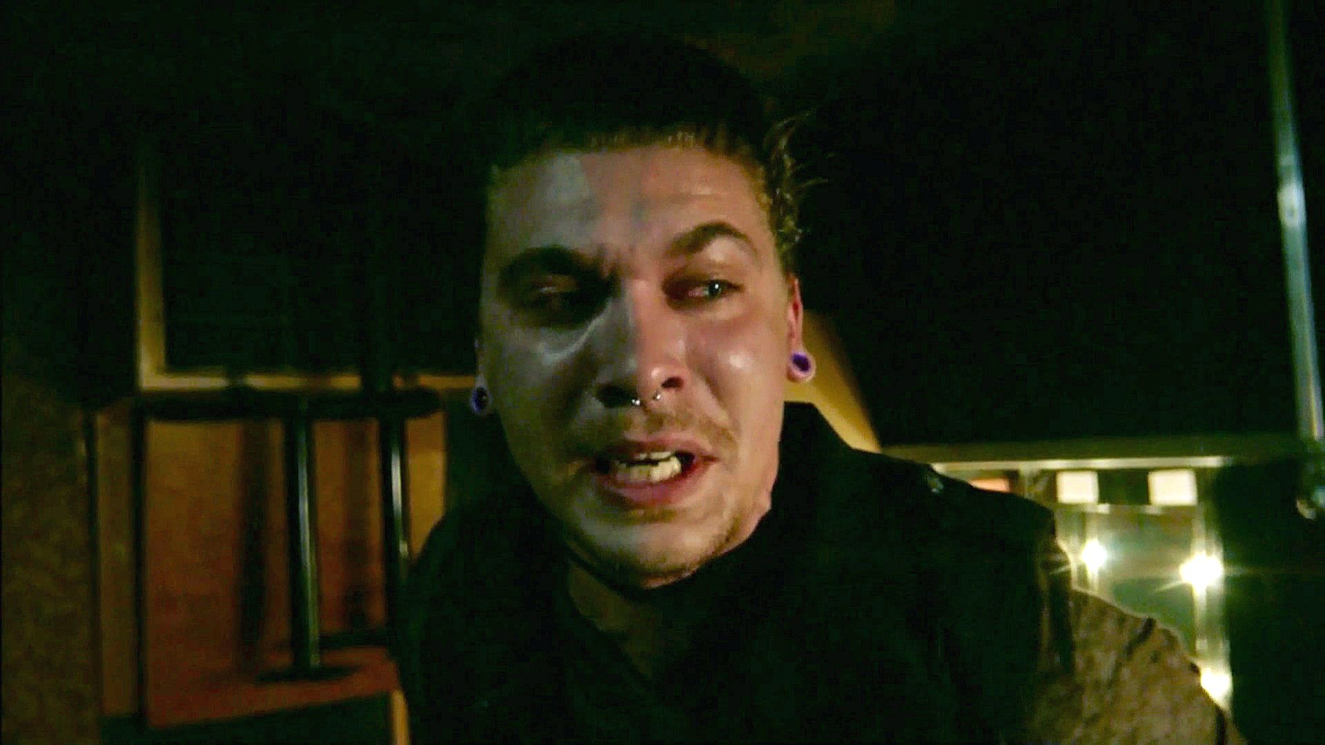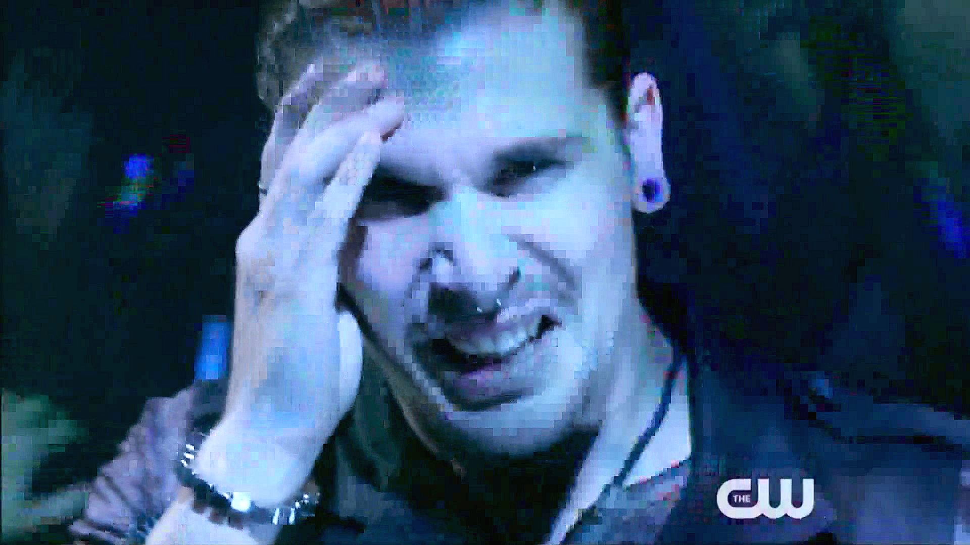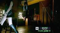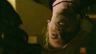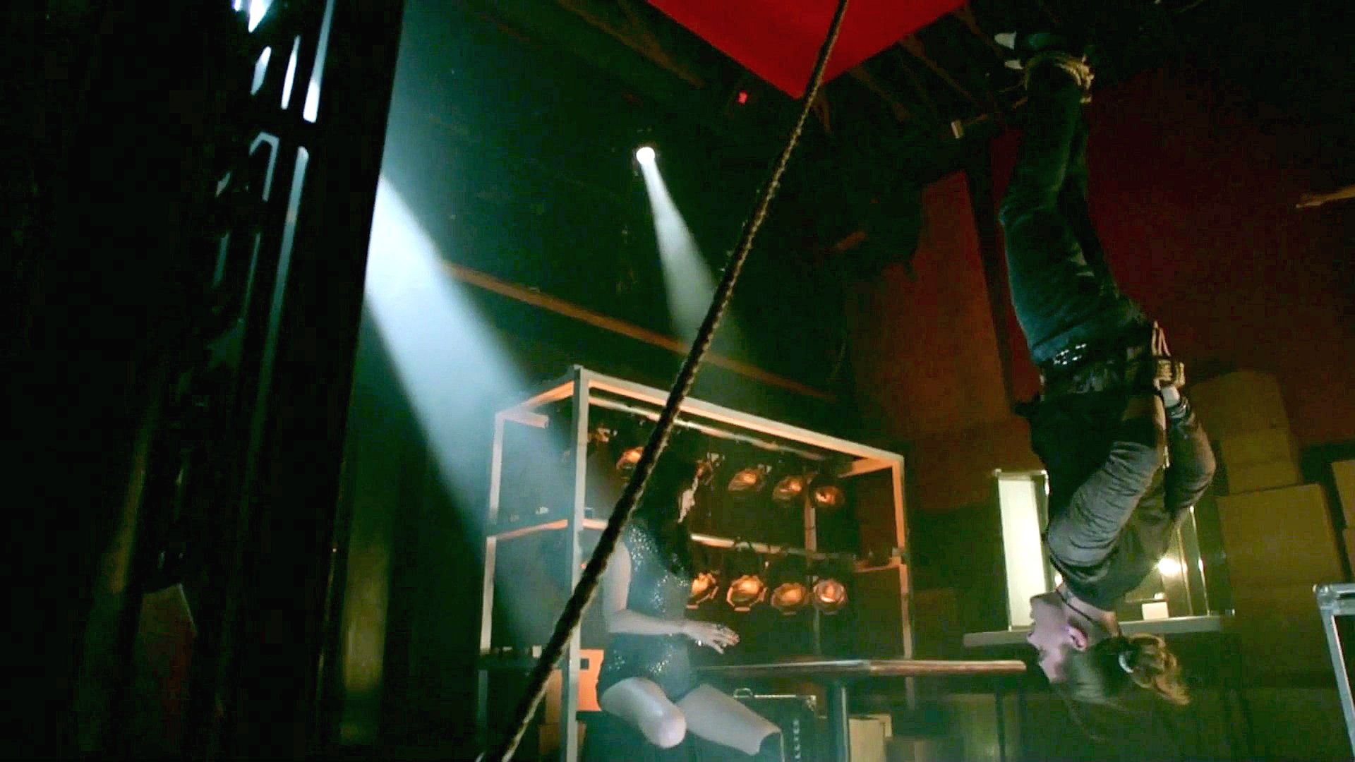 Koa has a guy tied up and hung upside down as she interrogates him about Abadon's leader.