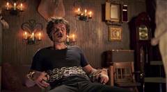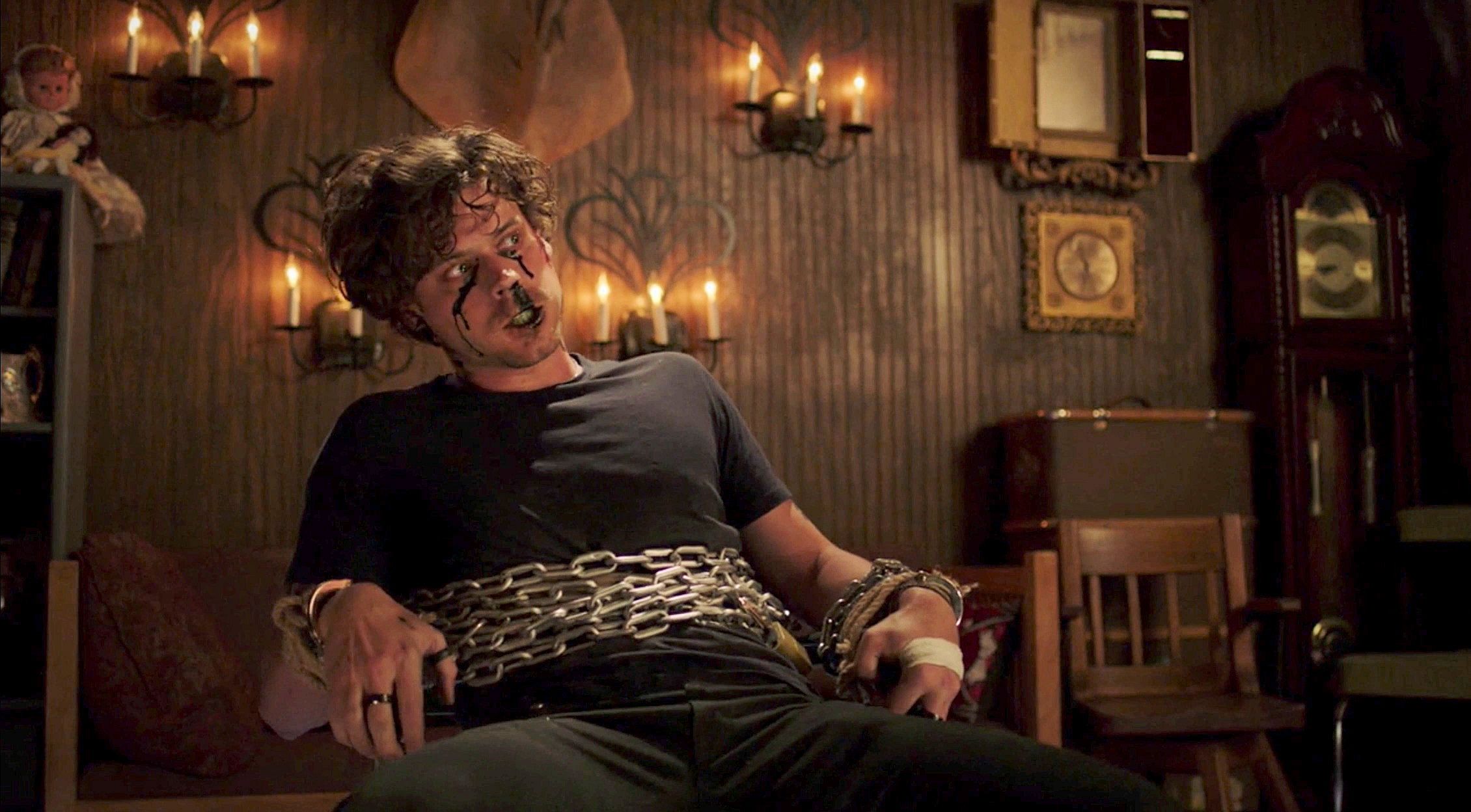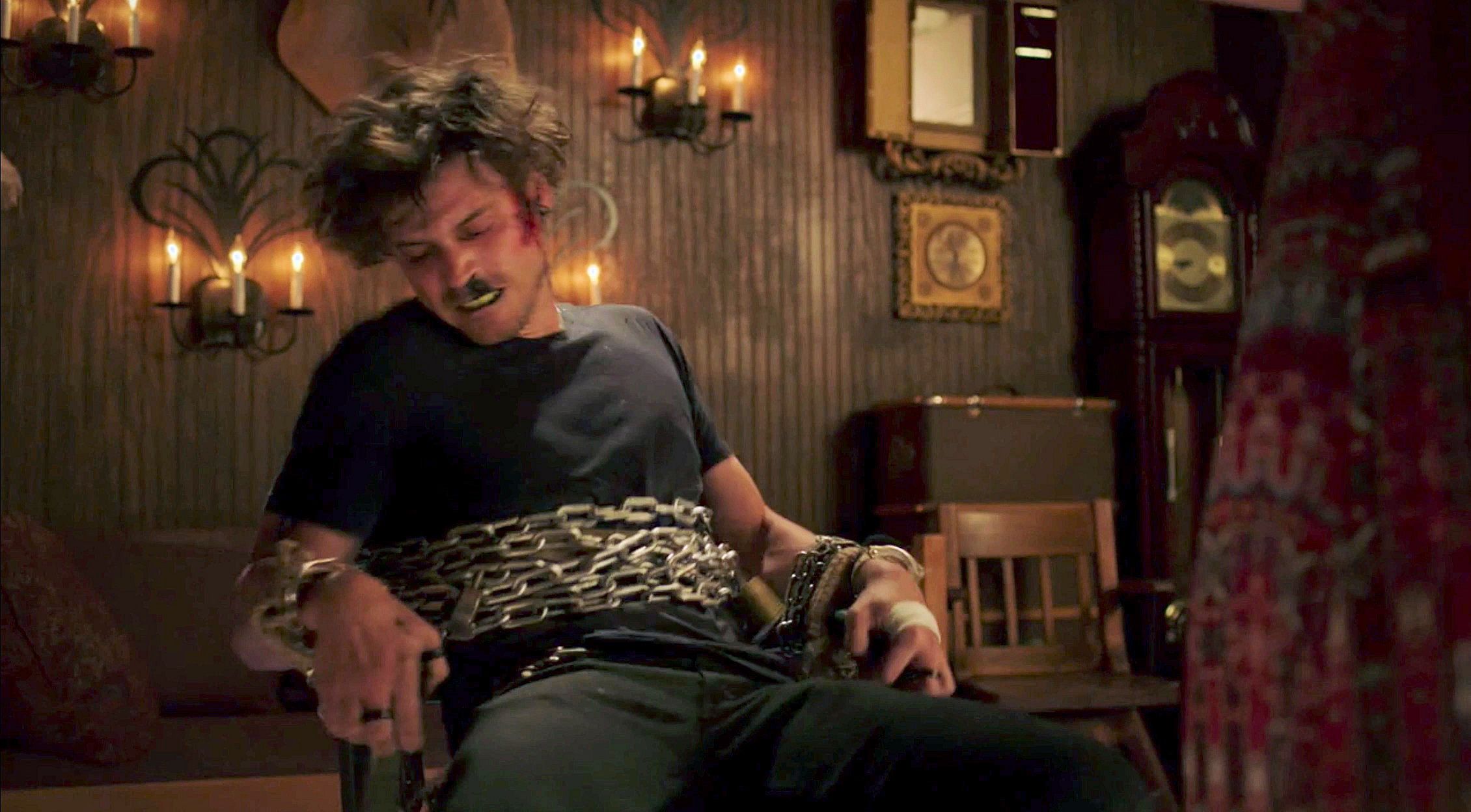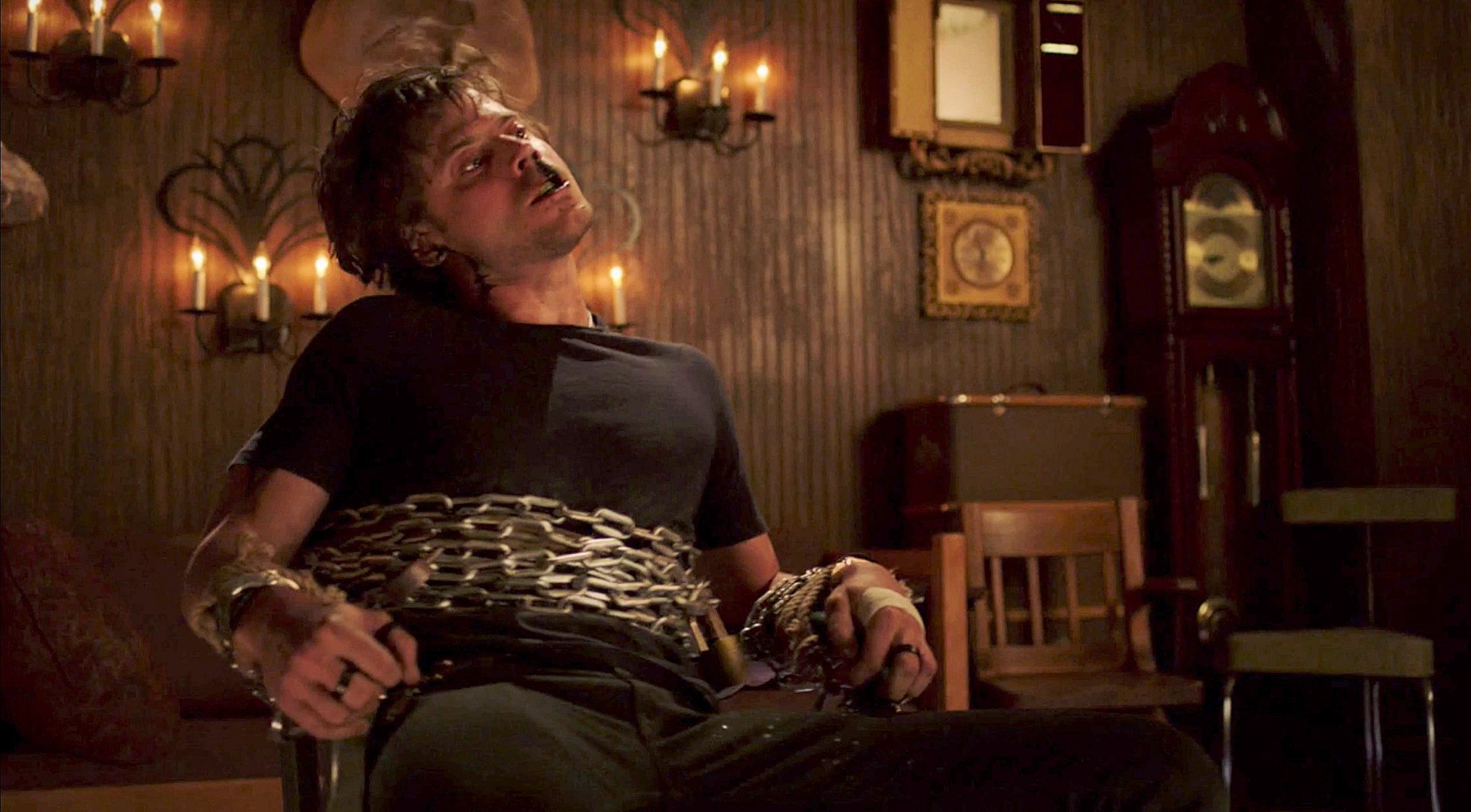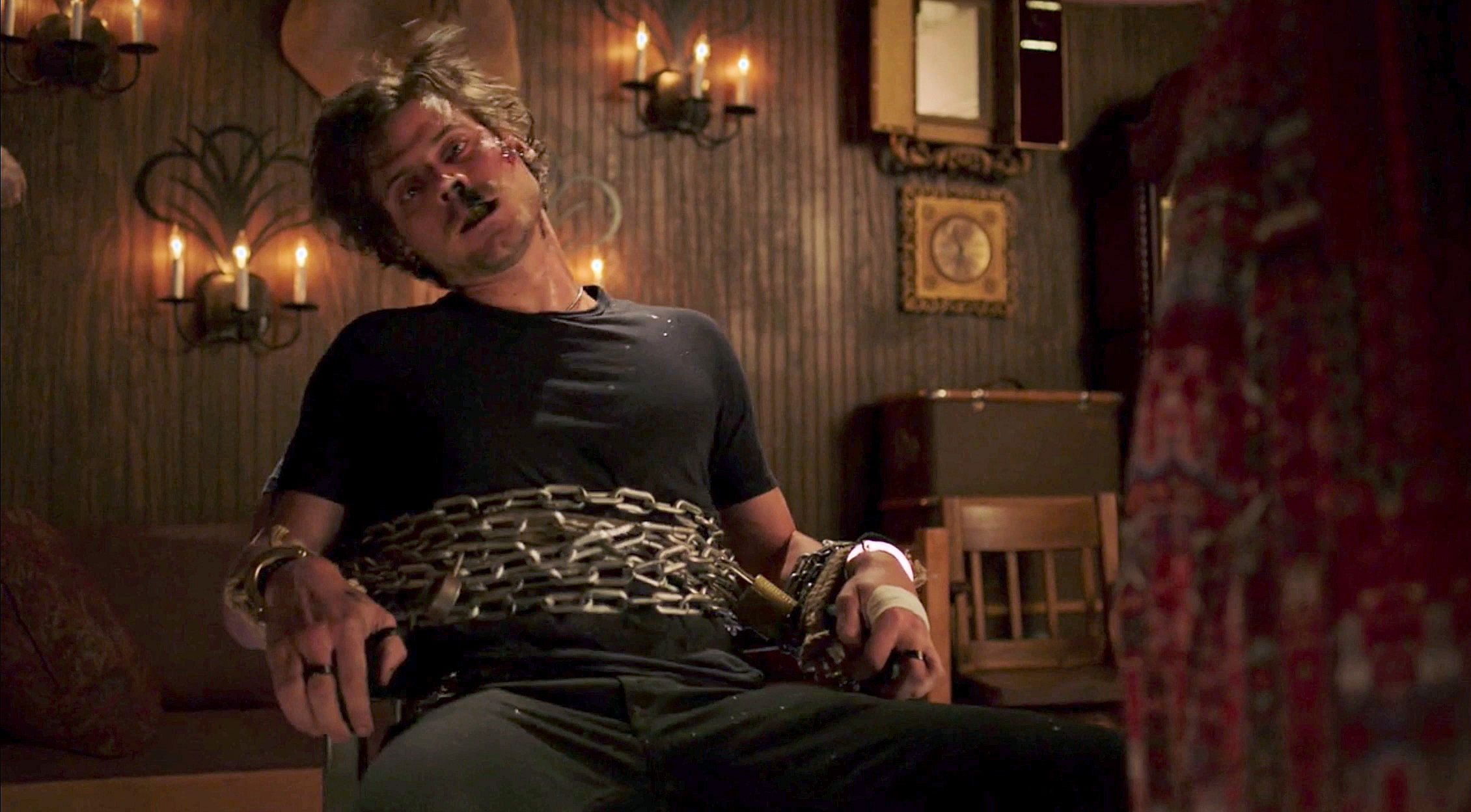 Manfred is possessed by demons and is tied to a chair.
